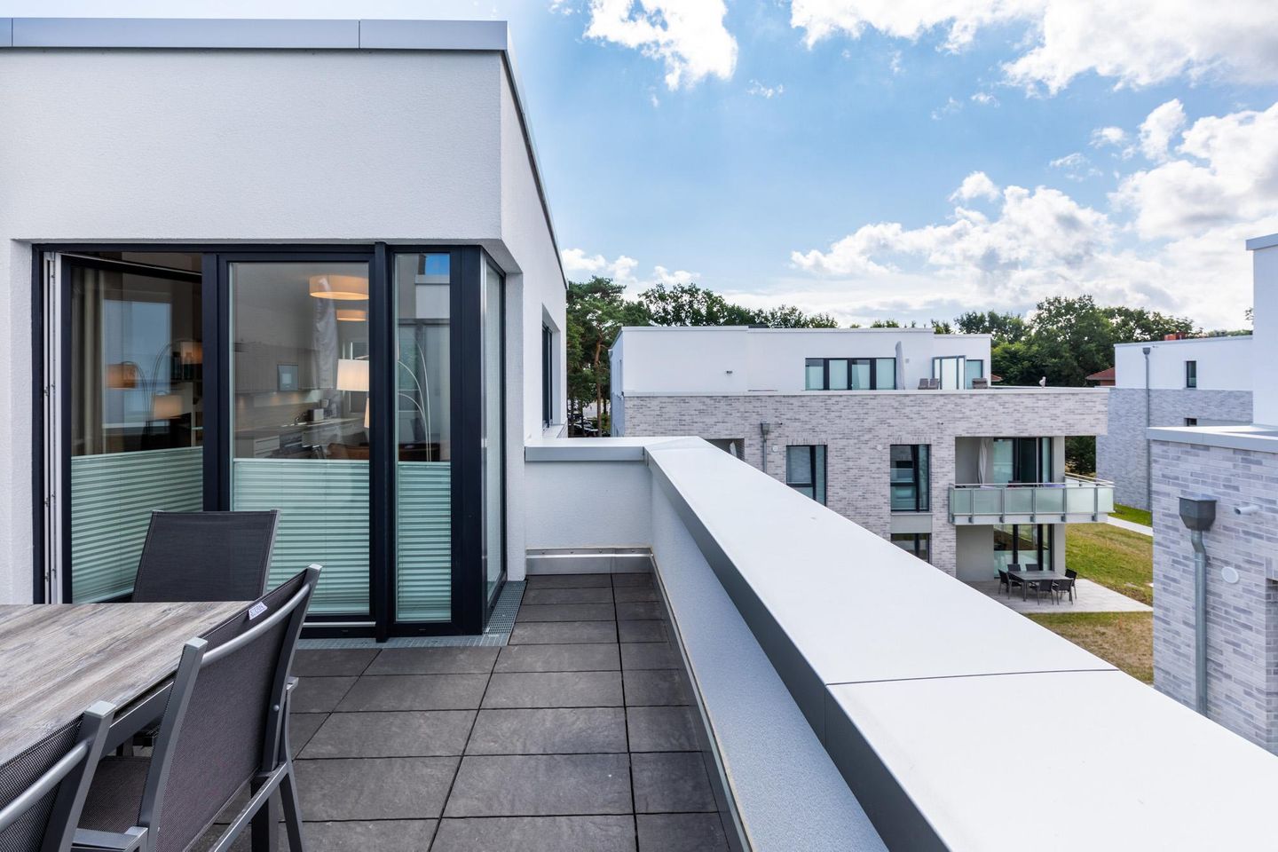 Freut euch auf geschmackvoll eingerichtete Nichtraucherapartments mit bodentiefen Fenstern, Fußbodenheizung und einer voll ausgestatteten, offenen Küche. Alle Wohnungen verfügen über kostenfreies WLAN sowie Balkon, Terrasse oder Dachterrasse. Die Apartments sind aufgeteilt auf fünf Apartmenthäuser mit Gründach.