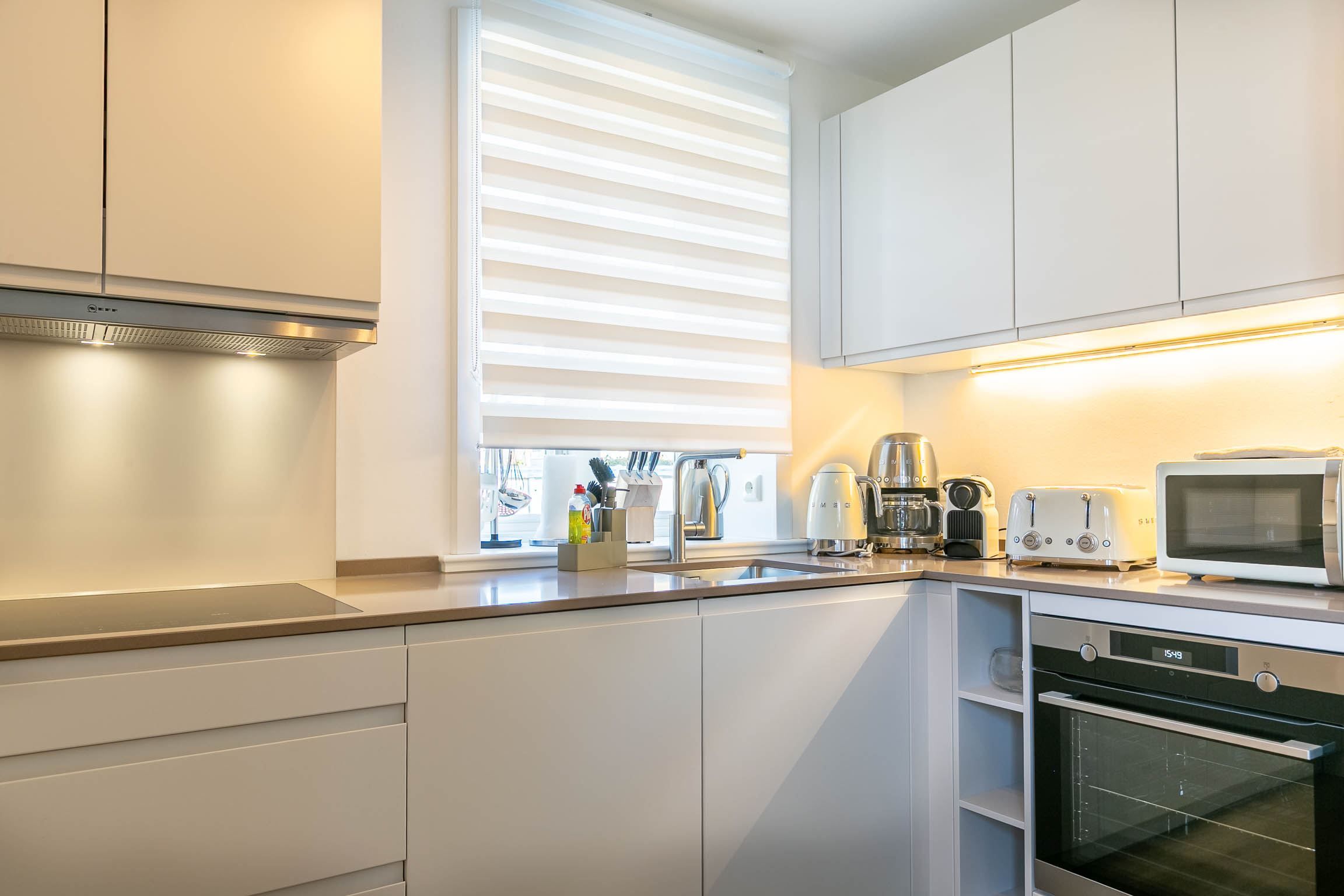 Offene Küche mit Backofen, Mikrowelle, Kühlschrank mit Gefrierfach, Geschirrspüler und Krups Nespresso Kapsel-Kaffeemaschine.