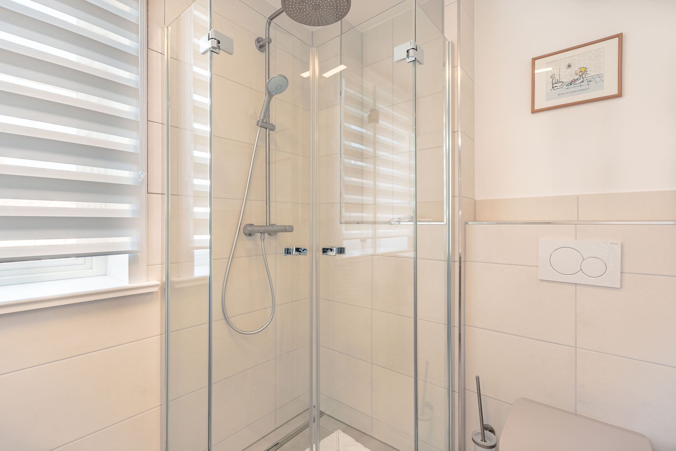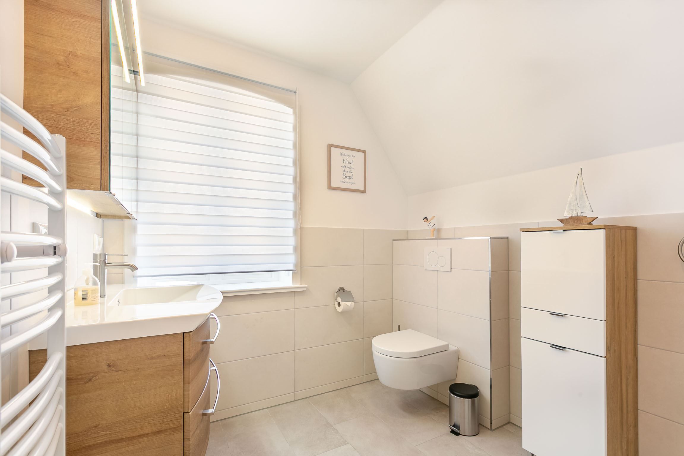 1. Bad (EG) mit ebenerdiger Regen-Dusche, WC, Handtuchwärmer und Tageslicht.