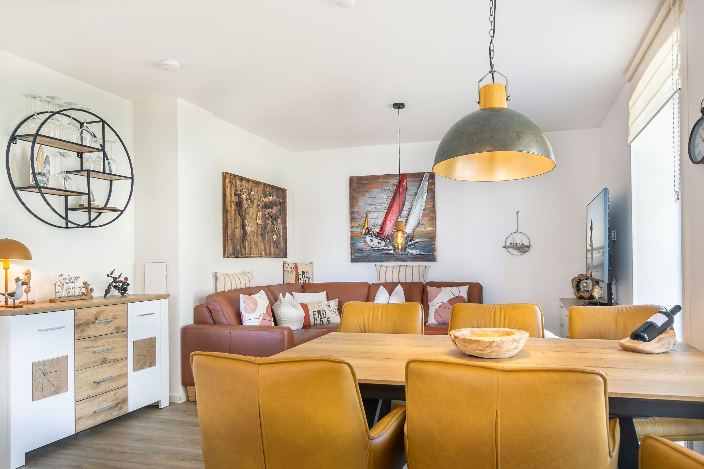 Wohnzimmer mit Lederecksofa, großem SMART-TV (Waipu), Esstisch mit 6 Stühlen und Austritt auf die West-Terrasse.