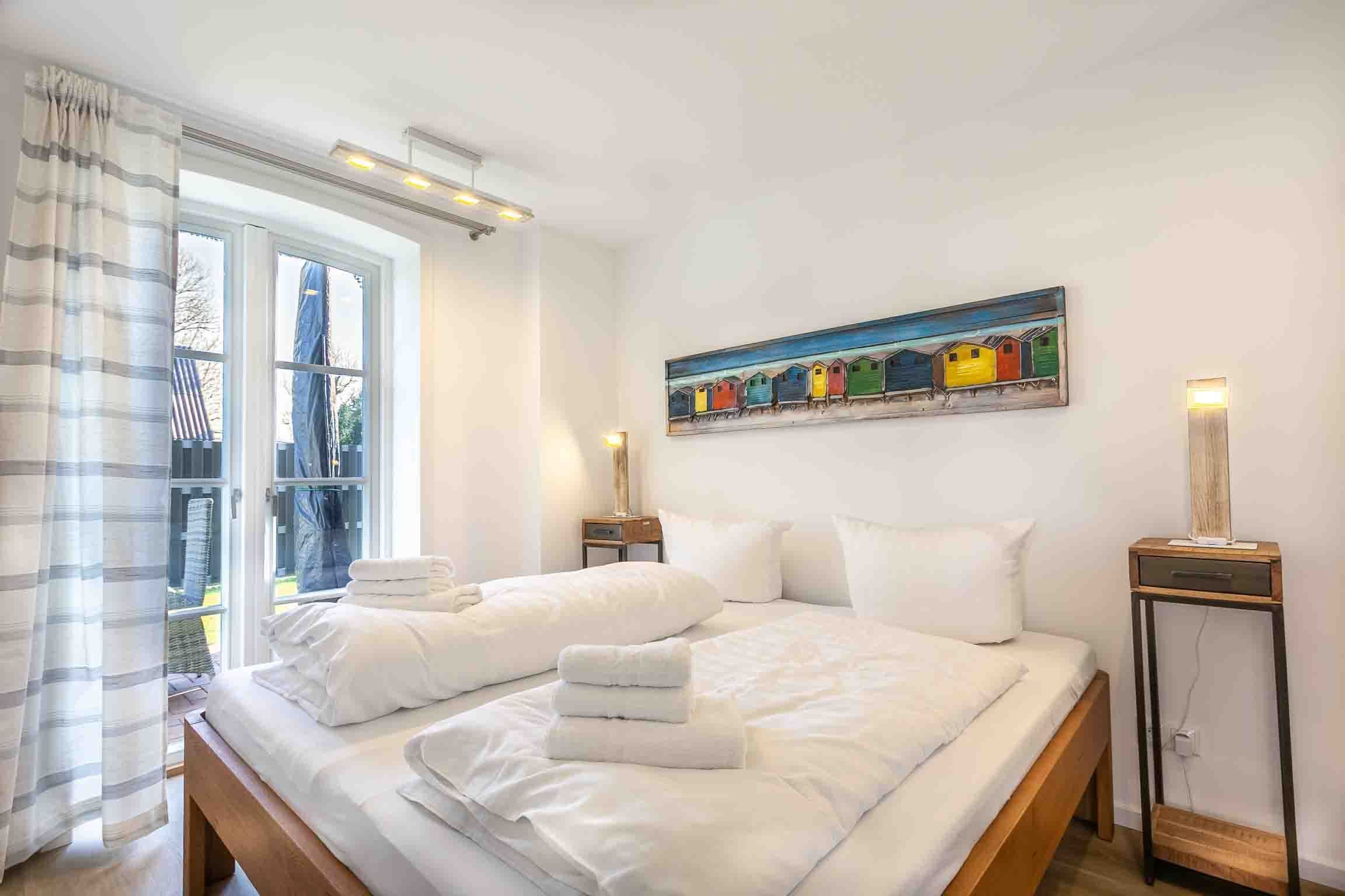 1. Schlafzimmer (EG) mit Doppelbett (2x 90x200cm), Kleiderschrank und Austritt zur Ost-Terrasse.