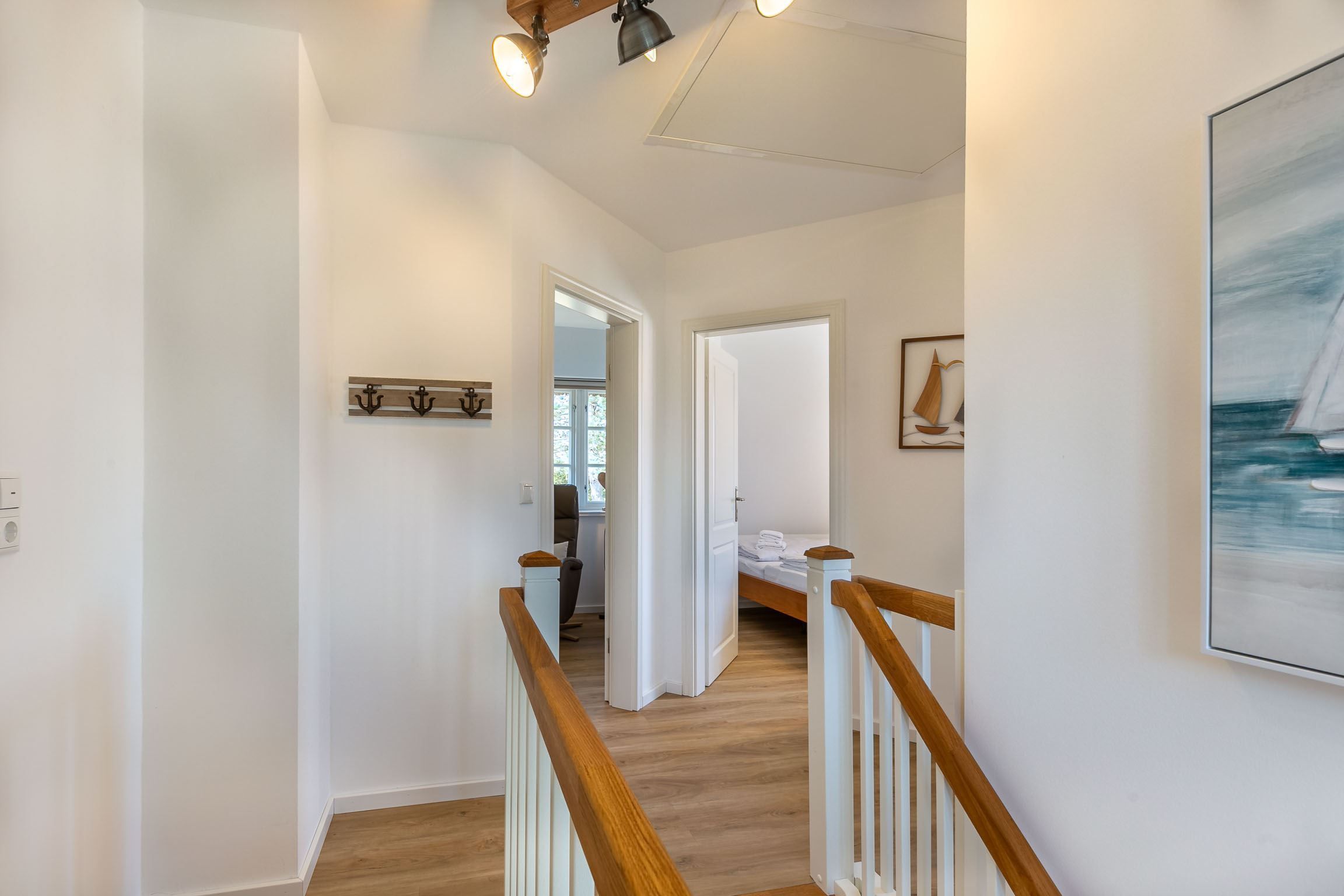 Flur mit Garderobe, Spiegel und Schuhablage im Eingangsbereich. Austritt zur Ost-Terrasse.