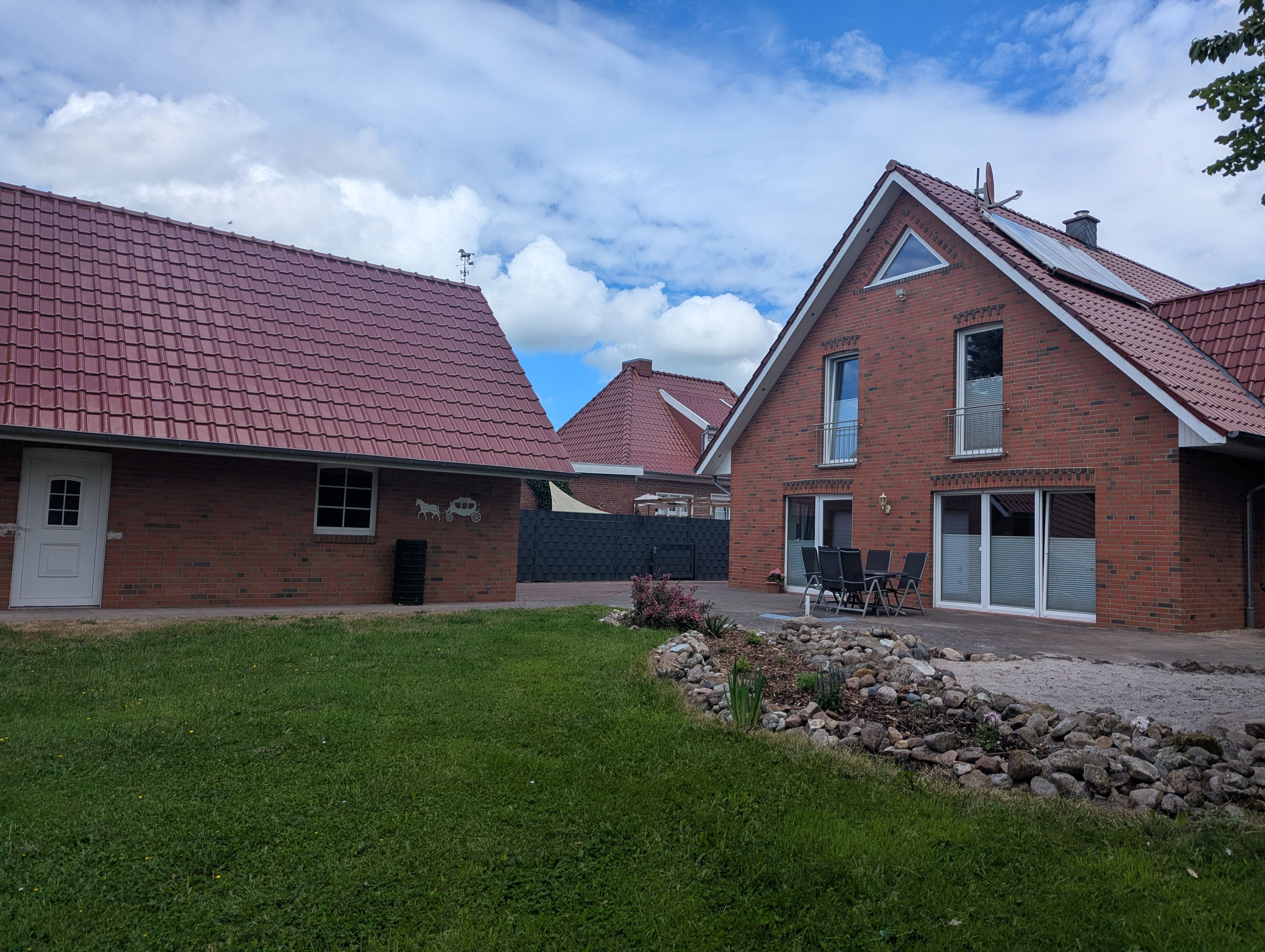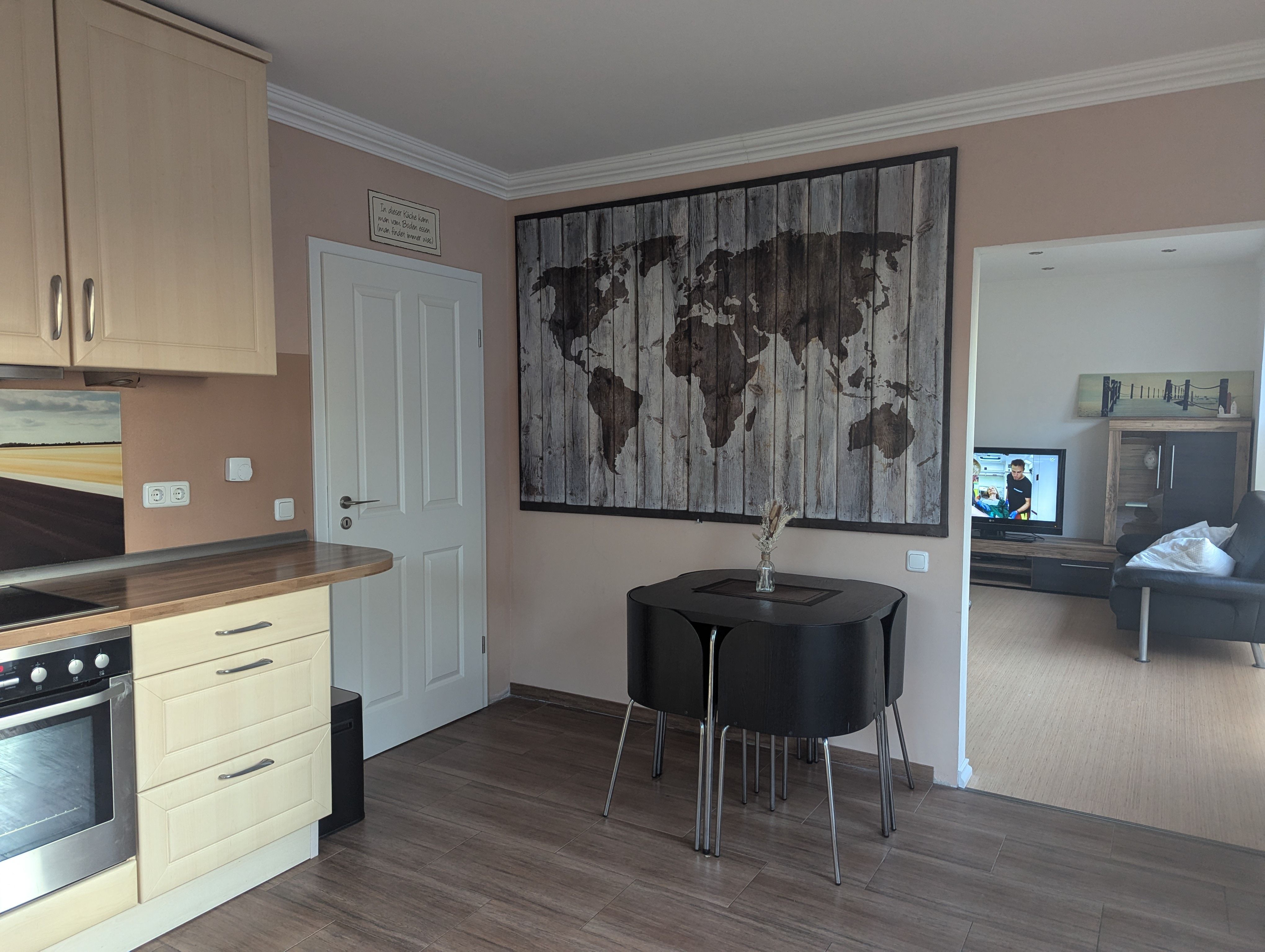 Die Wohnung befindet sich im Erdgeschoss, barrierefrei, mit begehbarer Dusche, die Türen sind 1,00 m breit, 1 Schlafzimmer mit 3 Betten (1 x Doppelbett und 1 x Einzelbett), Wohnzimmer, Kücke mit Essecke, Spülmaschine, Dusche/WC, Terrasse mit Gartenmöbeln, Grill, Garten, Waschmaschine vorhanden, Nichtraucher, kinderfreundlich, WLAN vorhanden, Parkplatz am Haus.