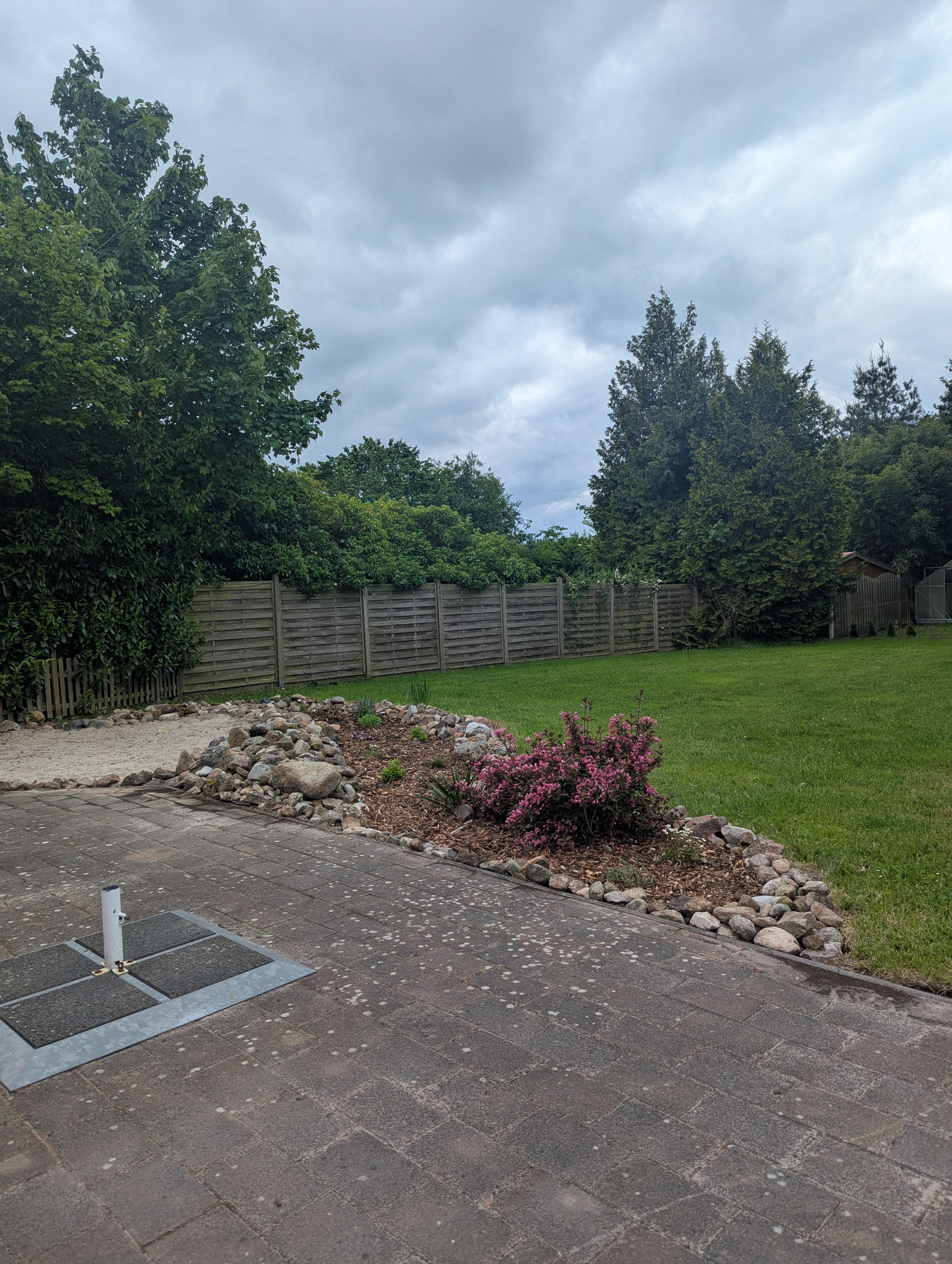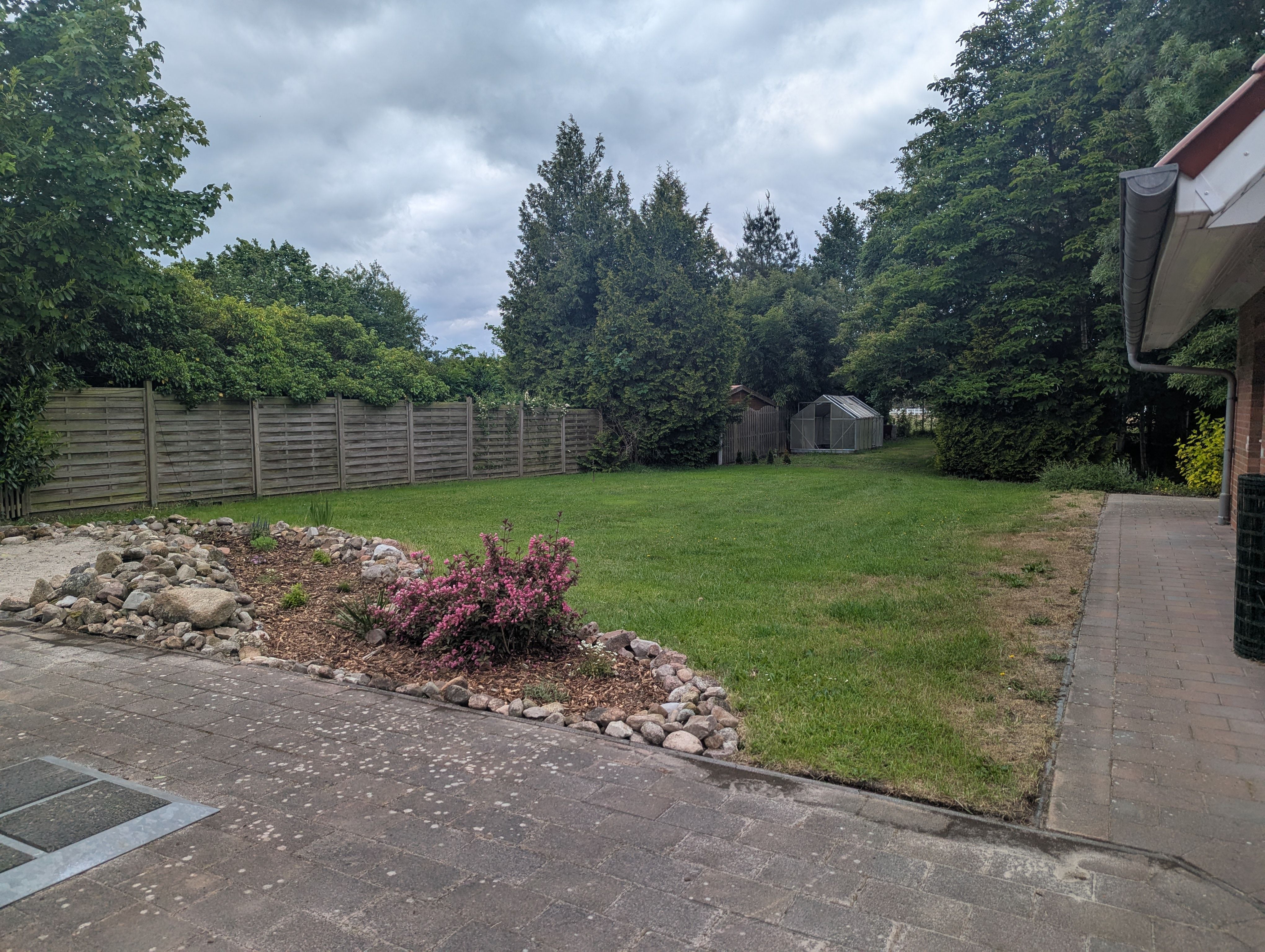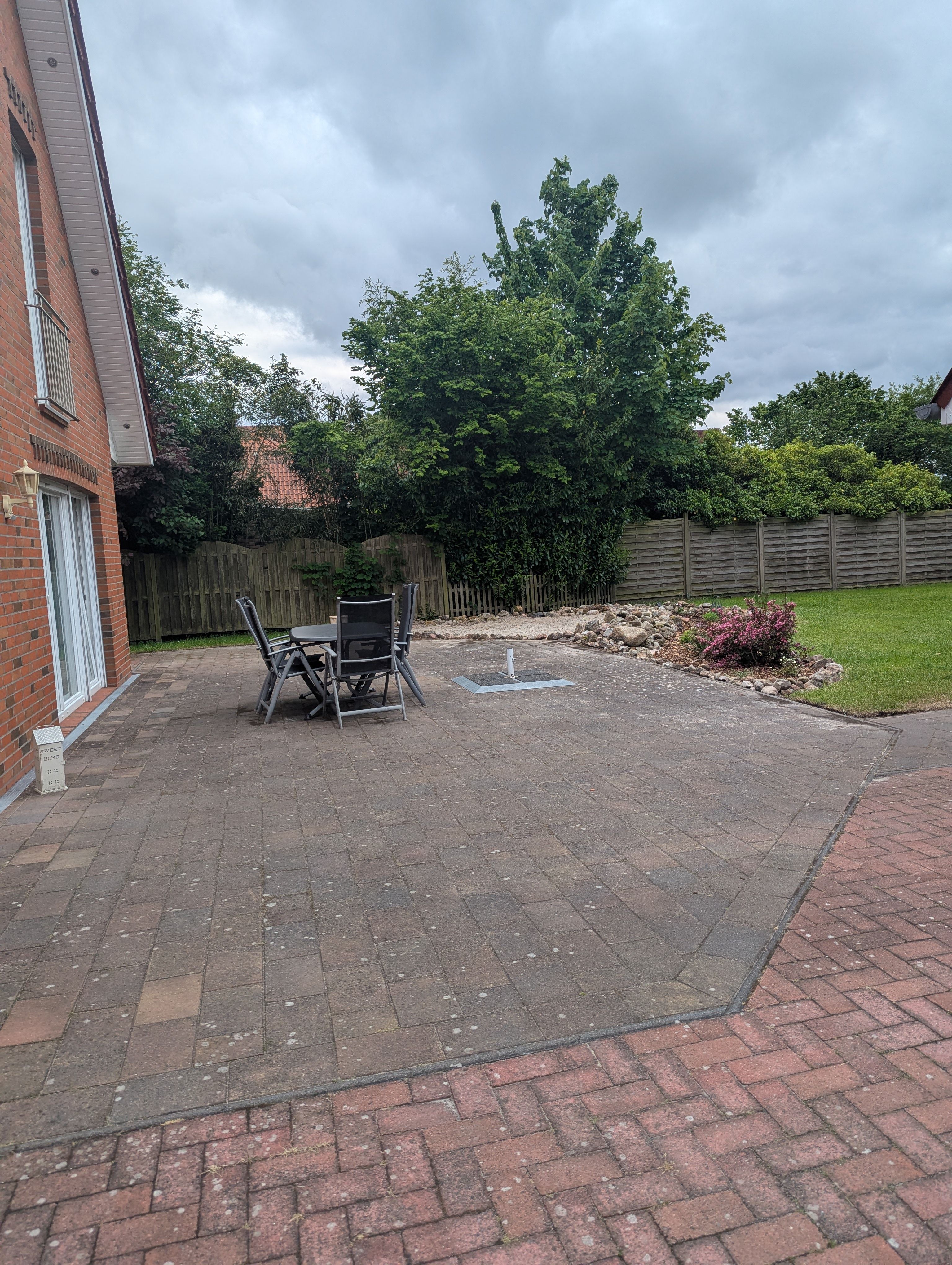Unsere Terrasse mit bereitstehenden Gartenmöbeln und Grill lädt zum Verweilen ein.
