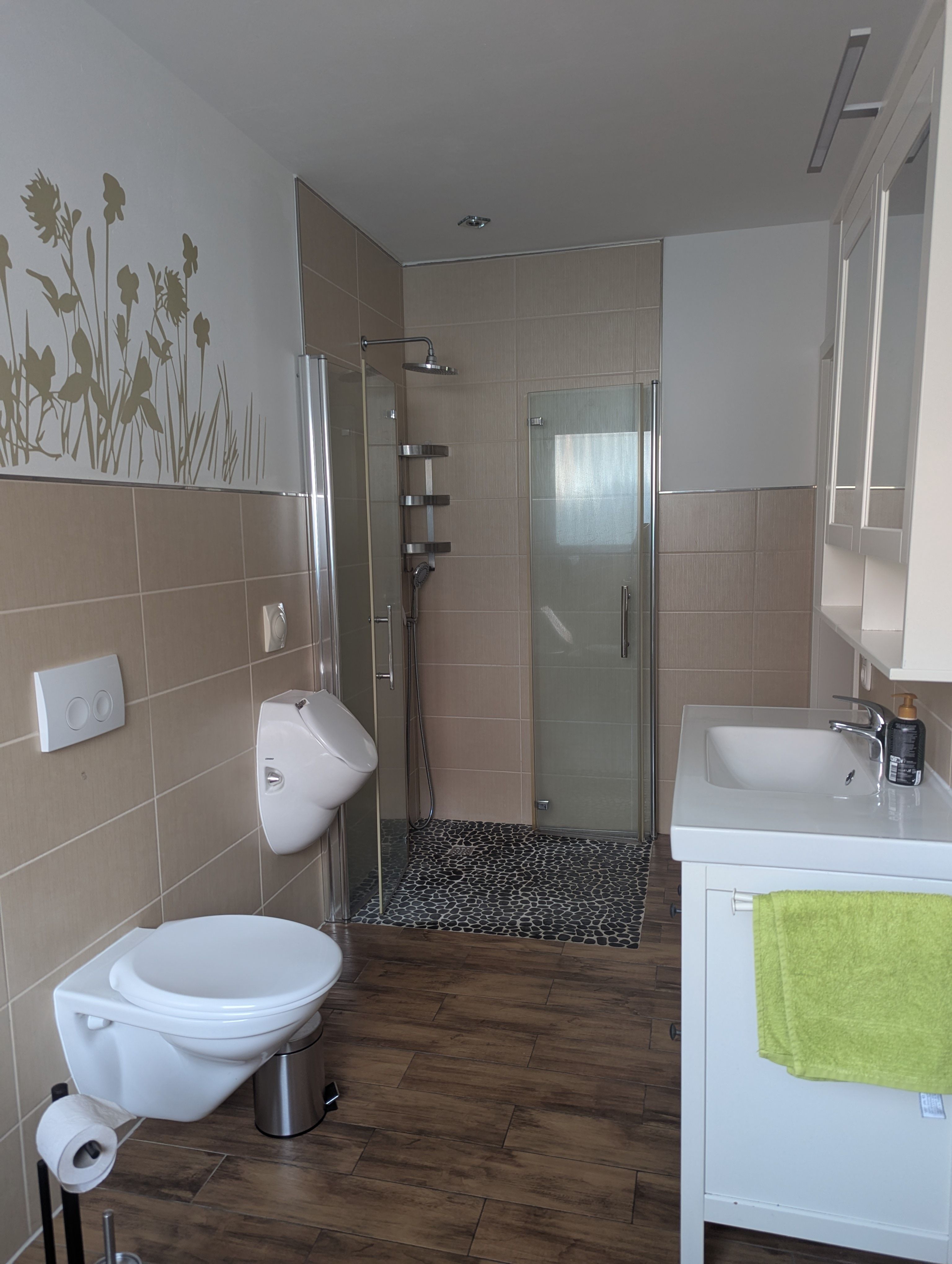 Im Bad finden Sie eine Dusche, WC und Urinal. Zusätzlich gibt es ein Gäste-WC.