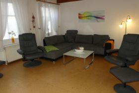 Direkt angrenzend lädt das behagliche Wohnzimmer zum Verweilen ein. Ob für einen Spieleabend, einen gemütlichen Fernsehabend oder einfach zum Ausruhen. Hier fühlt man sich sofort zuhause.