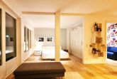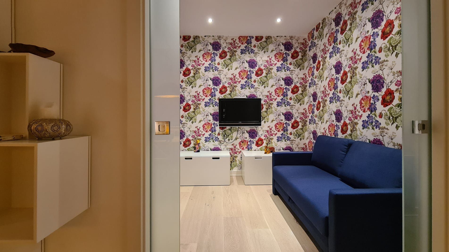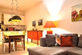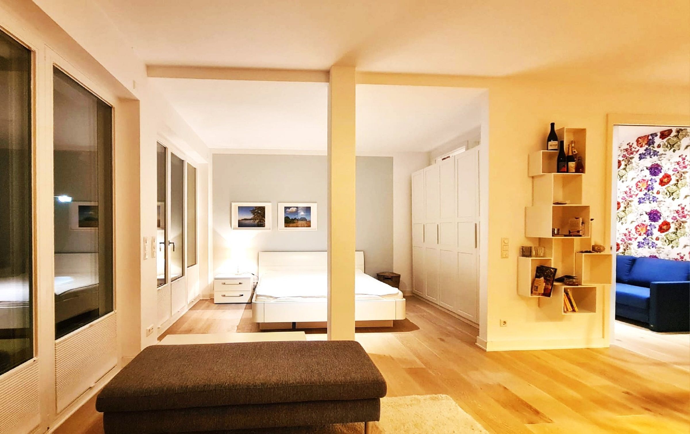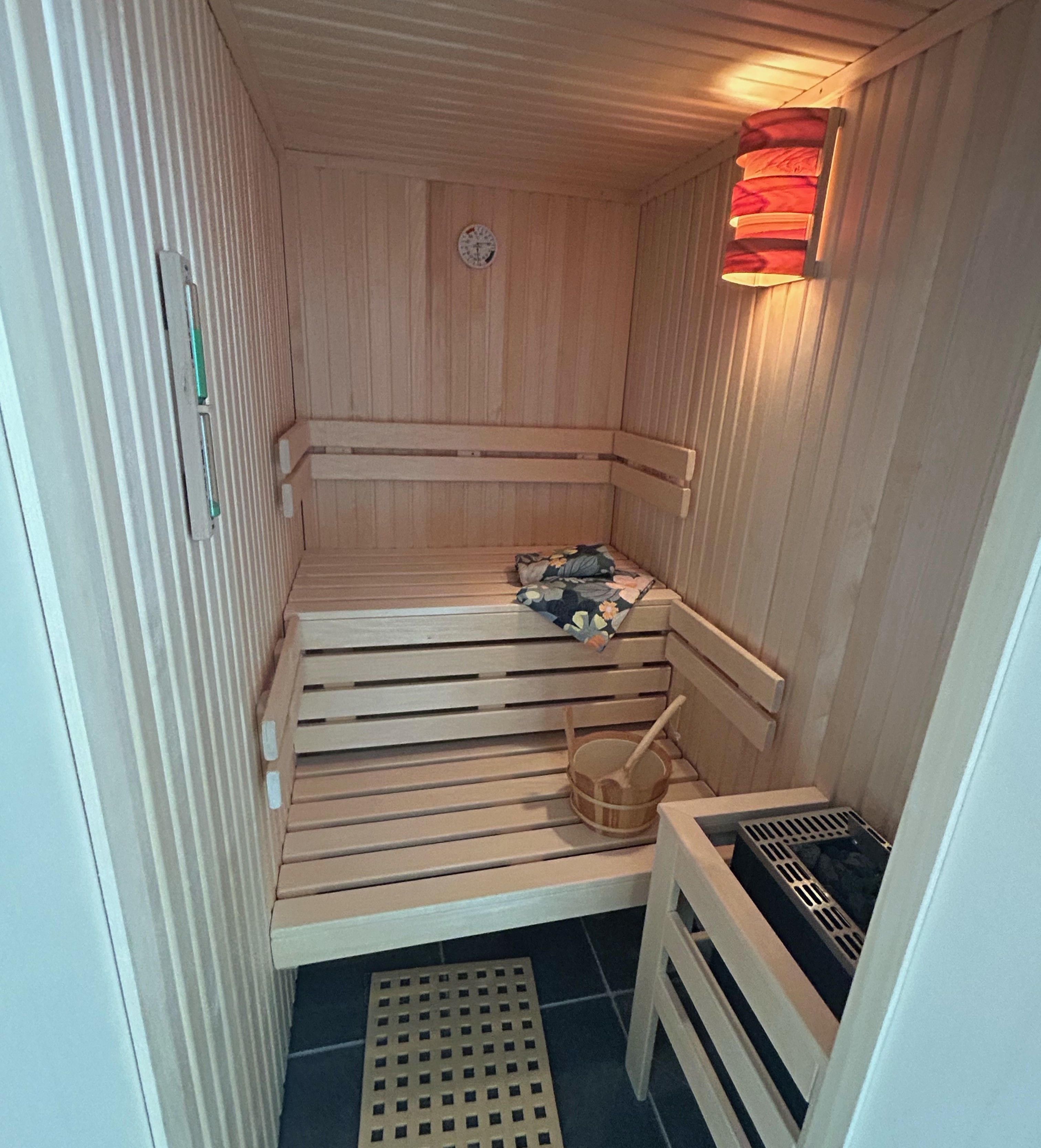 Die Wohnung besitzt ein offenes Schlafzimmer mit einem großen Doppelbett. Ein innen liegendes weiteres Schlafzimmer bietet eine Schlafcouch. Es stehen zwei Bäder und außerdem eine Sauna zur Verfügung. Die in den Wohnbereich integrierte Küche hat alle erforderlichen Annehmlichkeiten.
