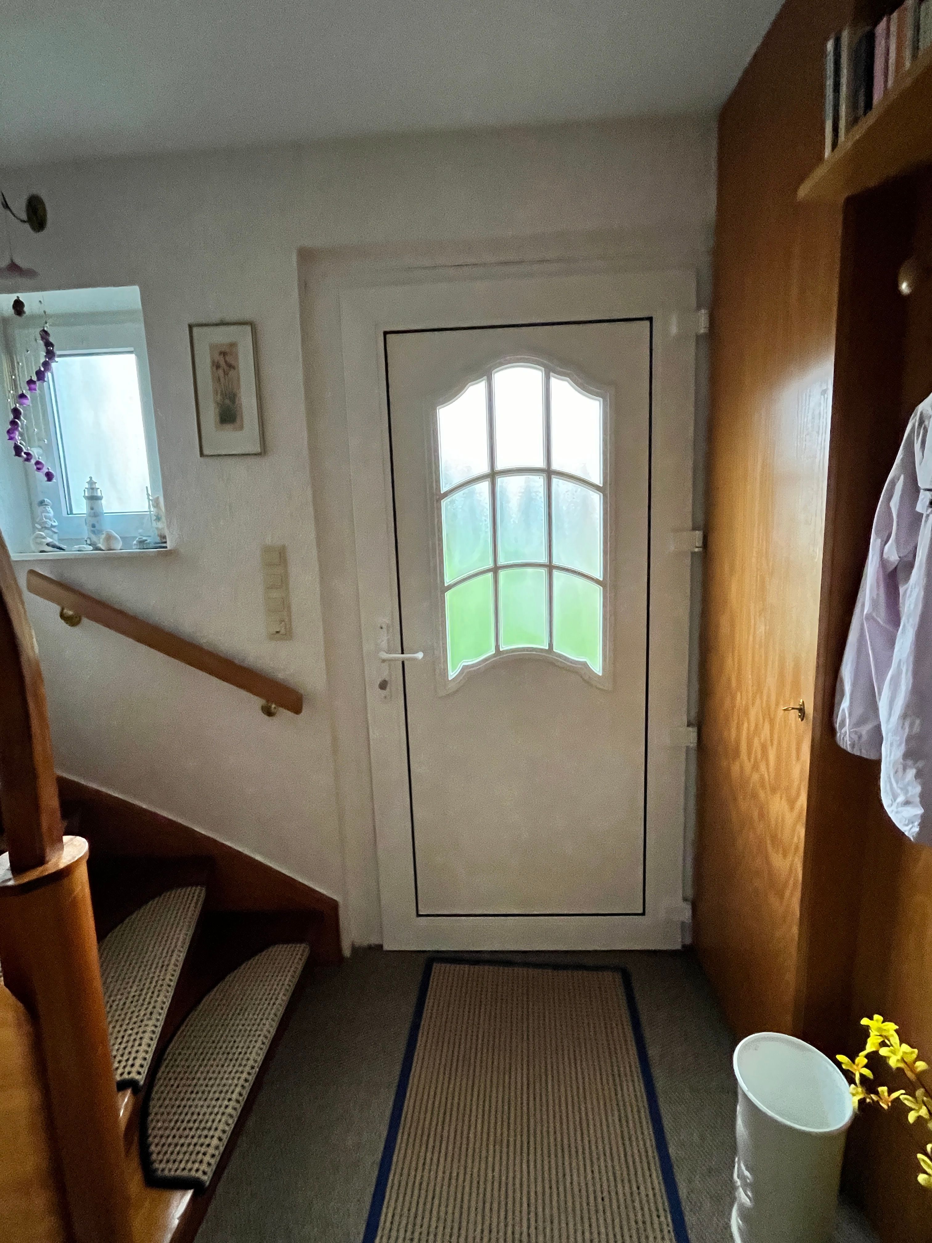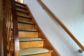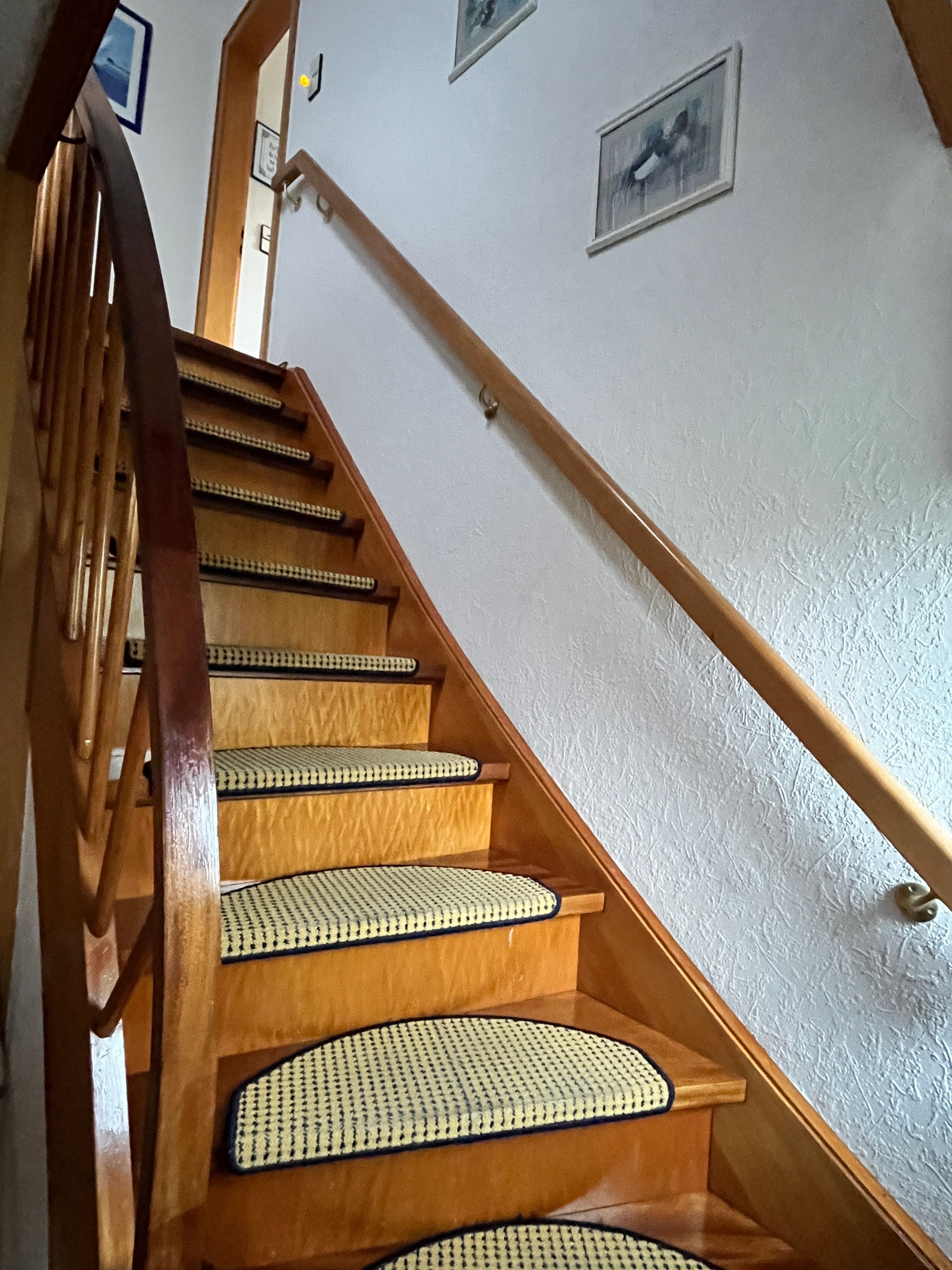 Der Eingang hat 2 Stufen von ca. 20 cm. Eine Holztreppe führt dann in