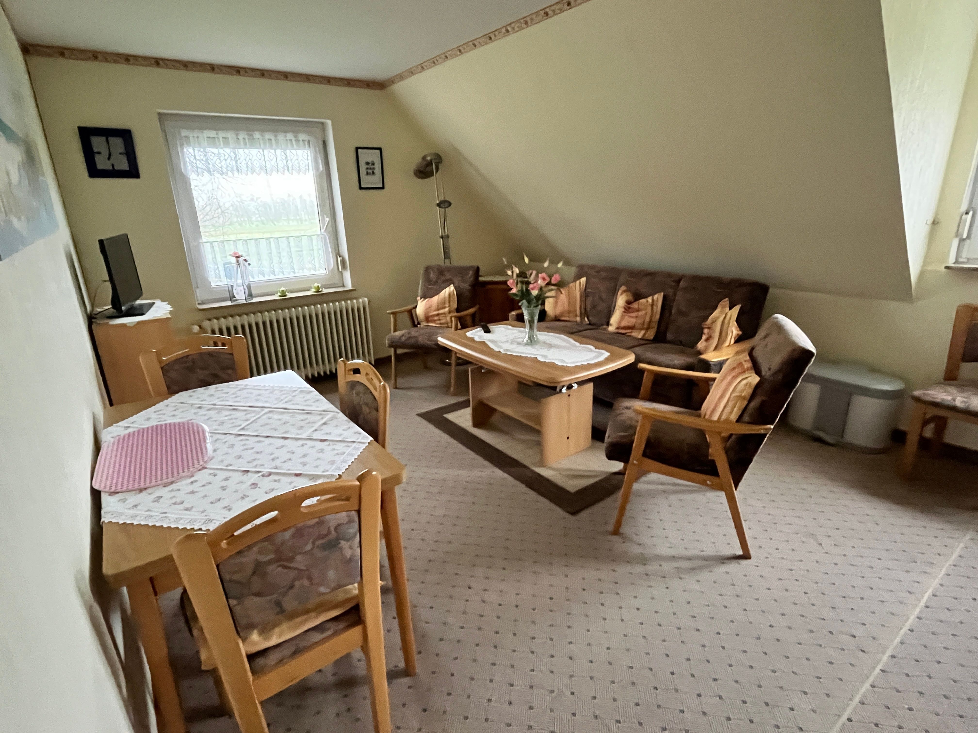 Es ist Teppichboden im Wohnzimmer, Flur und Esszimmer.