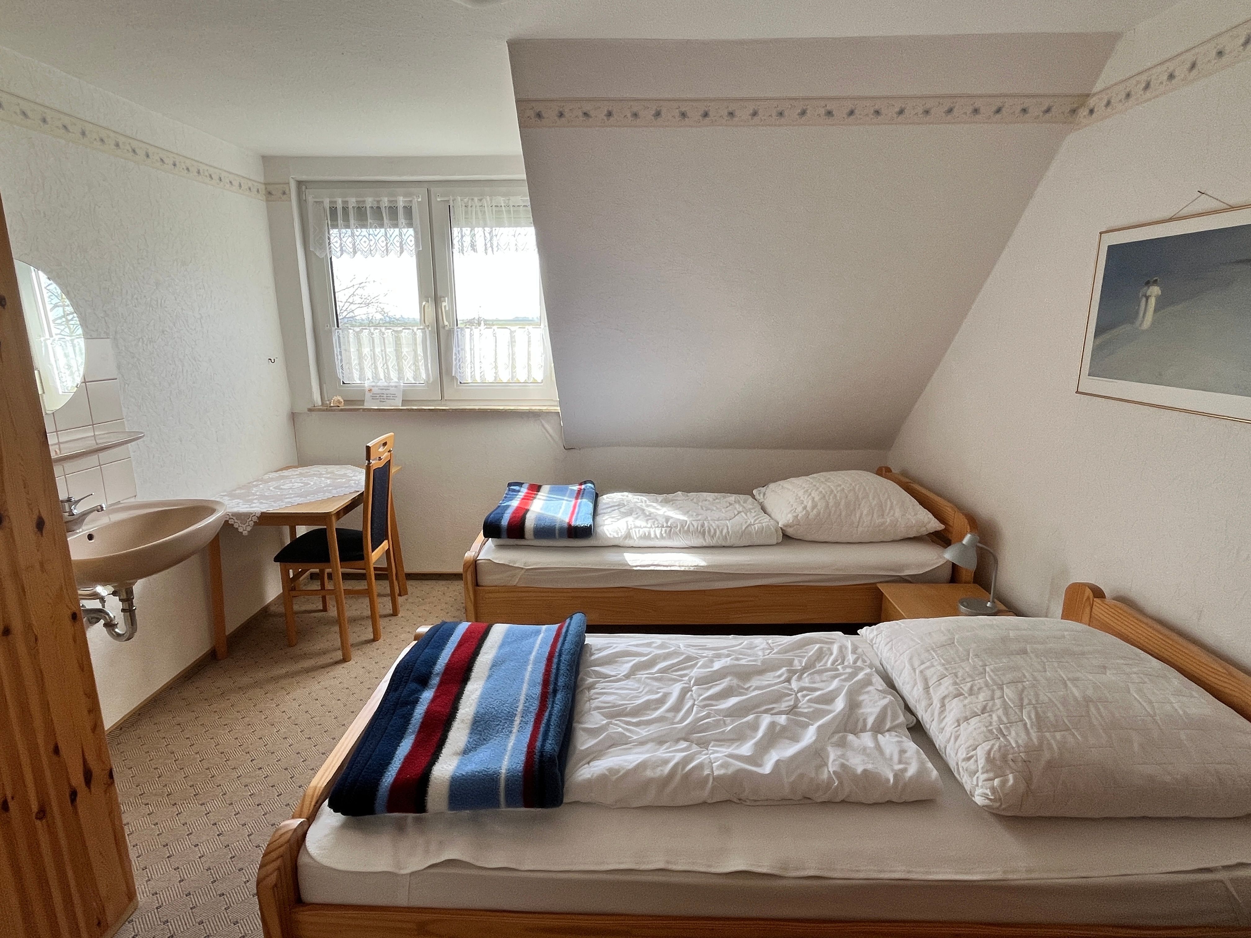 2 x Einzelbetten (2 x 90 x 200 cm), können als Doppelbett zusammen geschoben werden