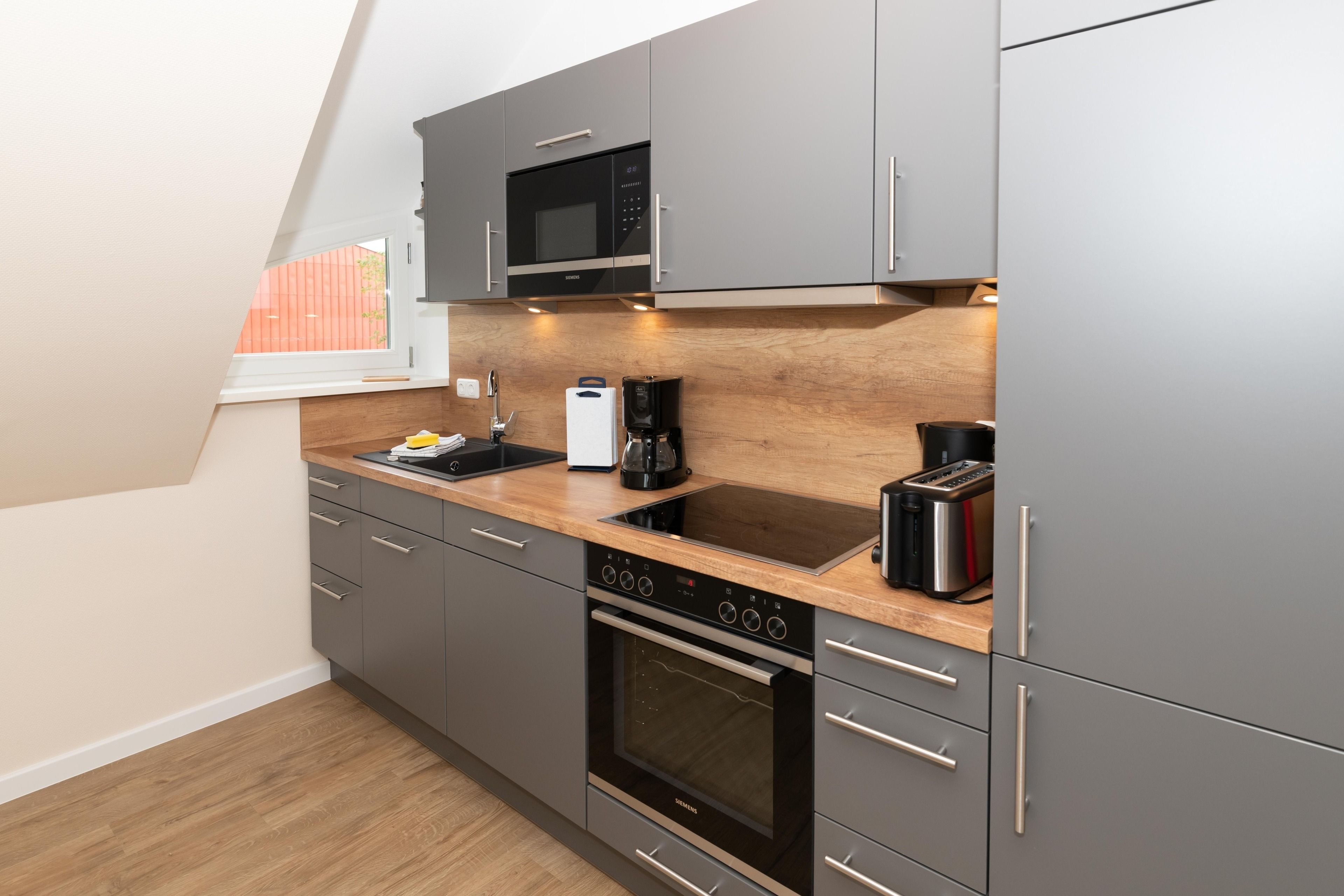 Sie hat eine zum Wohnraum offene, voll eingerichtete Küchenzeile, ein Schlafzimmer mit Boxspringbett und ein Bad mit „Walk-in-Dusche“.
