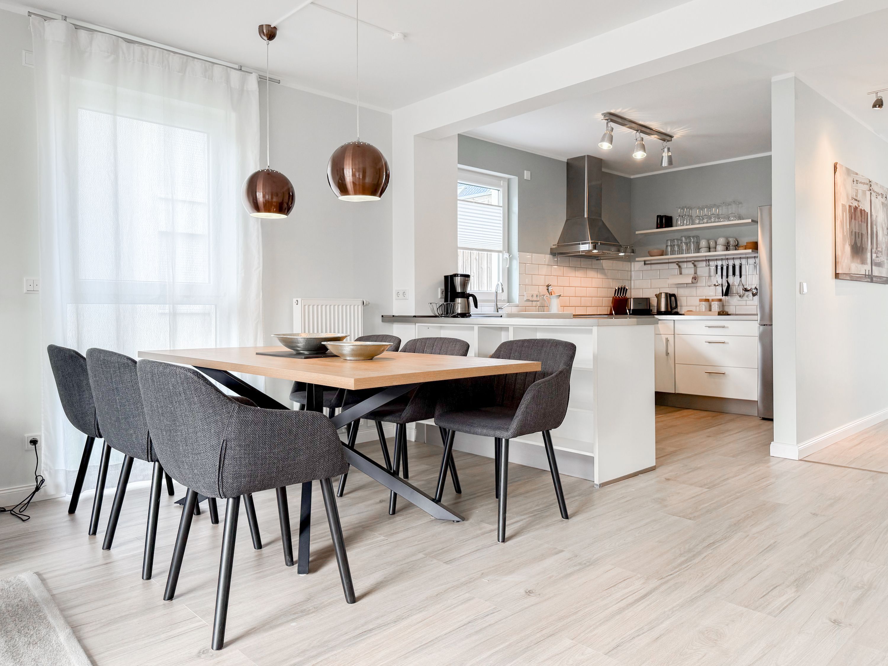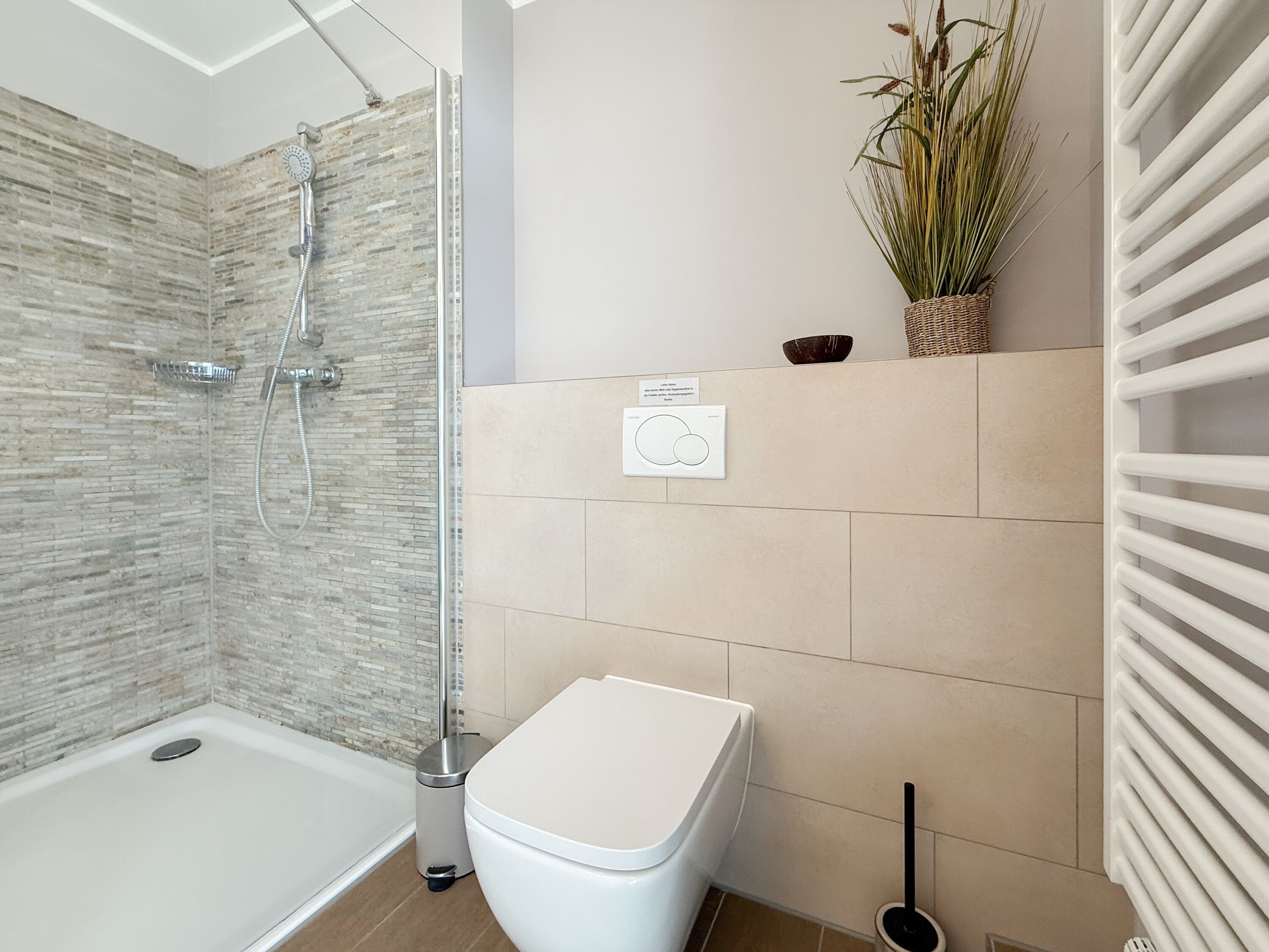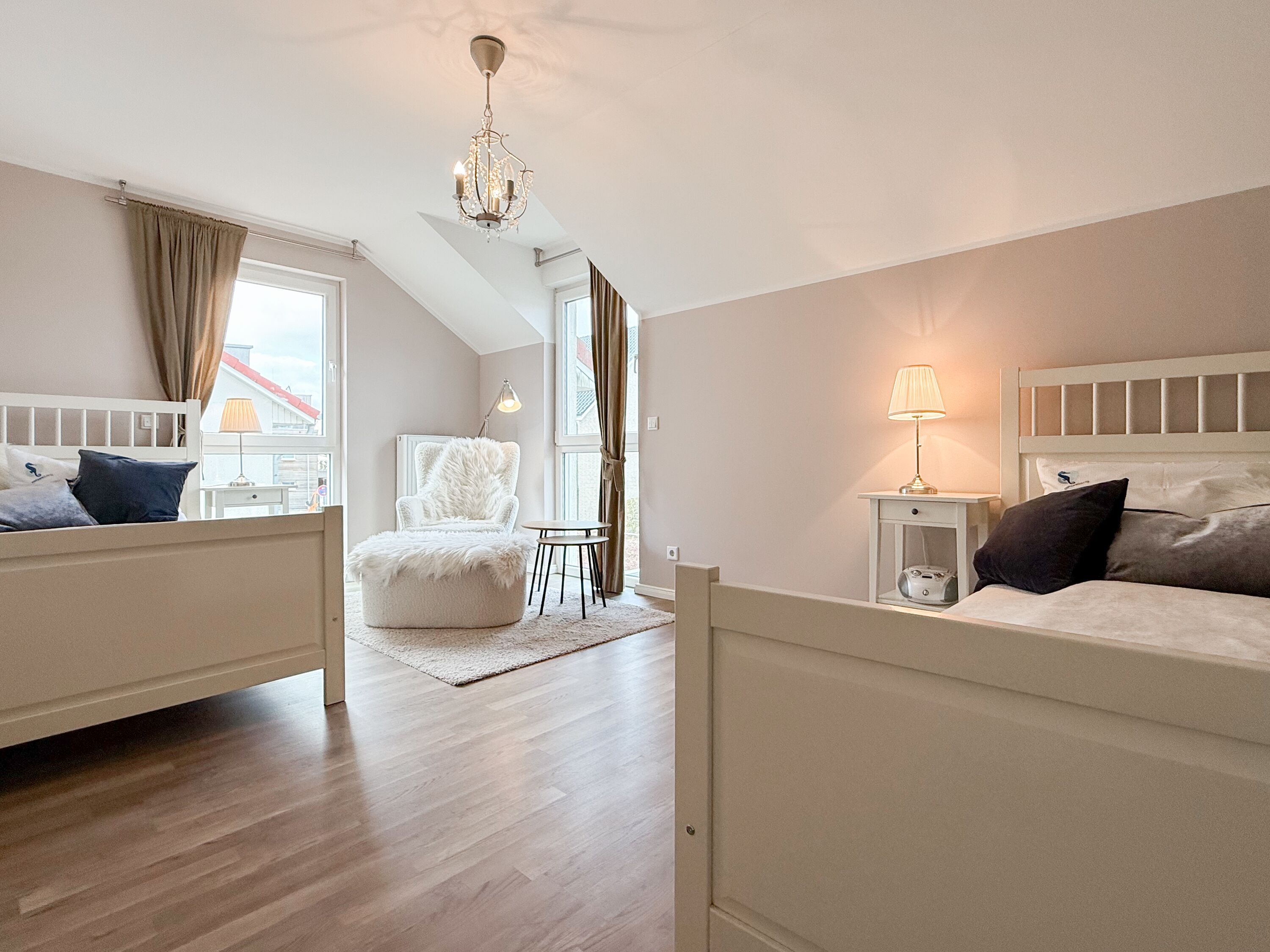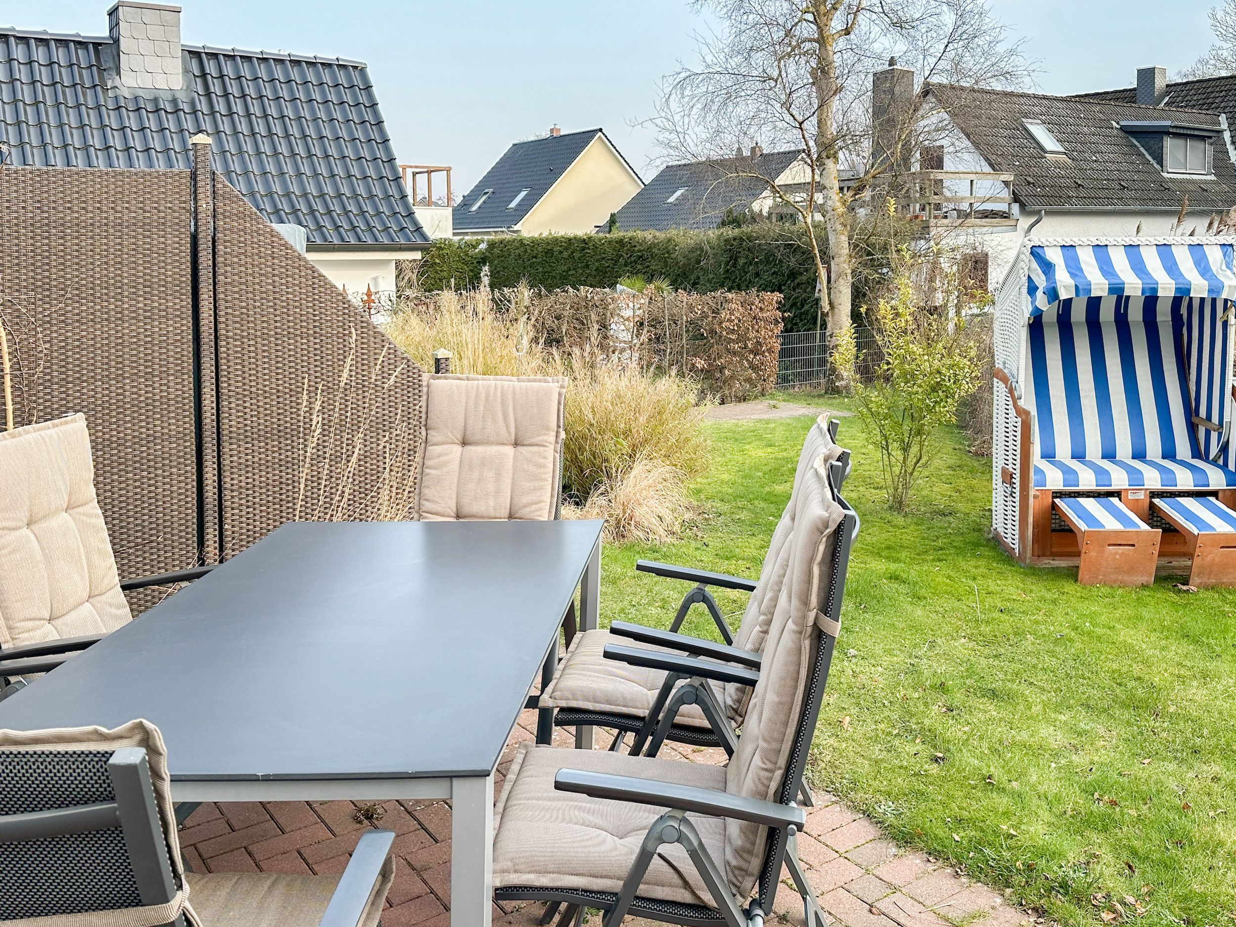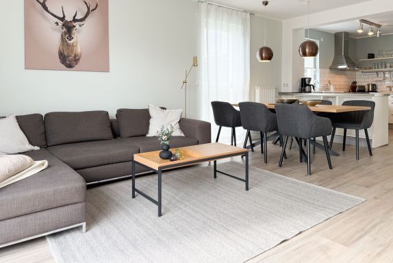 Es erwartet Sie ein tolles Doppelhaus mit 3 separaten Schlafzimmern und 2 Duschbädern. Sonnige Räumlichkeiten auf über 100 qm Wohnfläche und die geschmackvolle Einrichtung mit liebevollen Details schaffen ein behagliches Ambiente für 6 Personen. Im Erdgeschoss erwartet Sie ein großzügiger Wohnbereich, der mit einem gemütlichen Ecksofa und TV eingerichtet ist. Die vorgelagerte Sonnenterrasse in Südausrichtung garantiert erholsame Urlaubszeit. Die großzügige Einbauküche ist bestens ausgestattet und lädt zum gemeinsamen Kochen ein. Der anschließende Essbereich, mit großem Esstisch und gemütlichen Sesseln, bietet ausreichend Platz für gemeinsame Mahlzeiten und geselliges Beisammensein. Im Eingangsbereich befindet sich eine Garderobe und ein neuwertiges Tageslichtbad mit Dusche, Waschbecken und WC. Eine Waschmaschine ist im separaten Abstellraum untergebracht, ebenfalls im Erdgeschoss. Im Obergeschoss befindet sich ein weiteres Duschbad mit Doppelwaschtisch und Fenster sowie 2 separate Schlafzimmer. Schlafzimmer 1 ist äußerst großzügig und mit einem Doppelbett, einer Sitzecke mit TV und einem Schreibtisch für das Home Office eingerichtet. Schlafzimmer 2 verfügt über 2 Einzelbetten und einen gemütlichen Relaxsessel. Im Dachgeschoss befindet sich das 3. Schlafzimmer mit einem Doppelbett (180x200), Kleiderschrank und Sessel. Die Dachflächenfenster lassen sich über ein Rollo verdunkeln, alle anderen Fenster des Hauses sind mit elektrischen Außenjalousien versehen. WLAN steht selbstverständlich kostenlos zur Verfügung. Vor dem Haus befinden sich zwei Parkplätze. (1 Carport und 1 Außenstellplatz). Fahrräder können sicher und trocken im Schuppen am Haus untergestellt werden.