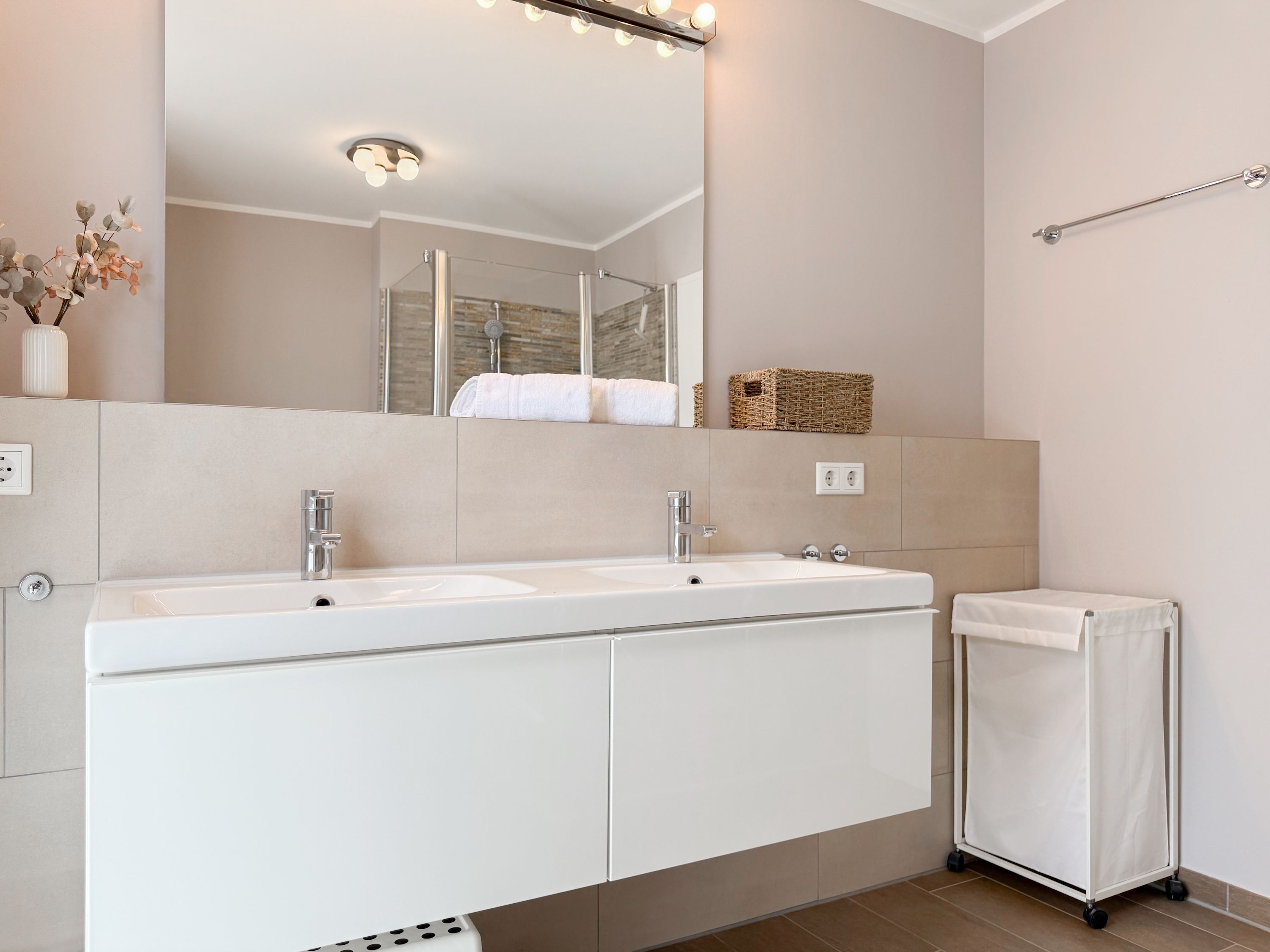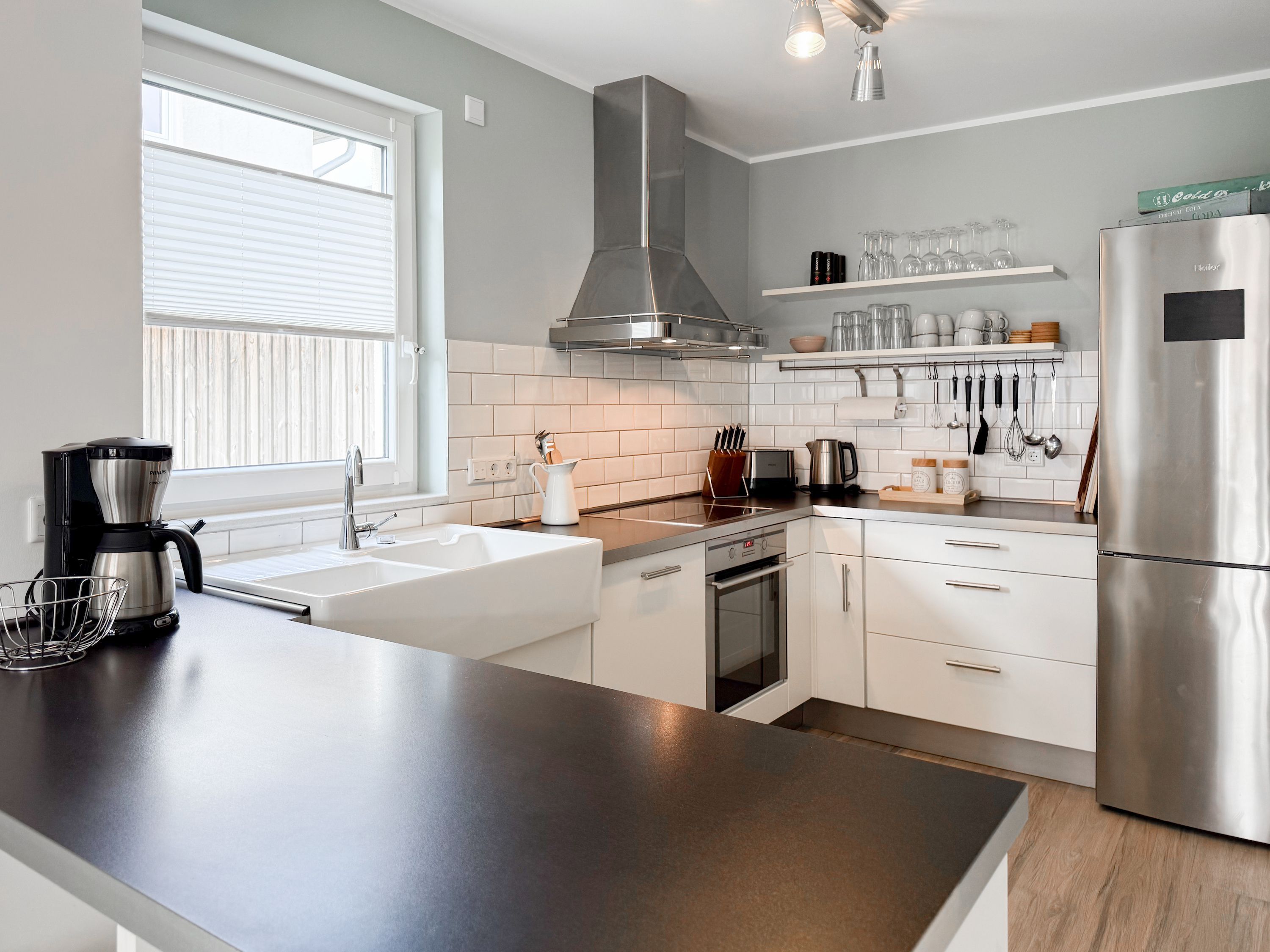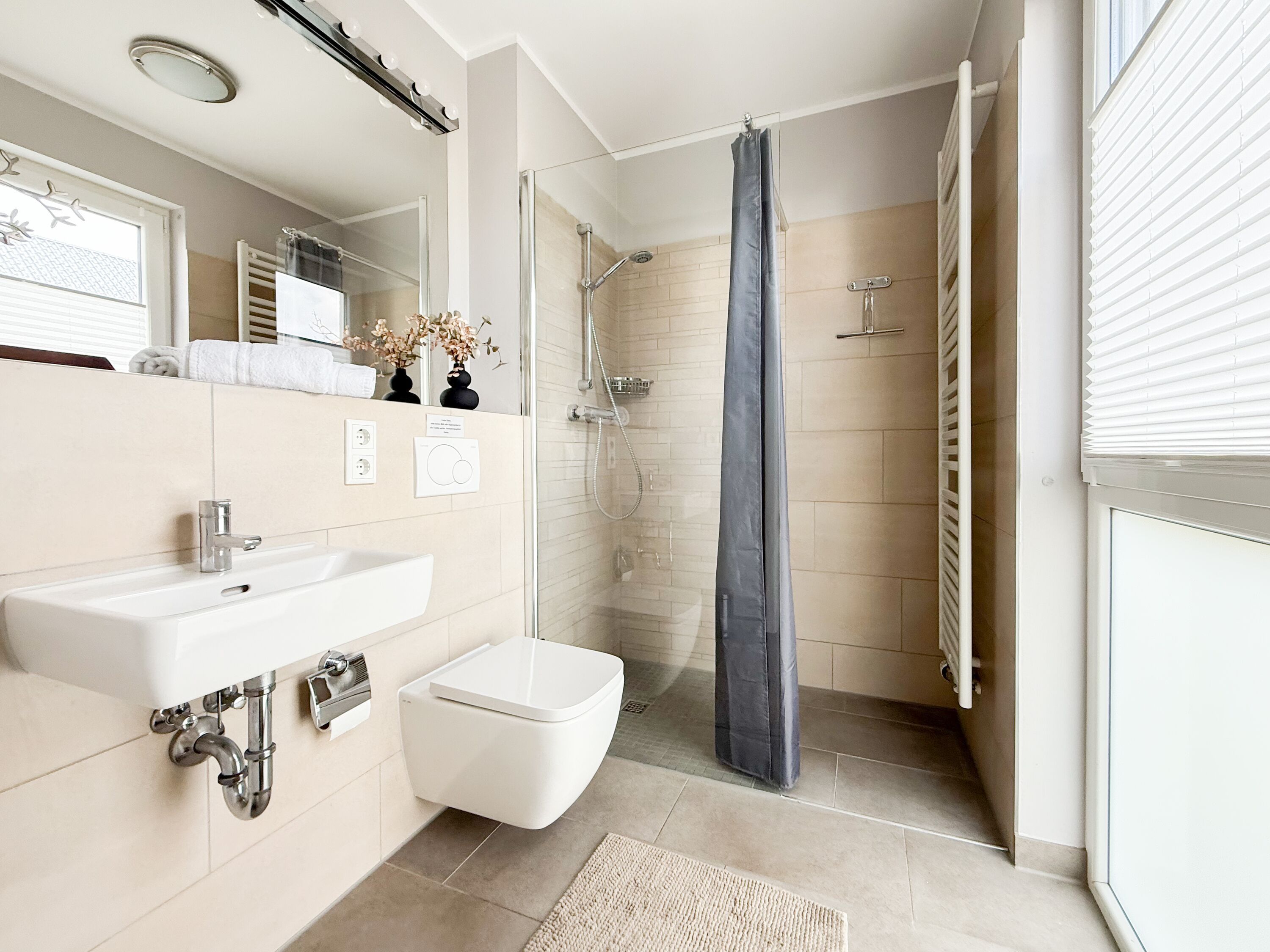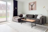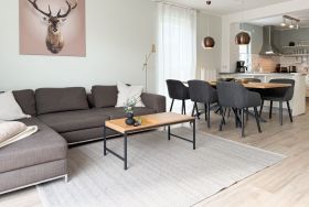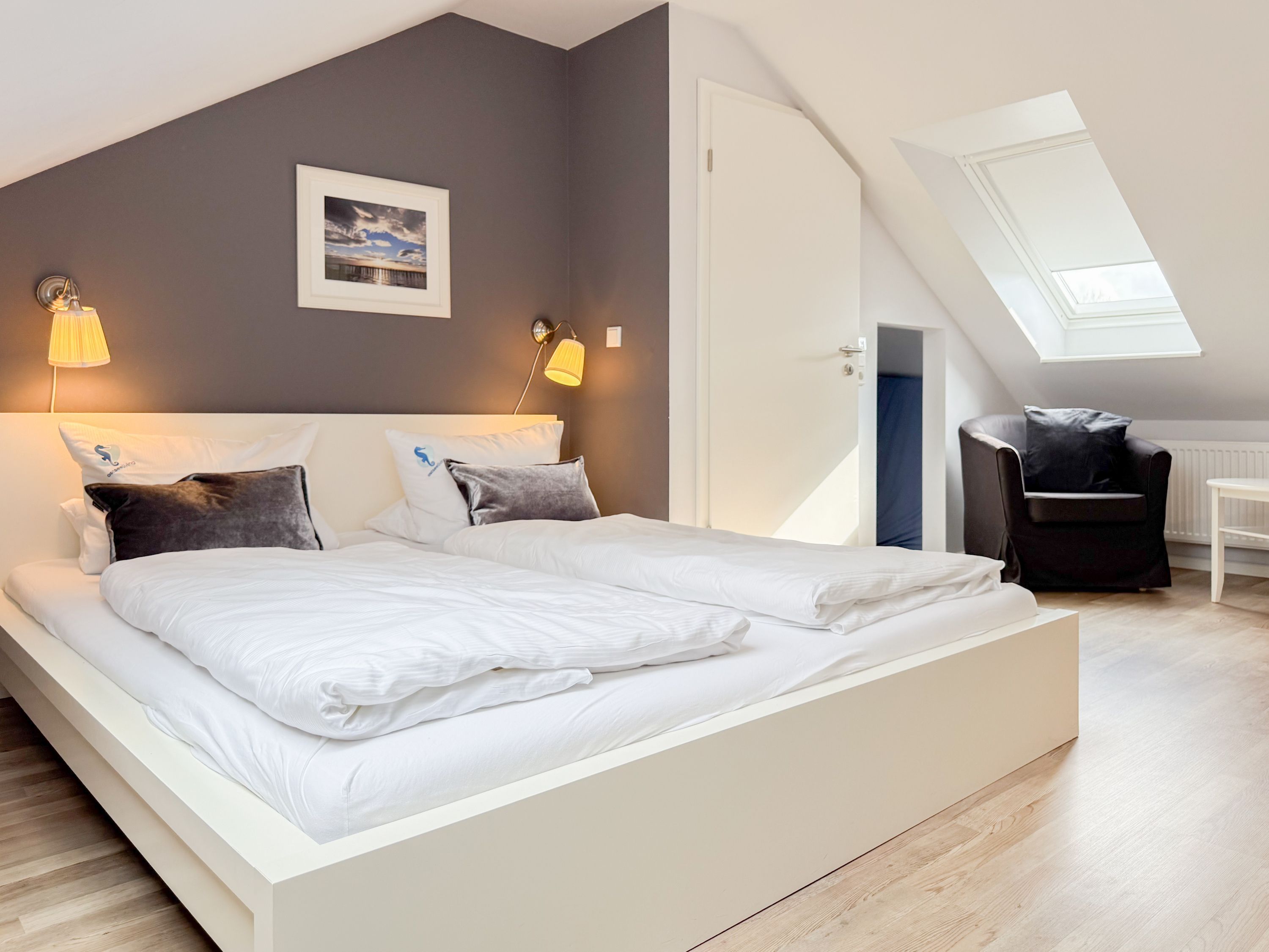 Es erwartet Sie ein tolles Doppelhaus mit 3 separaten Schlafzimmern und 2 Duschbädern. Sonnige Räumlichkeiten auf über 100 qm Wohnfläche und die geschmackvolle Einrichtung mit liebevollen Details schaffen ein behagliches Ambiente für 6 Personen. Im Erdgeschoss erwartet Sie ein großzügiger Wohnbereich, der mit einem gemütlichen Ecksofa und TV eingerichtet ist. Die vorgelagerte Sonnenterrasse in Südausrichtung garantiert erholsame Urlaubszeit. Die großzügige Einbauküche ist bestens ausgestattet und lädt zum gemeinsamen Kochen ein. Der anschließende Essbereich, mit großem Esstisch und gemütlichen Sesseln, bietet ausreichend Platz für gemeinsame Mahlzeiten und geselliges Beisammensein. Im Eingangsbereich befindet sich eine Garderobe und ein neuwertiges Tageslichtbad mit Dusche, Waschbecken und WC. Eine Waschmaschine ist im separaten Abstellraum untergebracht, ebenfalls im Erdgeschoss. Im Obergeschoss befindet sich ein weiteres Duschbad mit Doppelwaschtisch und Fenster sowie 2 separate Schlafzimmer. Schlafzimmer 1 ist äußerst großzügig und mit einem Doppelbett, einer Sitzecke mit TV und einem Schreibtisch für das Home Office eingerichtet. Schlafzimmer 2 verfügt über 2 Einzelbetten und einen gemütlichen Relaxsessel. Im Dachgeschoss befindet sich das 3. Schlafzimmer mit einem Doppelbett (180x200), Kleiderschrank und Sessel. Die Dachflächenfenster lassen sich über ein Rollo verdunkeln, alle anderen Fenster des Hauses sind mit elektrischen Außenjalousien versehen. WLAN steht selbstverständlich kostenlos zur Verfügung. Vor dem Haus befinden sich zwei Parkplätze. (1 Carport und 1 Außenstellplatz). Fahrräder können sicher und trocken im Schuppen am Haus untergestellt werden.