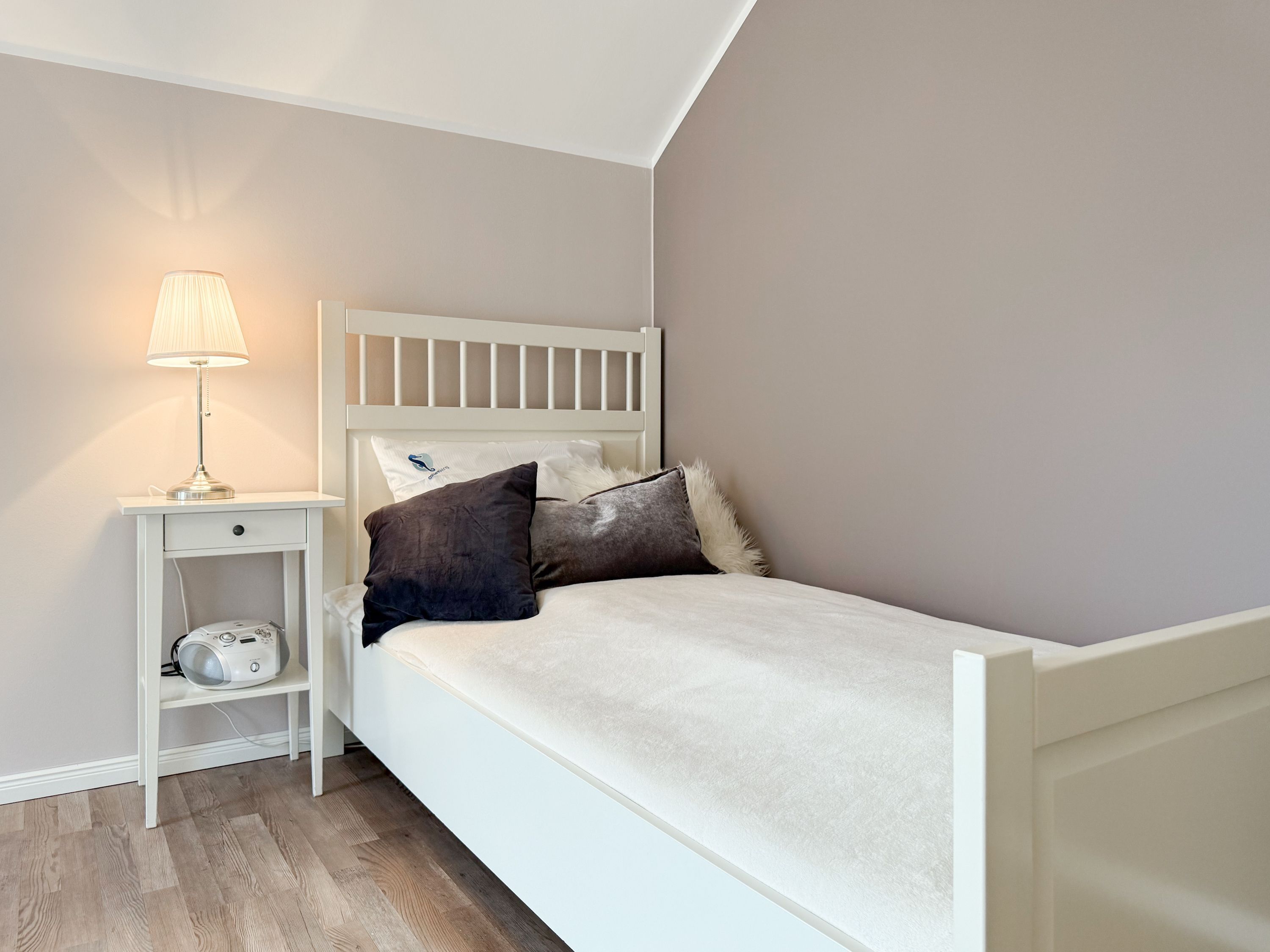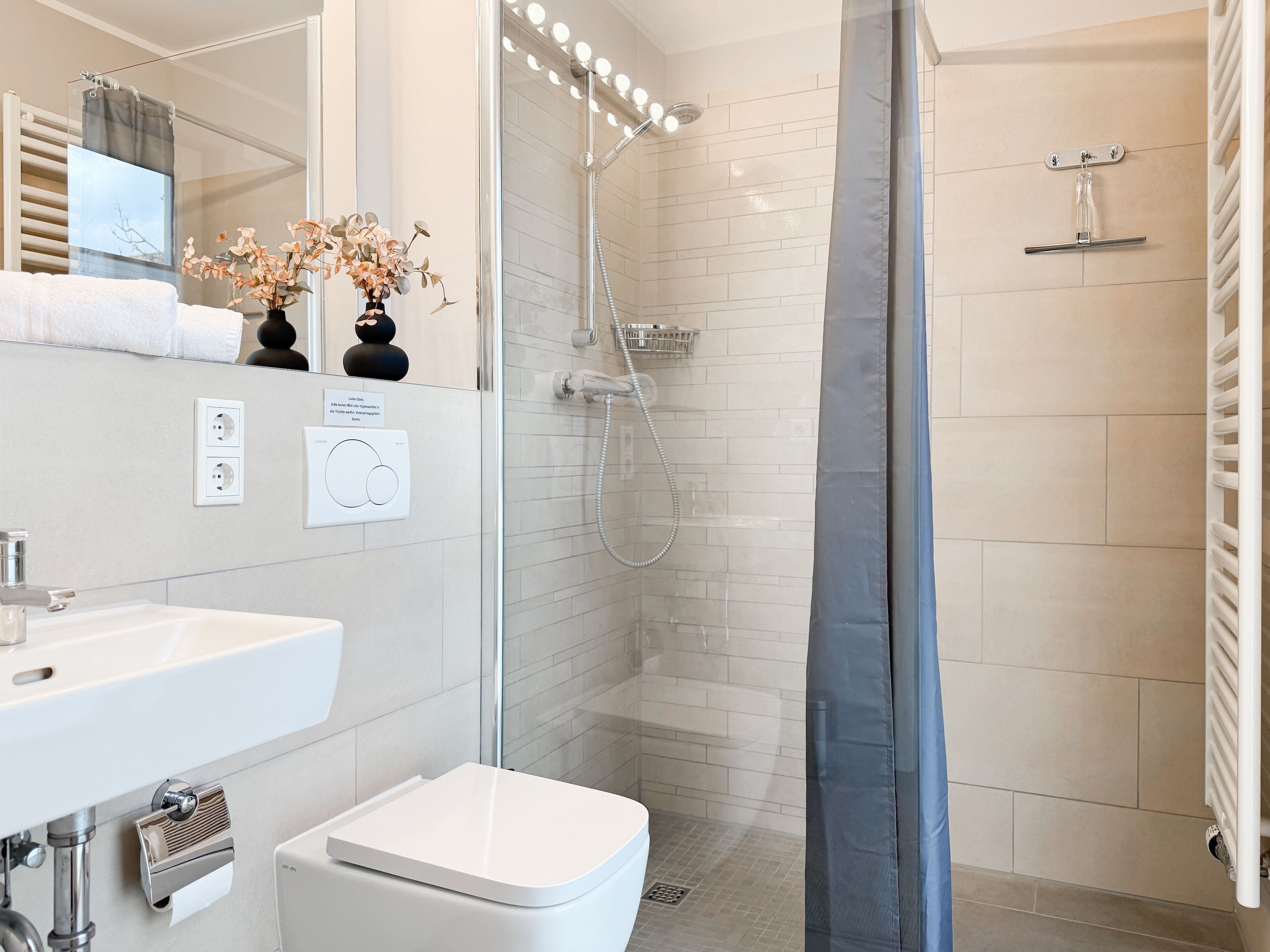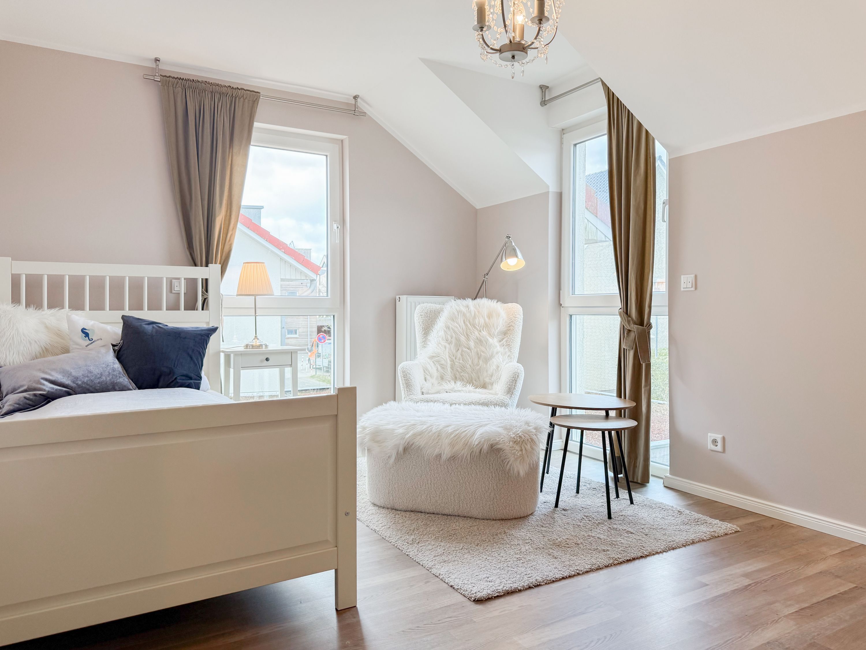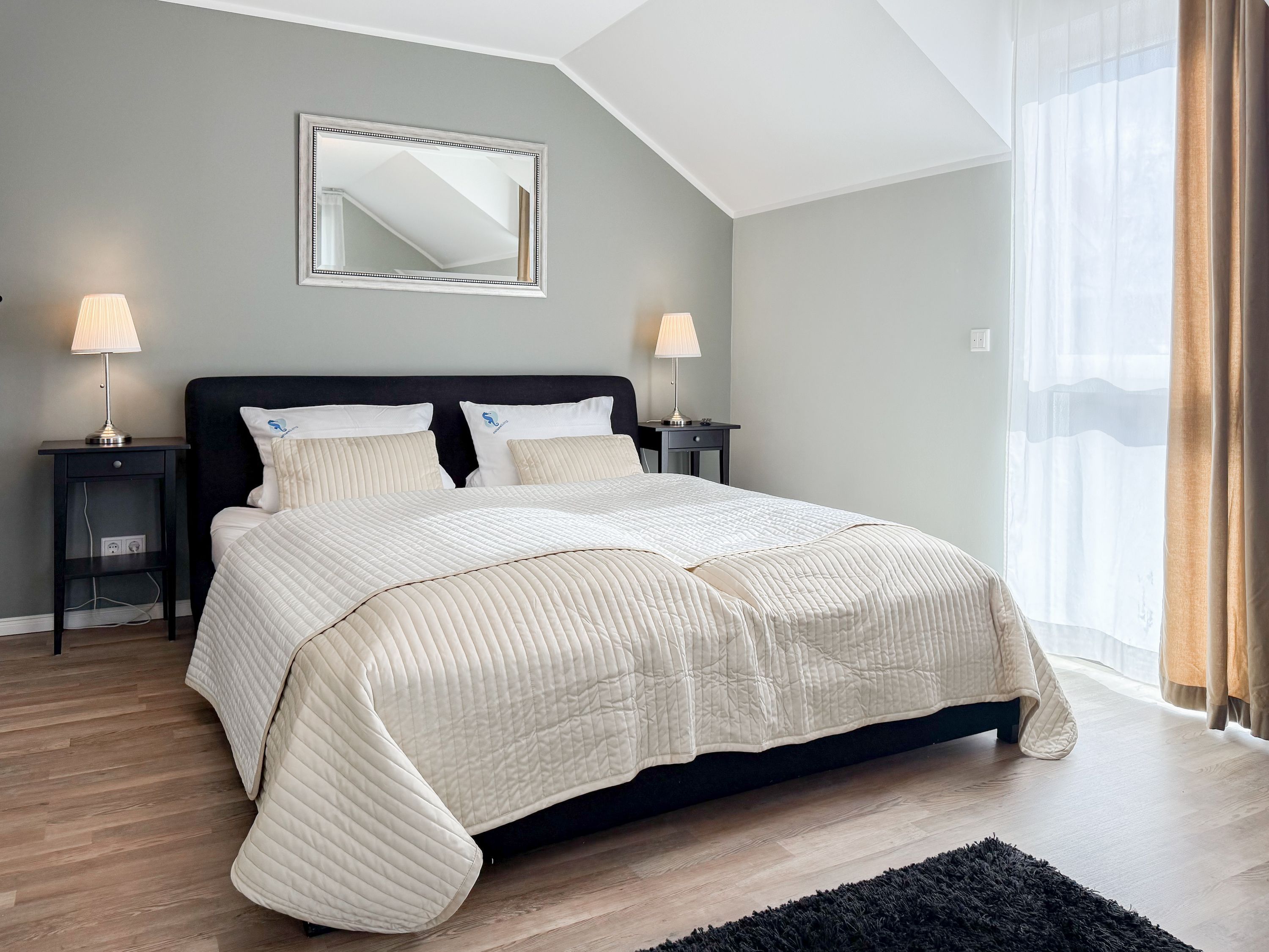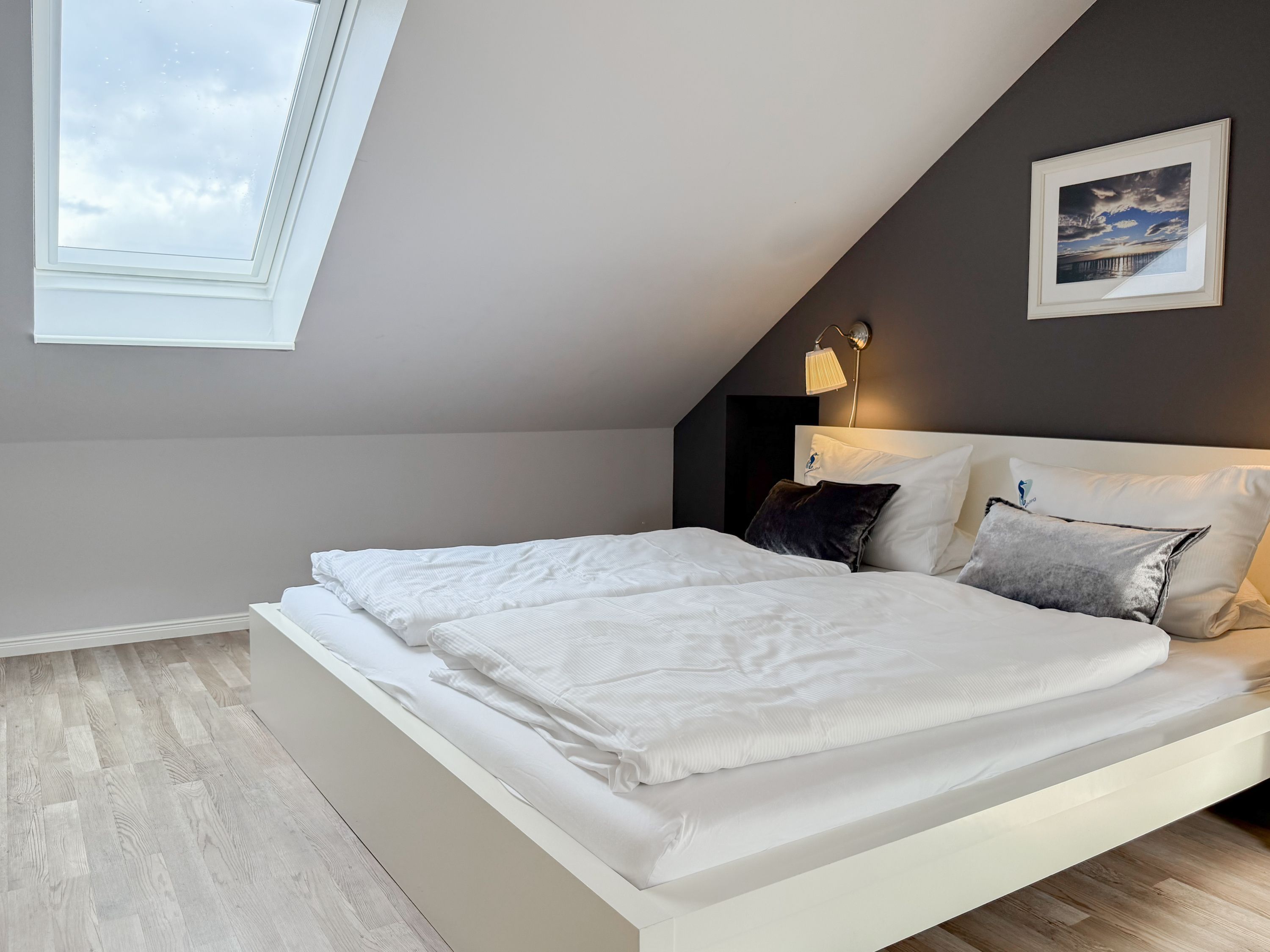 Es erwartet Sie ein tolles Doppelhaus mit 3 separaten Schlafzimmern und 2 Duschbädern. Sonnige Räumlichkeiten auf über 100 qm Wohnfläche und die geschmackvolle Einrichtung mit liebevollen Details schaffen ein behagliches Ambiente für 6 Personen. Im Erdgeschoss erwartet Sie ein großzügiger Wohnbereich, der mit einem gemütlichen Ecksofa und TV eingerichtet ist. Die vorgelagerte Sonnenterrasse in Südausrichtung garantiert erholsame Urlaubszeit. Die großzügige Einbauküche ist bestens ausgestattet und lädt zum gemeinsamen Kochen ein. Der anschließende Essbereich, mit großem Esstisch und gemütlichen Sesseln, bietet ausreichend Platz für gemeinsame Mahlzeiten und geselliges Beisammensein. Im Eingangsbereich befindet sich eine Garderobe und ein neuwertiges Tageslichtbad mit Dusche, Waschbecken und WC. Eine Waschmaschine ist im separaten Abstellraum untergebracht, ebenfalls im Erdgeschoss. Im Obergeschoss befindet sich ein weiteres Duschbad mit Doppelwaschtisch und Fenster sowie 2 separate Schlafzimmer. Schlafzimmer 1 ist äußerst großzügig und mit einem Doppelbett, einer Sitzecke mit TV und einem Schreibtisch für das Home Office eingerichtet. Schlafzimmer 2 verfügt über 2 Einzelbetten und einen gemütlichen Relaxsessel. Im Dachgeschoss befindet sich das 3. Schlafzimmer mit einem Doppelbett (180x200), Kleiderschrank und Sessel. Die Dachflächenfenster lassen sich über ein Rollo verdunkeln, alle anderen Fenster des Hauses sind mit elektrischen Außenjalousien versehen. WLAN steht selbstverständlich kostenlos zur Verfügung. Vor dem Haus befinden sich zwei Parkplätze. (1 Carport und 1 Außenstellplatz). Fahrräder können sicher und trocken im Schuppen am Haus untergestellt werden.