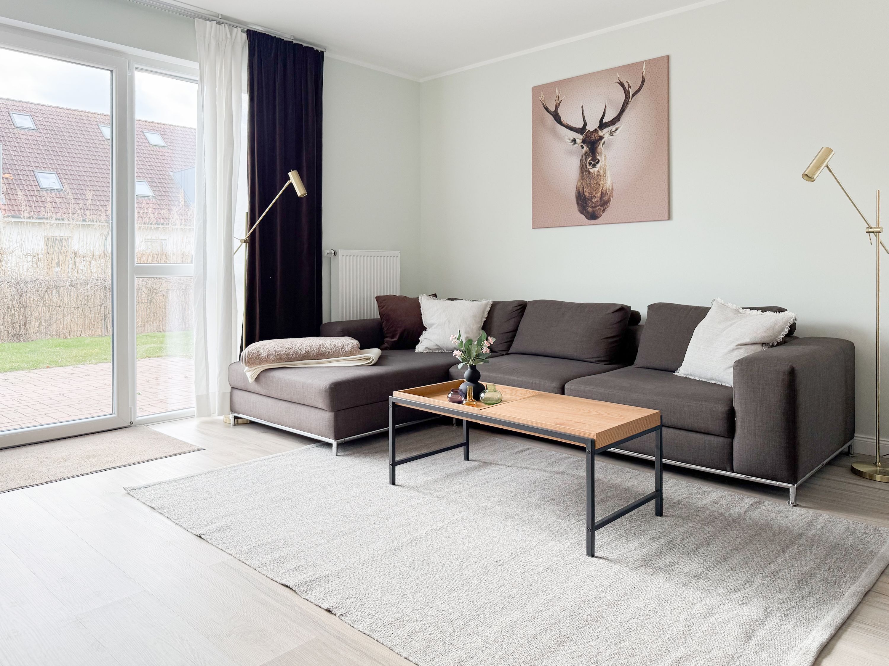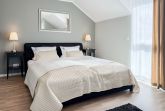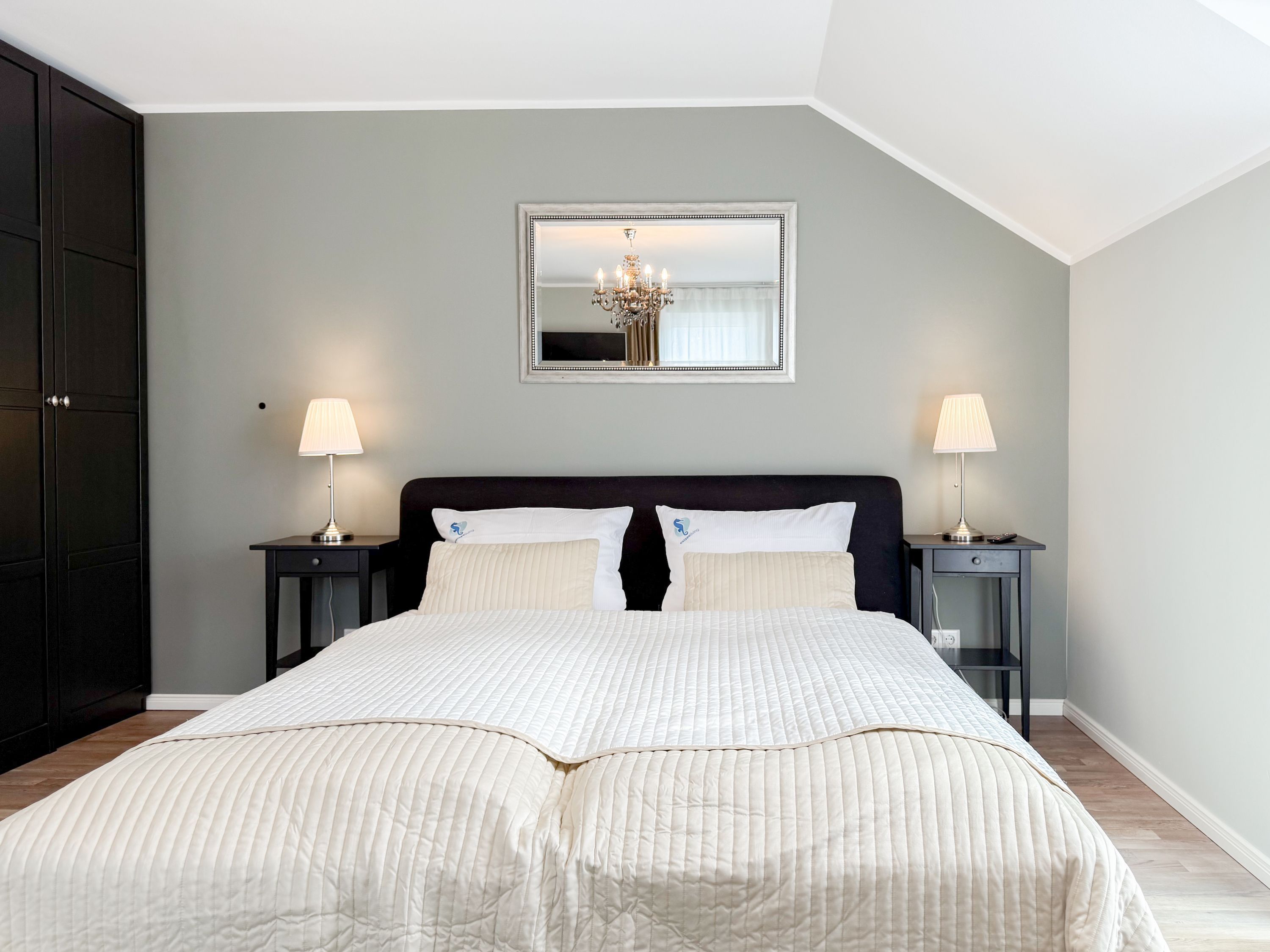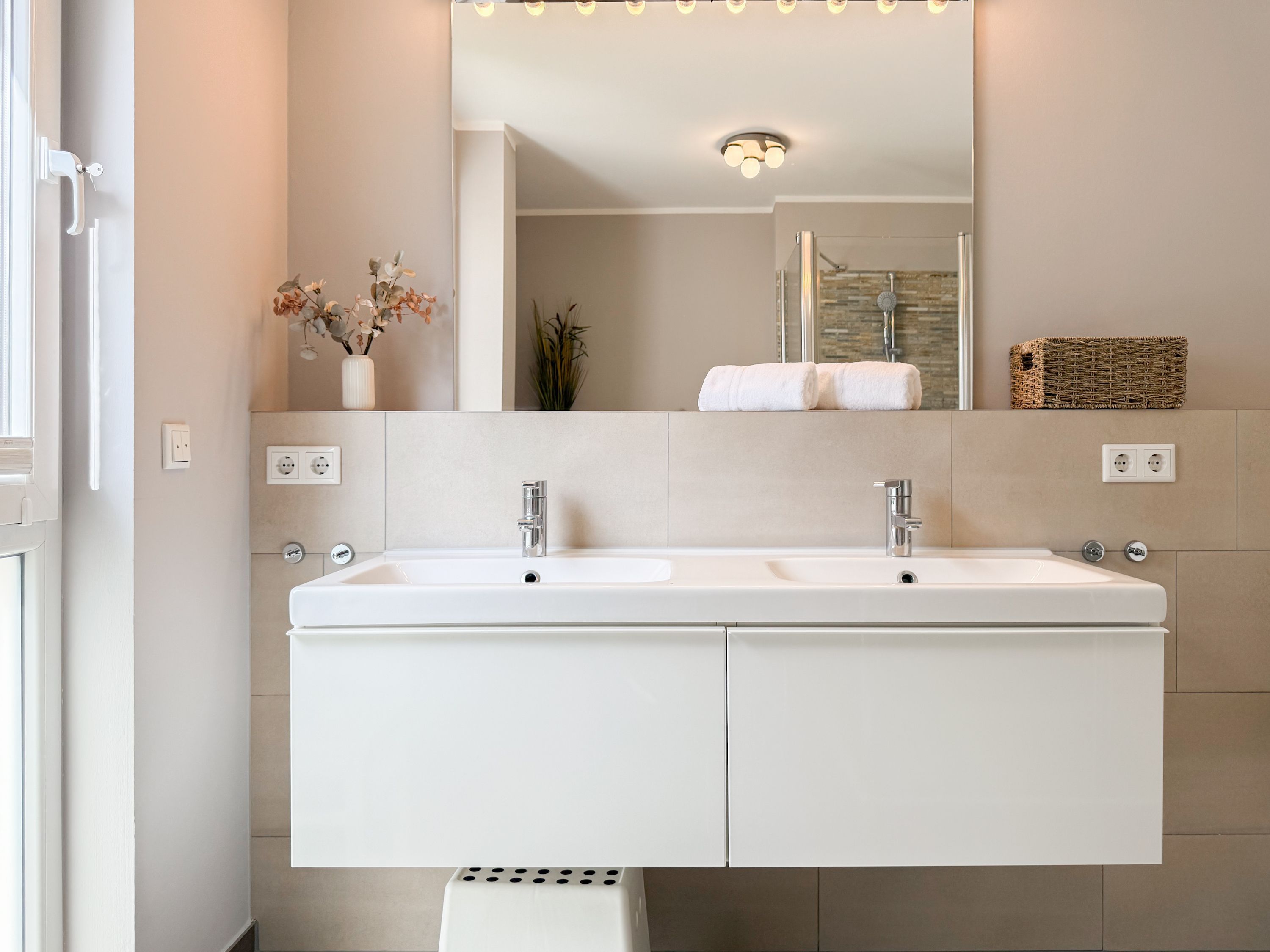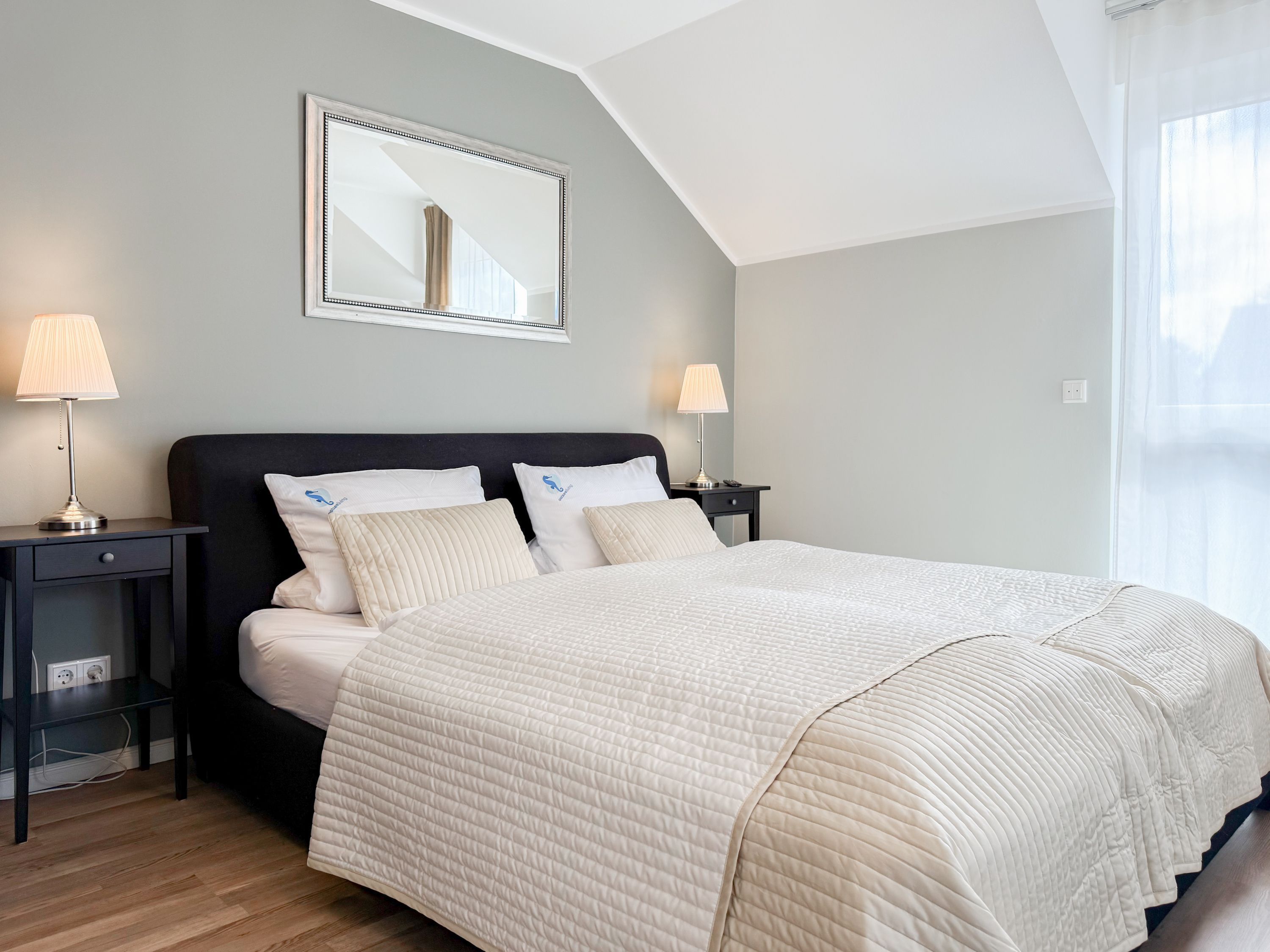 Es erwartet Sie ein tolles Doppelhaus mit 3 separaten Schlafzimmern und 2 Duschbädern. Sonnige Räumlichkeiten auf über 100 qm Wohnfläche und die geschmackvolle Einrichtung mit liebevollen Details schaffen ein behagliches Ambiente für 6 Personen. Im Erdgeschoss erwartet Sie ein großzügiger Wohnbereich, der mit einem gemütlichen Ecksofa und TV eingerichtet ist. Die vorgelagerte Sonnenterrasse in Südausrichtung garantiert erholsame Urlaubszeit. Die großzügige Einbauküche ist bestens ausgestattet und lädt zum gemeinsamen Kochen ein. Der anschließende Essbereich, mit großem Esstisch und gemütlichen Sesseln, bietet ausreichend Platz für gemeinsame Mahlzeiten und geselliges Beisammensein. Im Eingangsbereich befindet sich eine Garderobe und ein neuwertiges Tageslichtbad mit Dusche, Waschbecken und WC. Eine Waschmaschine ist im separaten Abstellraum untergebracht, ebenfalls im Erdgeschoss. Im Obergeschoss befindet sich ein weiteres Duschbad mit Doppelwaschtisch und Fenster sowie 2 separate Schlafzimmer. Schlafzimmer 1 ist äußerst großzügig und mit einem Doppelbett, einer Sitzecke mit TV und einem Schreibtisch für das Home Office eingerichtet. Schlafzimmer 2 verfügt über 2 Einzelbetten und einen gemütlichen Relaxsessel. Im Dachgeschoss befindet sich das 3. Schlafzimmer mit einem Doppelbett (180x200), Kleiderschrank und Sessel. Die Dachflächenfenster lassen sich über ein Rollo verdunkeln, alle anderen Fenster des Hauses sind mit elektrischen Außenjalousien versehen. WLAN steht selbstverständlich kostenlos zur Verfügung. Vor dem Haus befinden sich zwei Parkplätze. (1 Carport und 1 Außenstellplatz). Fahrräder können sicher und trocken im Schuppen am Haus untergestellt werden.