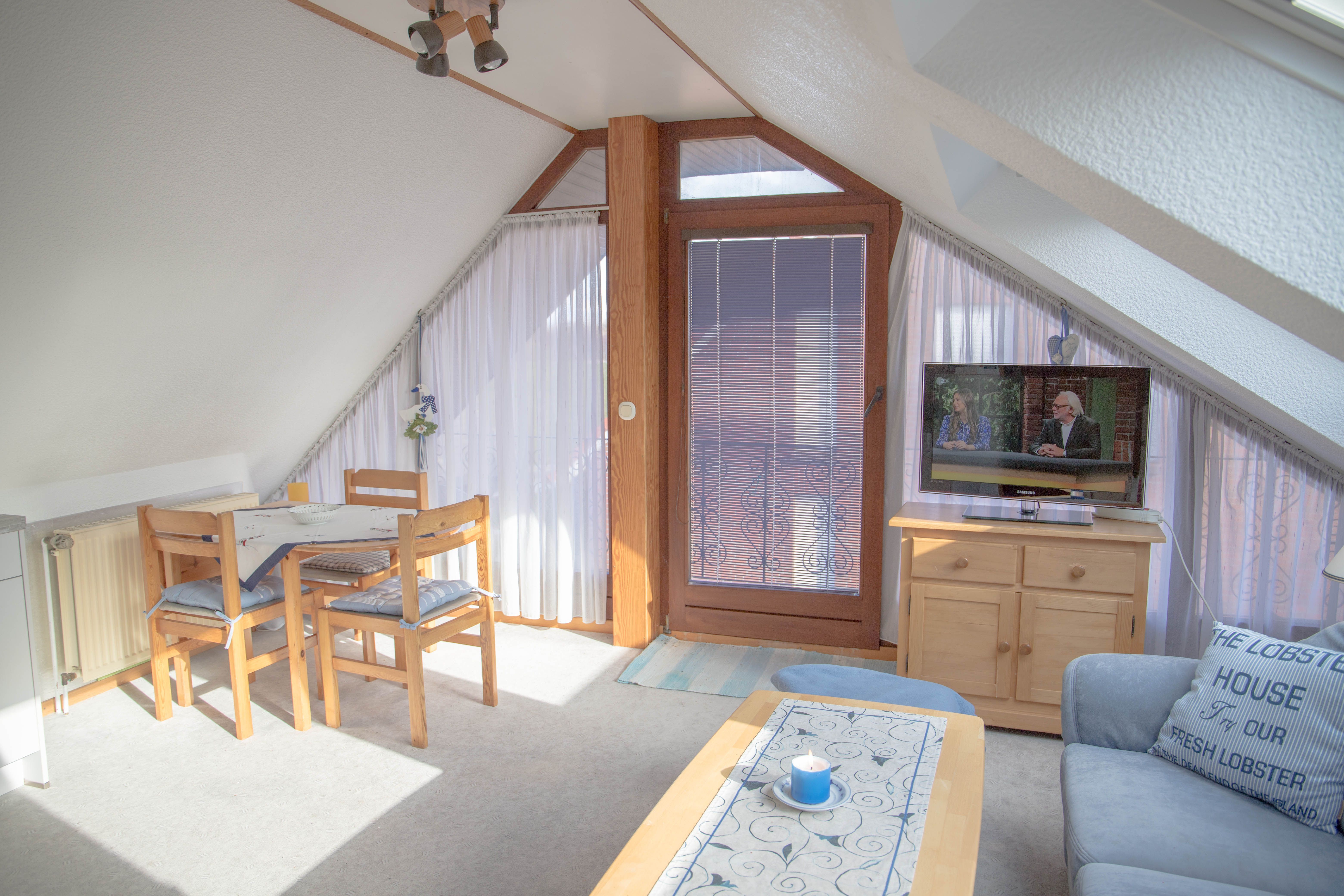 Genießen Sie vom Wohn-Essbereich aus den direkten Zugang zu Ihrem eigenen Balkon, mit Blick auf den Deich und das Meer. Perfekt für ein entspanntes Frühstück oder einen romantischen Abend unter den Sterne.