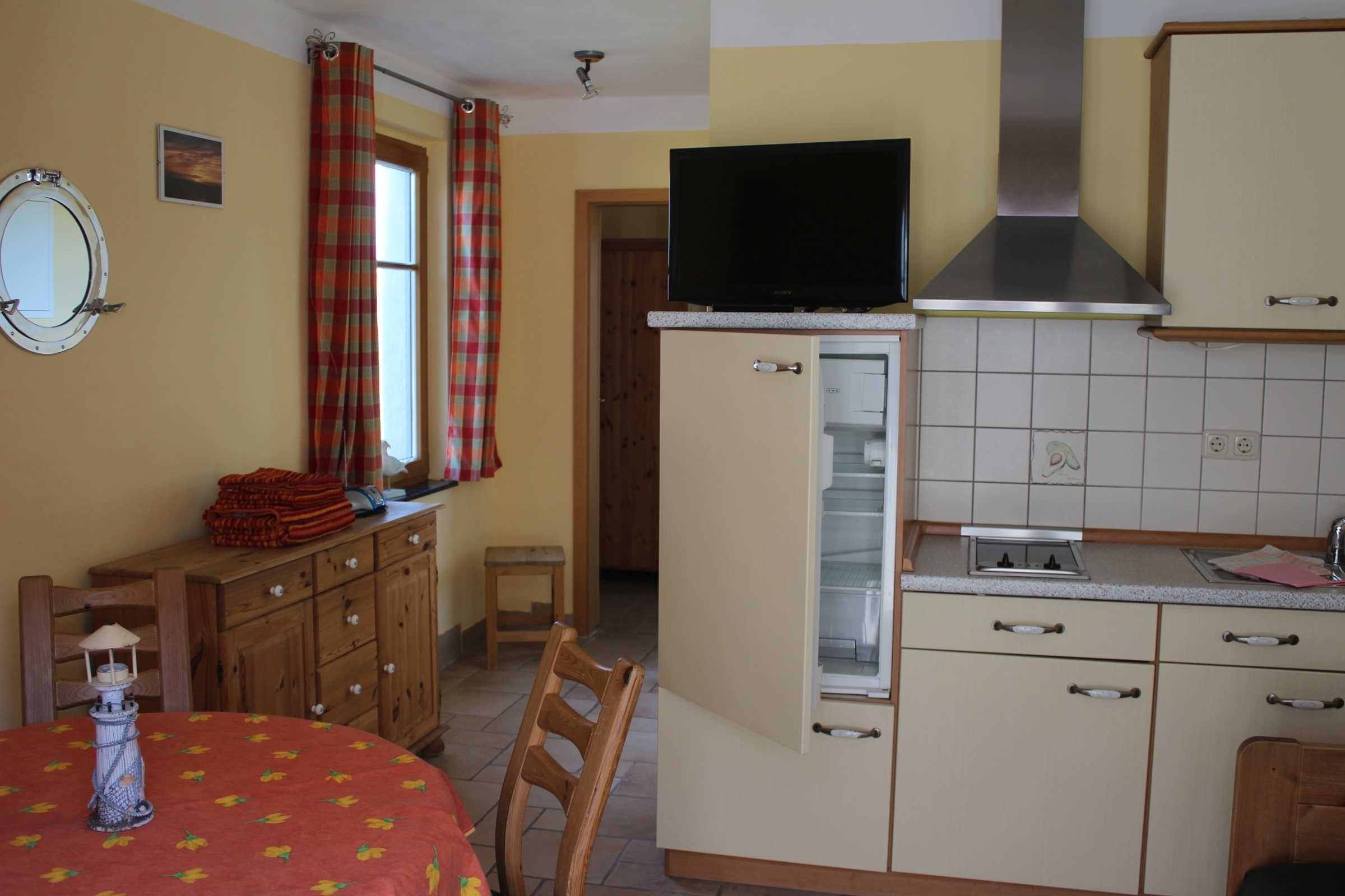 Gemütliche 35 qm große Ferienwohnung im EG geeignet für 2-4 Personen. Sie ist mit 1 Doppelbett im Schlafzimmer und 1 Schlafcouch im Wohn-/Küchen-/Essbereich ausgestattet. Im Wohnzimmer haben Sie Sat-TV, Radio und einen großen Esstisch für gemütliches beisammen sein. In der vollausgestatten Küche befinden sich, ein Cerankochfeld mit 2 Kochplatten, Kaffeemaschine, Toaster, Wasserkocher, Kühlschrank mit TK-Fach.