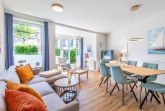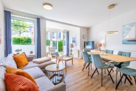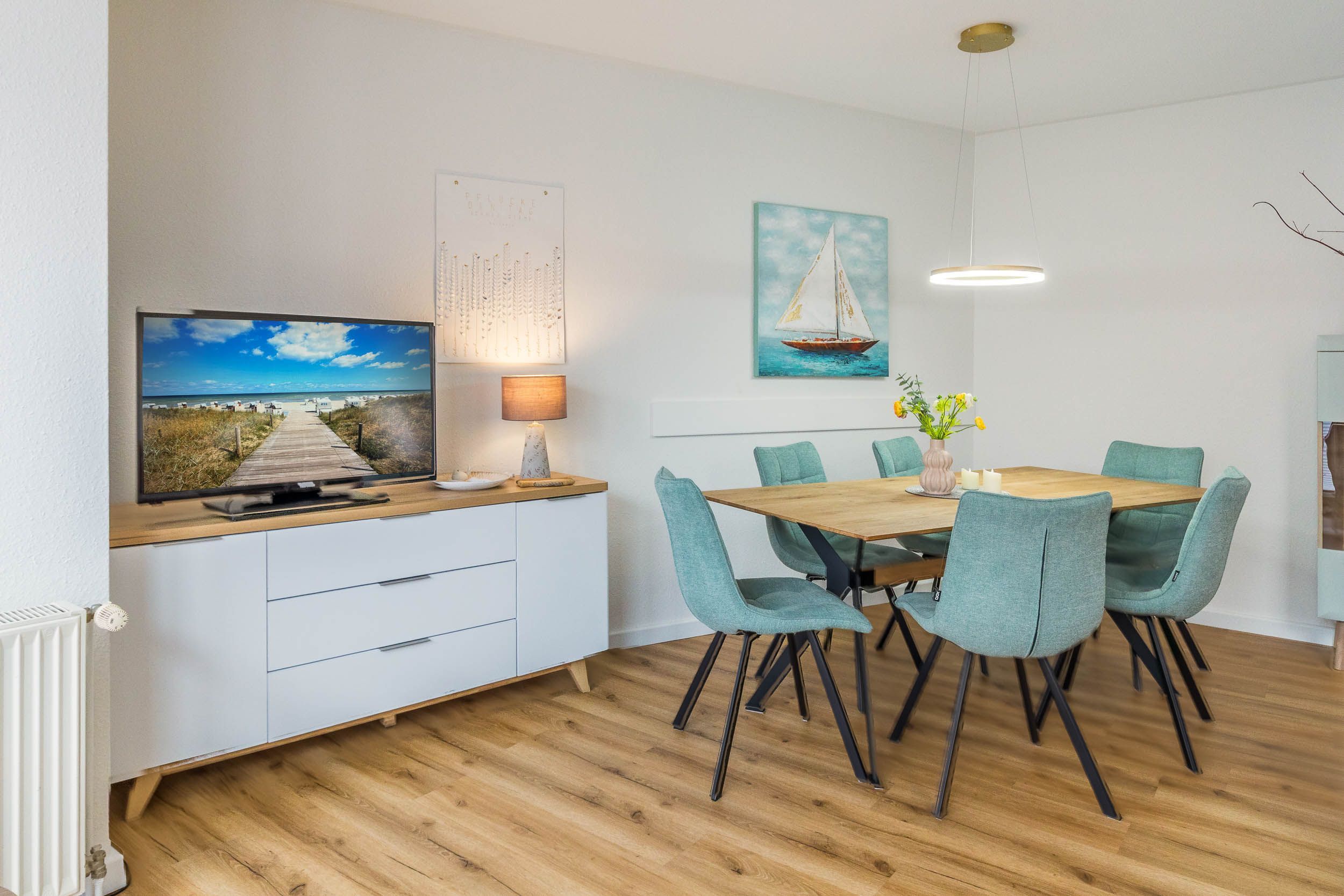 Im Erdgeschoss verfügt das Ferienhaus über einen lichtdurchfluteten Wohn- und Essbereich mit direktem Zugang zur geschützten, möblierten Terrasse mit privatem Gartenanteil. Im Wohnzimmer können Sie gemütlich auf der Couch oder dem Relaxsessel verweilen. Zur Unterhaltung steht Ihnen ein Smart-TV zur Verfügung. Sie können sich mit Ihrem Account anmelden für Netflix, Amazon Prime, Disney+ u.a. und ihr gewohntes Lieblingsprogramm geniesen. Das multimediale Angebot wird abgerundet durch einen DVD-Player. Es gibt auch eine umfangreiche Sammlung von DVDs für Kinder und Erwachsene sowie eine große Auswahl an Gesellschaftsspielen für alle Altersklassen zur Auswahl. Sie können auch auf eine Sammlung von Büchern und Romanen zurückgreifen. Am großen Esstisch finden alle Gäste Platz zum gemeinsamen Speisen, Spielen und Plaudern.