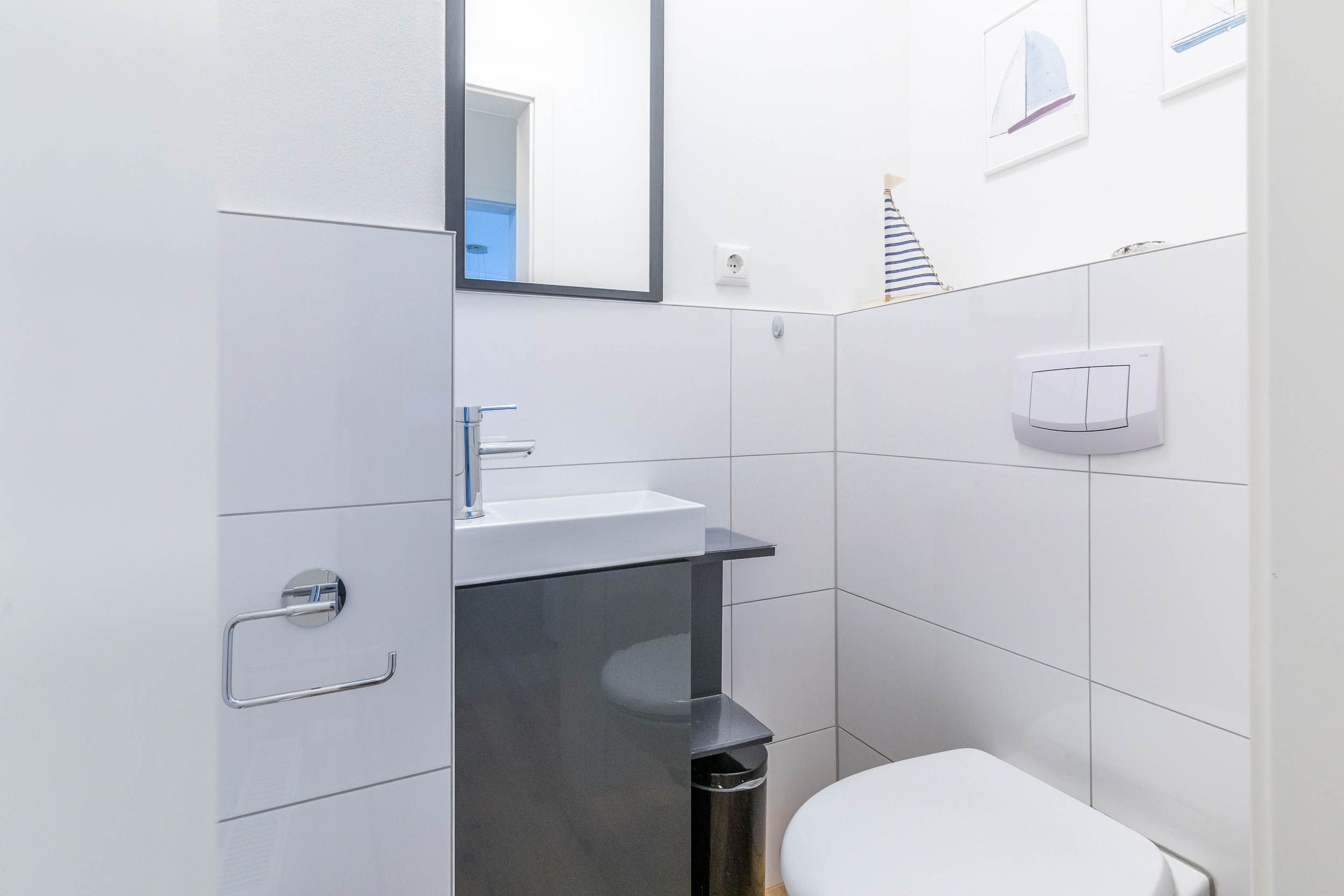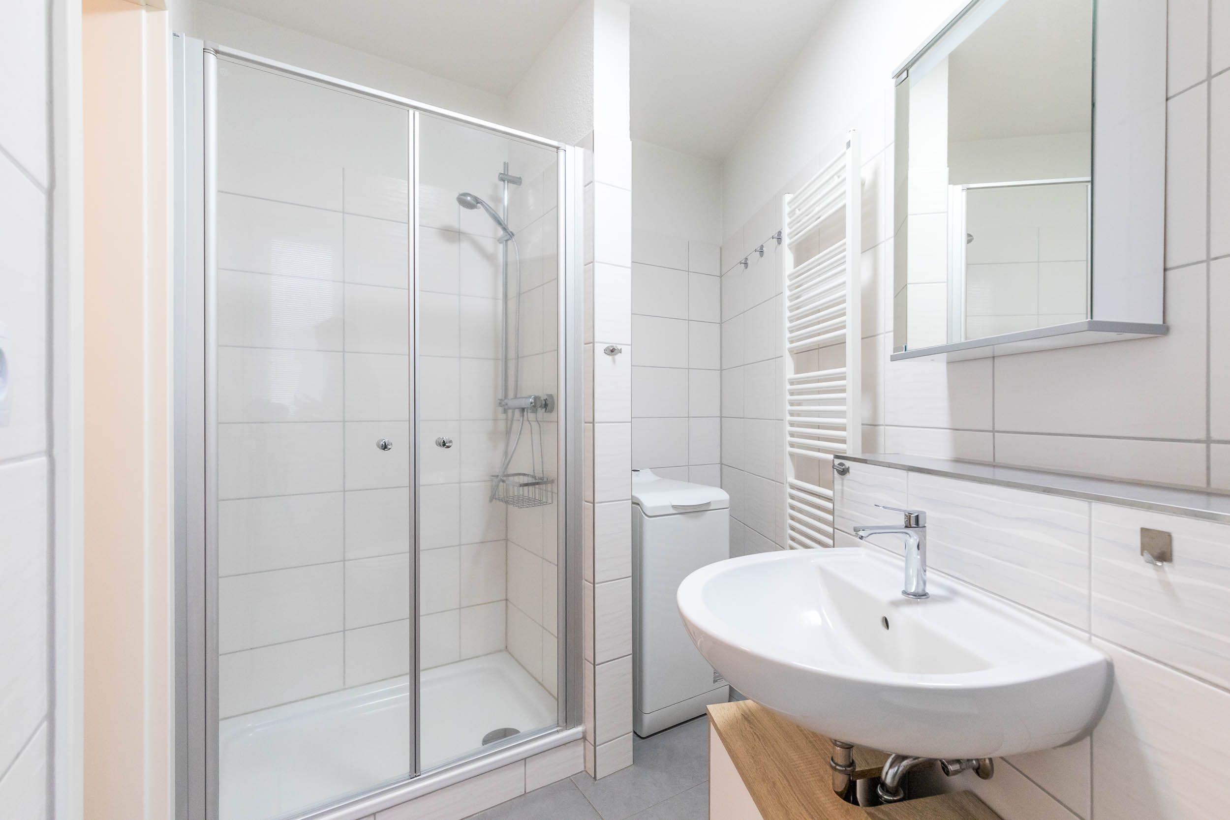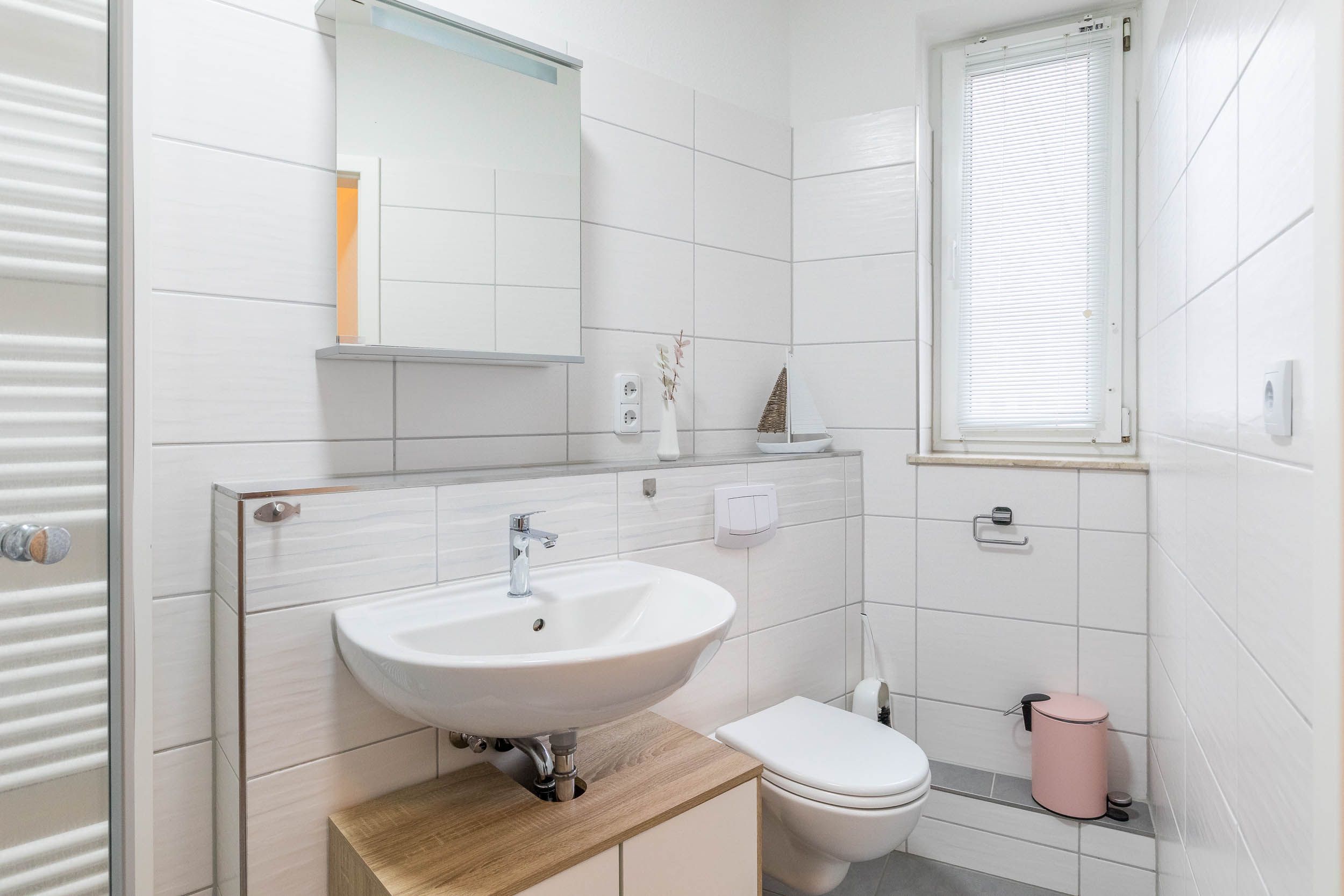 Das Badezimmer, welches sich ebenfalls im 1. Obergeschoss befindet, ist mit einer Dusche, WC und einer Waschmaschine ausgestattet. Ein Fön gehört ebenfalls zur Komplettausstattung. Das Fenster im Bad spendet viel Tageslicht und erleichtert das Lüften nach dem Duschen.