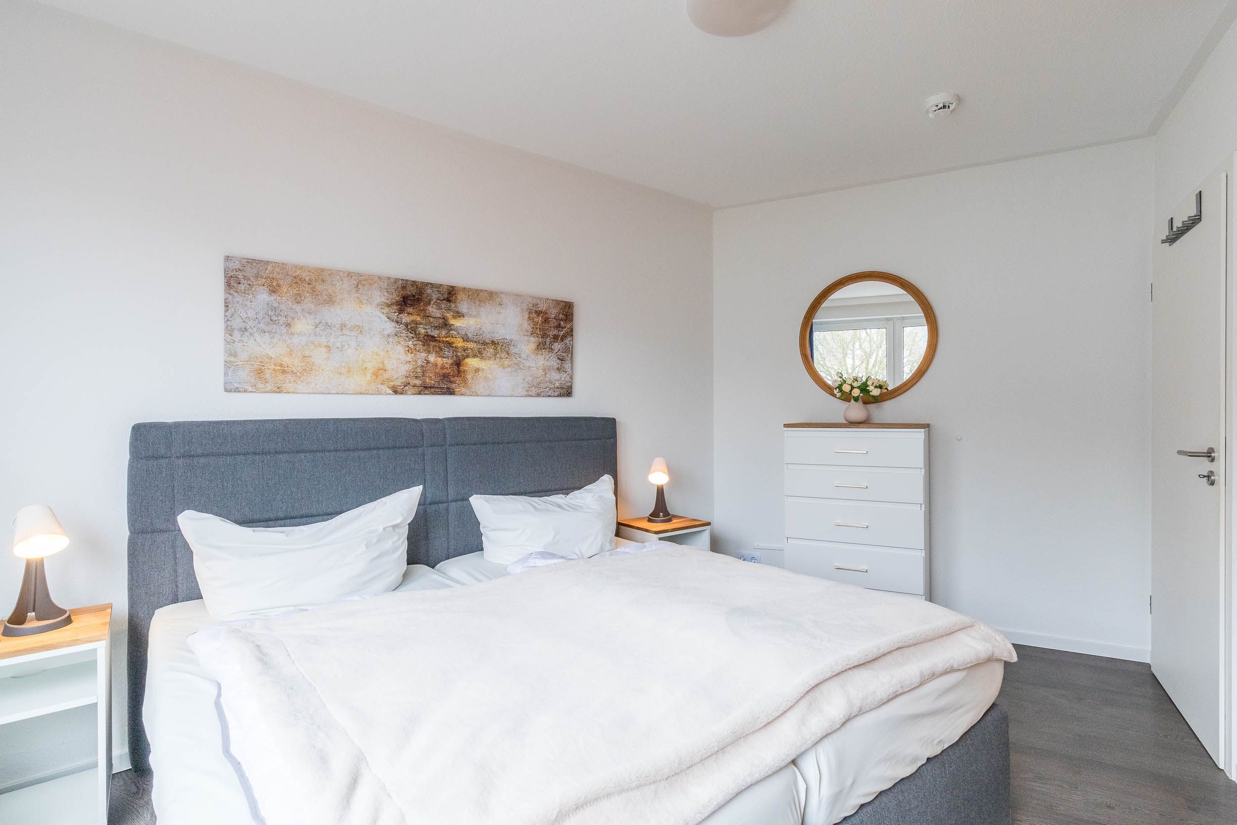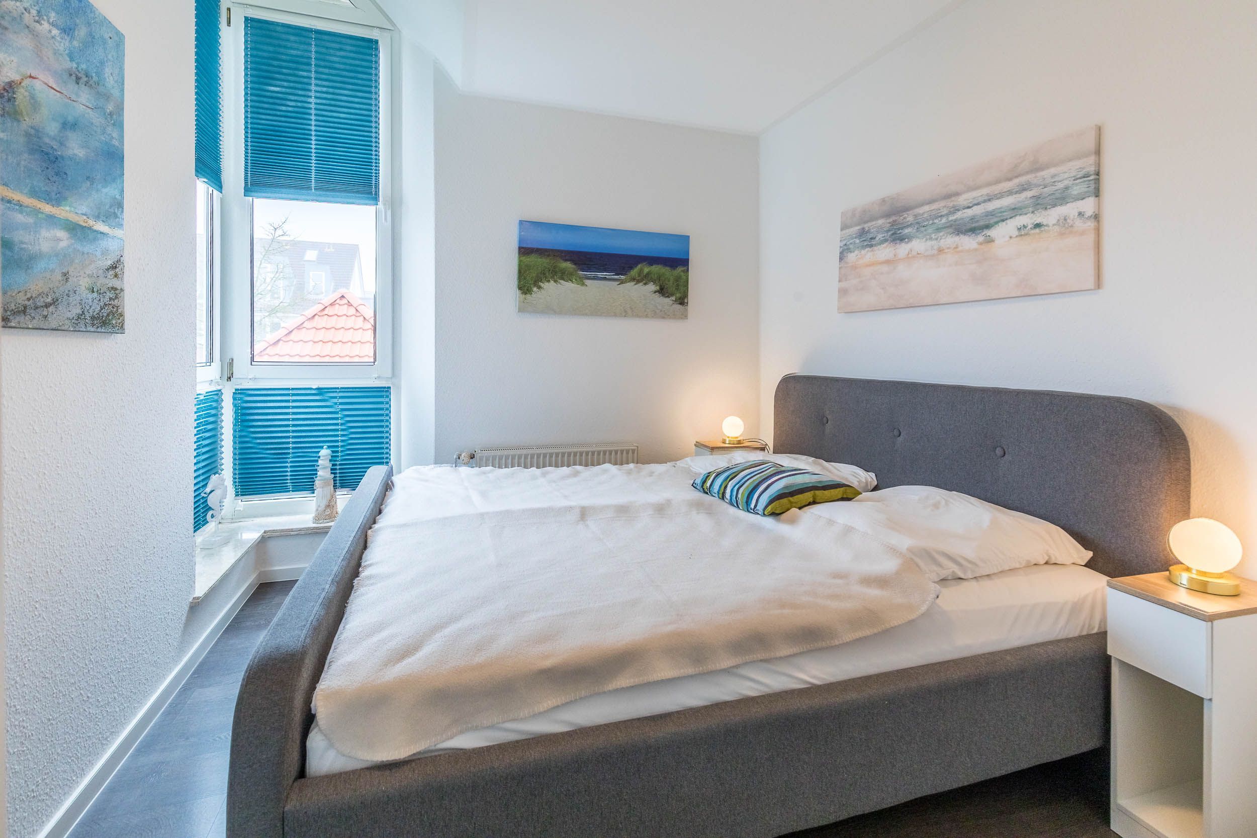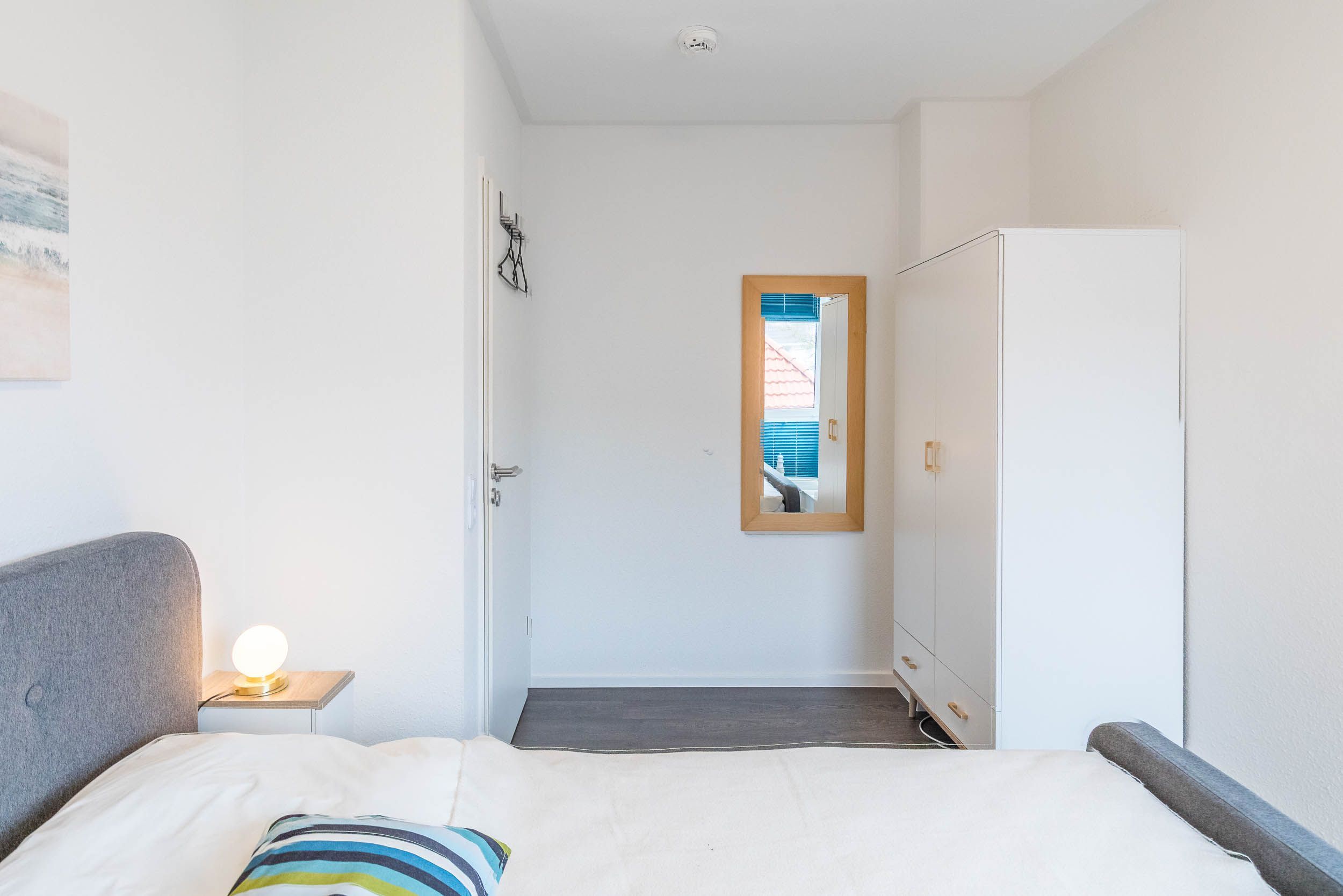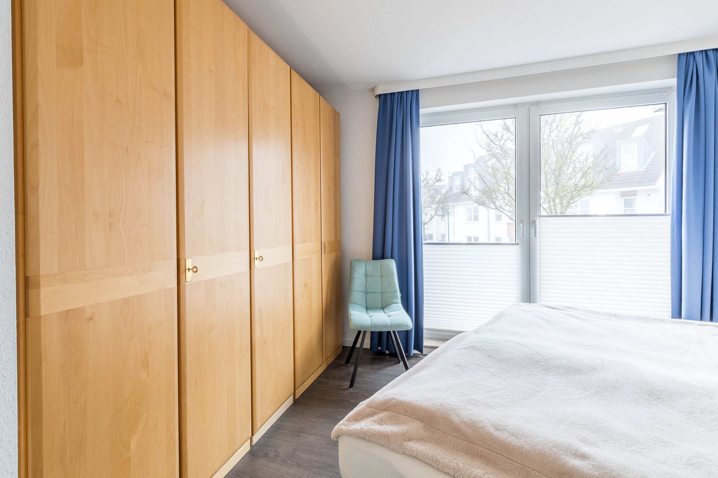 Hier befinden sich zwei weitere Schlafzimmer. Das größere Schlafzimmer ist mit einem Doppelbett (180x200), einem Kleiderschrank und einer Kommode ausgestattet. Von hier aus haben Sie Zugang zum sonnigen, möblierten Balkon. Im zweiten Schlafzimmer befindet sich ein Doppelbett (180x200) und ein Kleiderschrank.