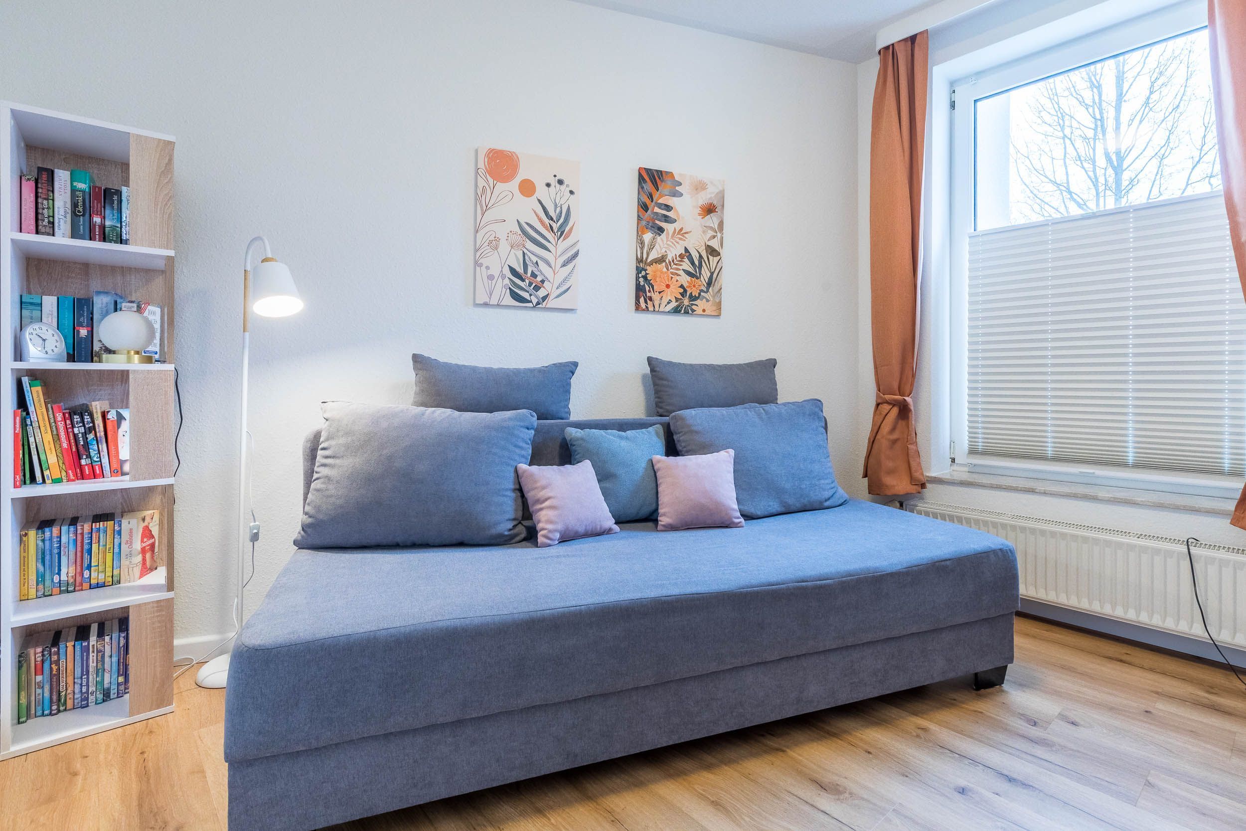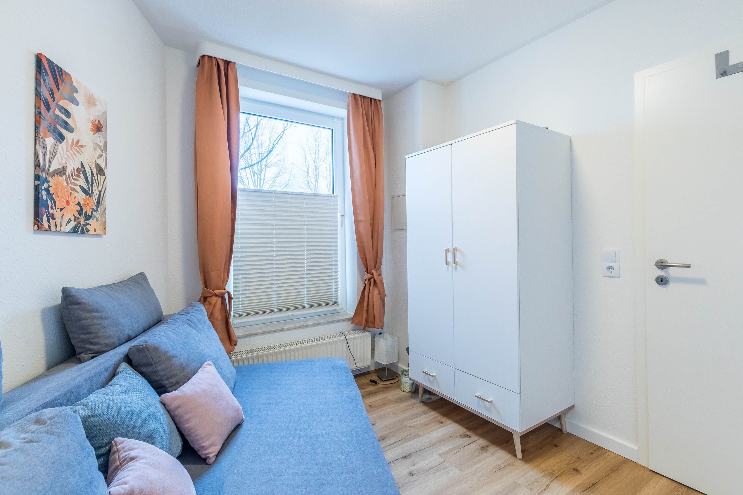 Weiterhin gibt es im Erdgeschoss ein Schlafzimmer mit einem Schlafsofa (160 x 200) und Kleiderschrank sowie ein Gäste WC.