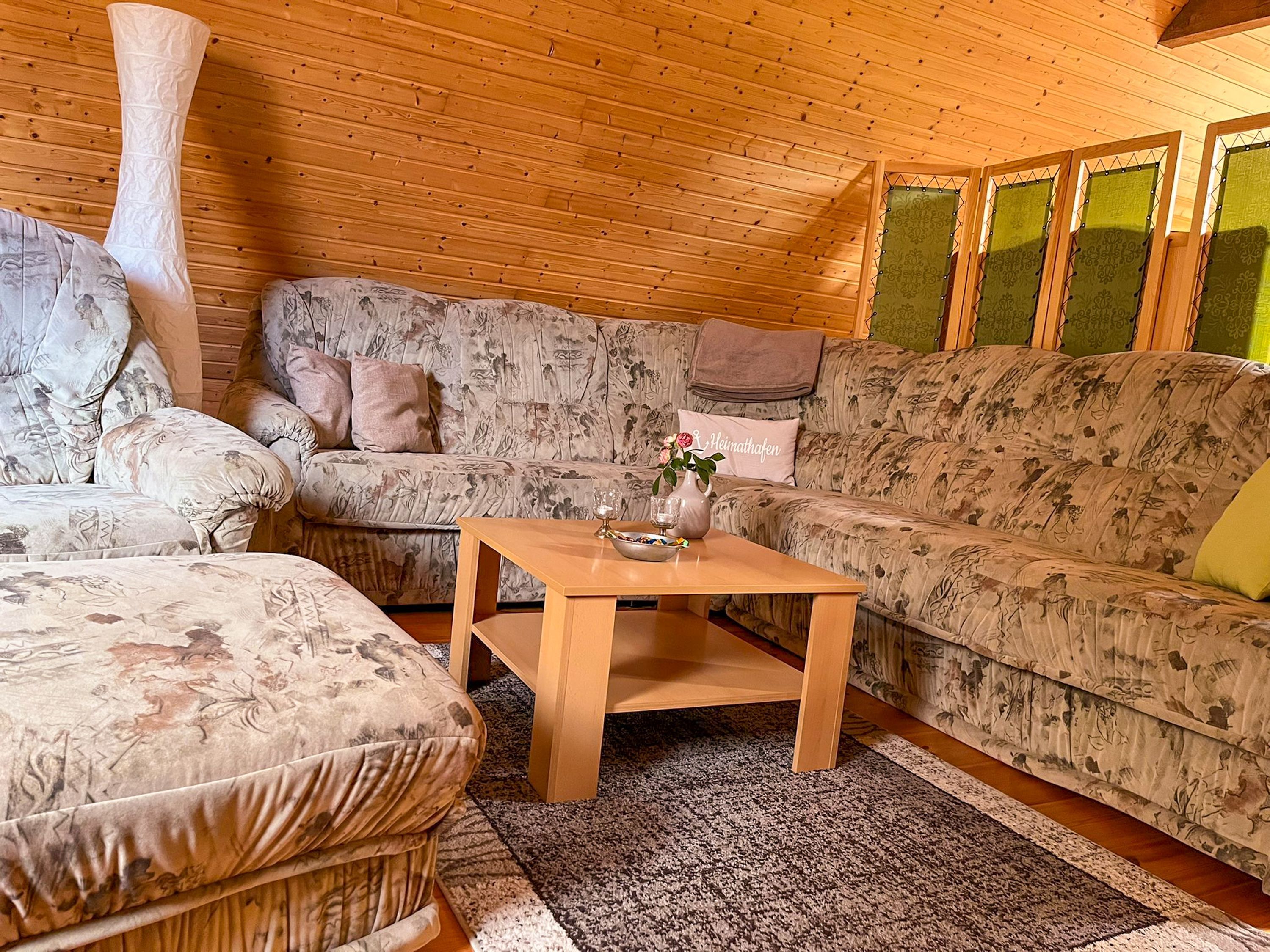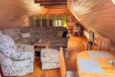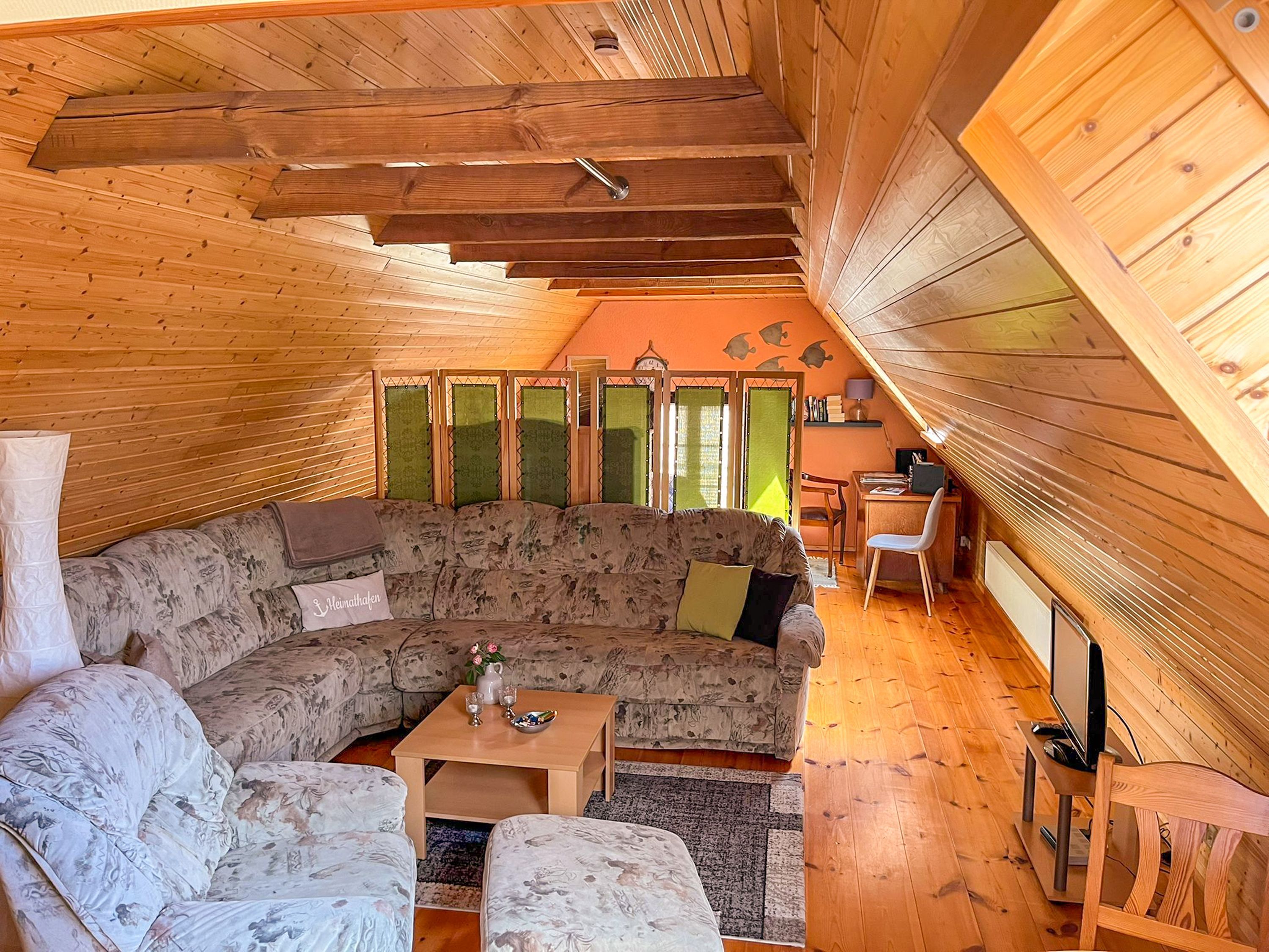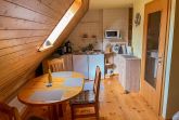 Die Ferienwohnung besteht im Obergeschoss aus einem gemütlichen Wohnraum mit integrierter Küche und Schlafbereich. Die Küche ist ausgestattet mit einem Kühlschrank, einer Gefriermöglichkeit, einer Mikrowelle und einen Pizzabackofen. Das Bad mit Dusche mit WC befindet sich im Erdgeschoss.