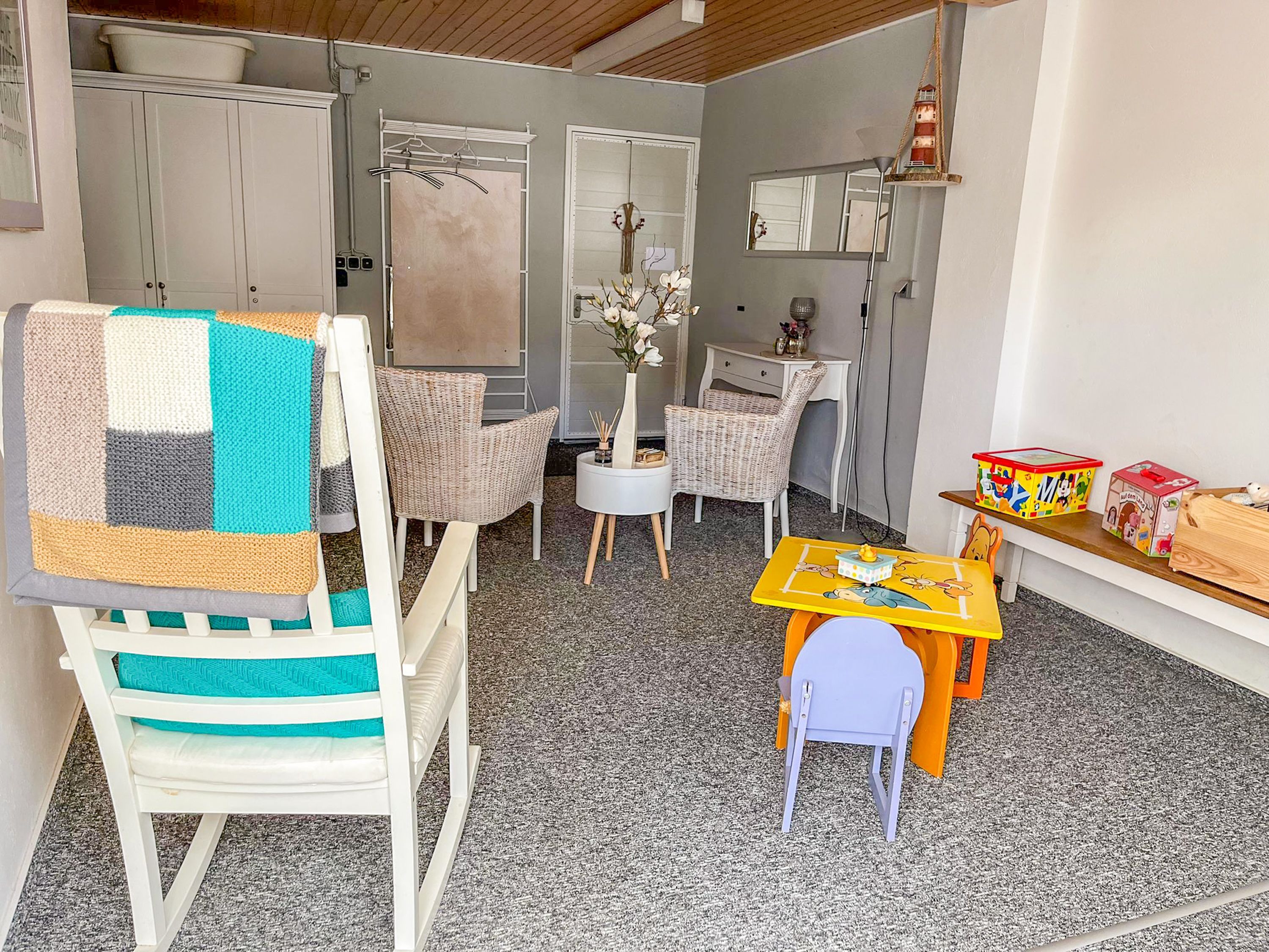 Es ist ein komplettes Kindersortiment mit Kinderhochstuhl, Tisch und 2 Stühlen, Kindertoilettensitz, Töpfchen, Stehhocker für´ s Waschbecken, Dreirad, Fahrrad, Rollrad, Autos und Sandkasten vorhanden.