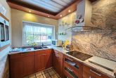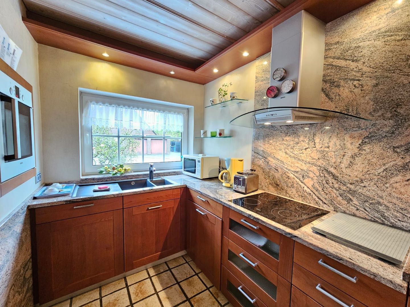 Offene Küche: Hochwertig ausgestattet mit Herd, Backofen, Kühlschrank, Kaffeemaschine, Wasserkocher und Geschirr – ideal für Selbstversorger.