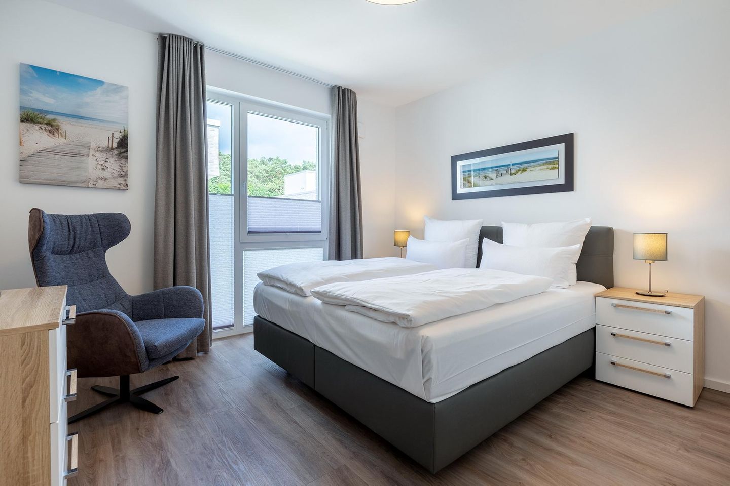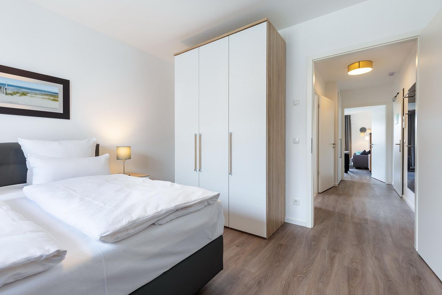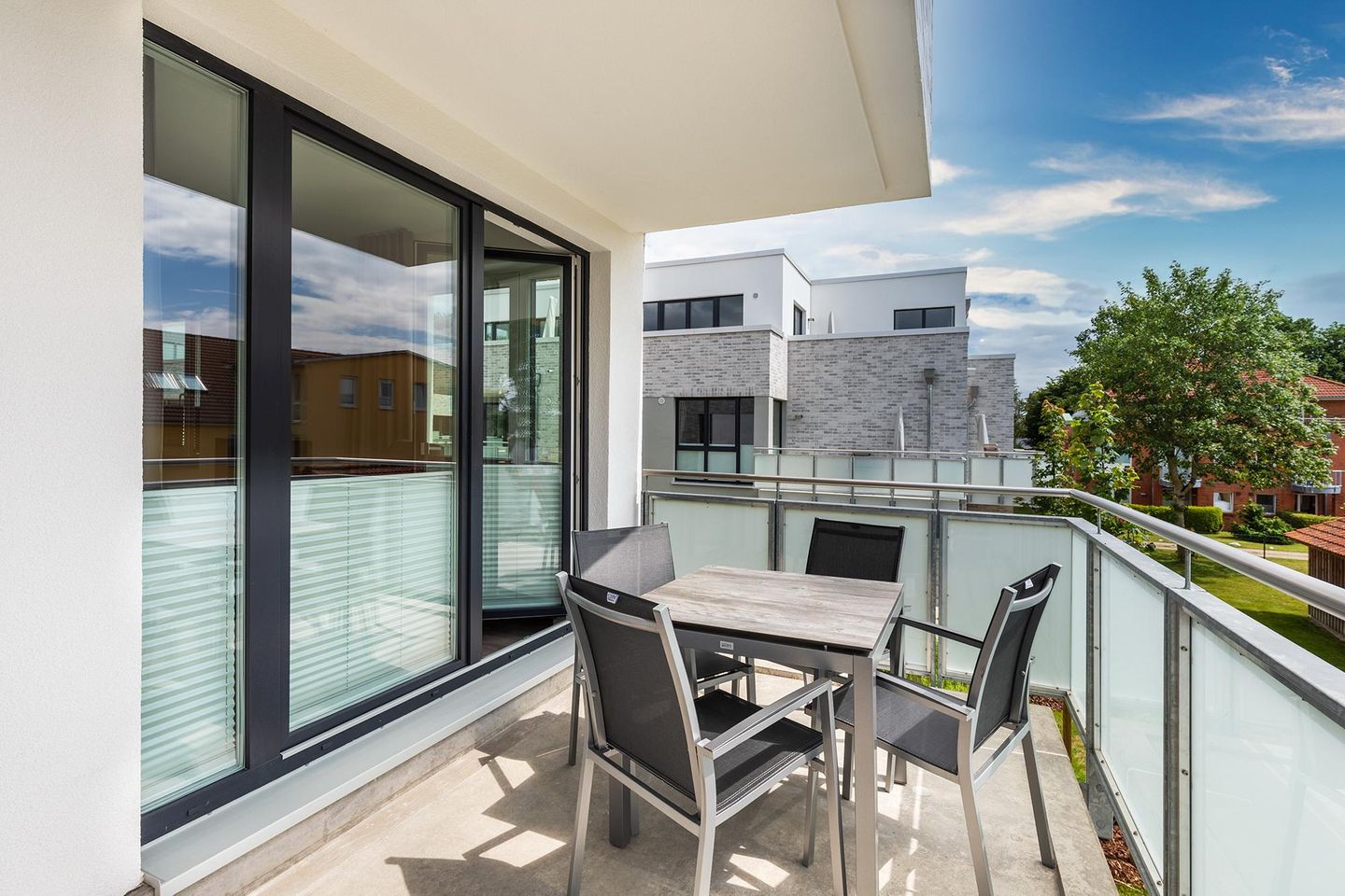 Das helle und moderne Nichtraucher-Apartment verfügt über Fußbodenheizung, bodentiefe Fenster mit 3-fach Isolierung, kostenfreies WLAN und eine voll ausgestattete offene Küche mit Geschirrspüler, Gefrierfach, Kaffeemaschine, Toaster, Wasserkocher, Backofen und Mikrowelle sowie über einen Essbereich. Im Wohnbereich befindet sich eine Doppelschlafcouch (1,60 x 2,00 m) und ein großer Flatscreen-TV mit Blu-ray-Player. Das separate Schlafzimmer ist mit einem modernen Boxspringbett (1,80 x 2,00 m) und einem Flatscreen-TV ausgestattet. Ein Kinderbett kann gegen Entgelt aufgestellt werden und auf Wunsch könnt ihr einen Kinderhochstuhl hinzubuchen. Im stilvollen Badezimmer befinden sich eine ebenerdige Dusche, ein Waschtisch mit Föhn, Kosmetikspiegel und Handtuchheizkörper. Das Apartment verfügt über einen Flur mit Garderobe. Auf dem mit Gartenmöbeln und Sonnenschirm ausgestatteten Balkon könnt ihr den ganzen Tag die Sonne genießen. Der Balkon ist vom Wohnzimmer aus begehbar. Bis auf eine Schwelle zum Balkon ist das Apartment barrierefrei konzipiert.