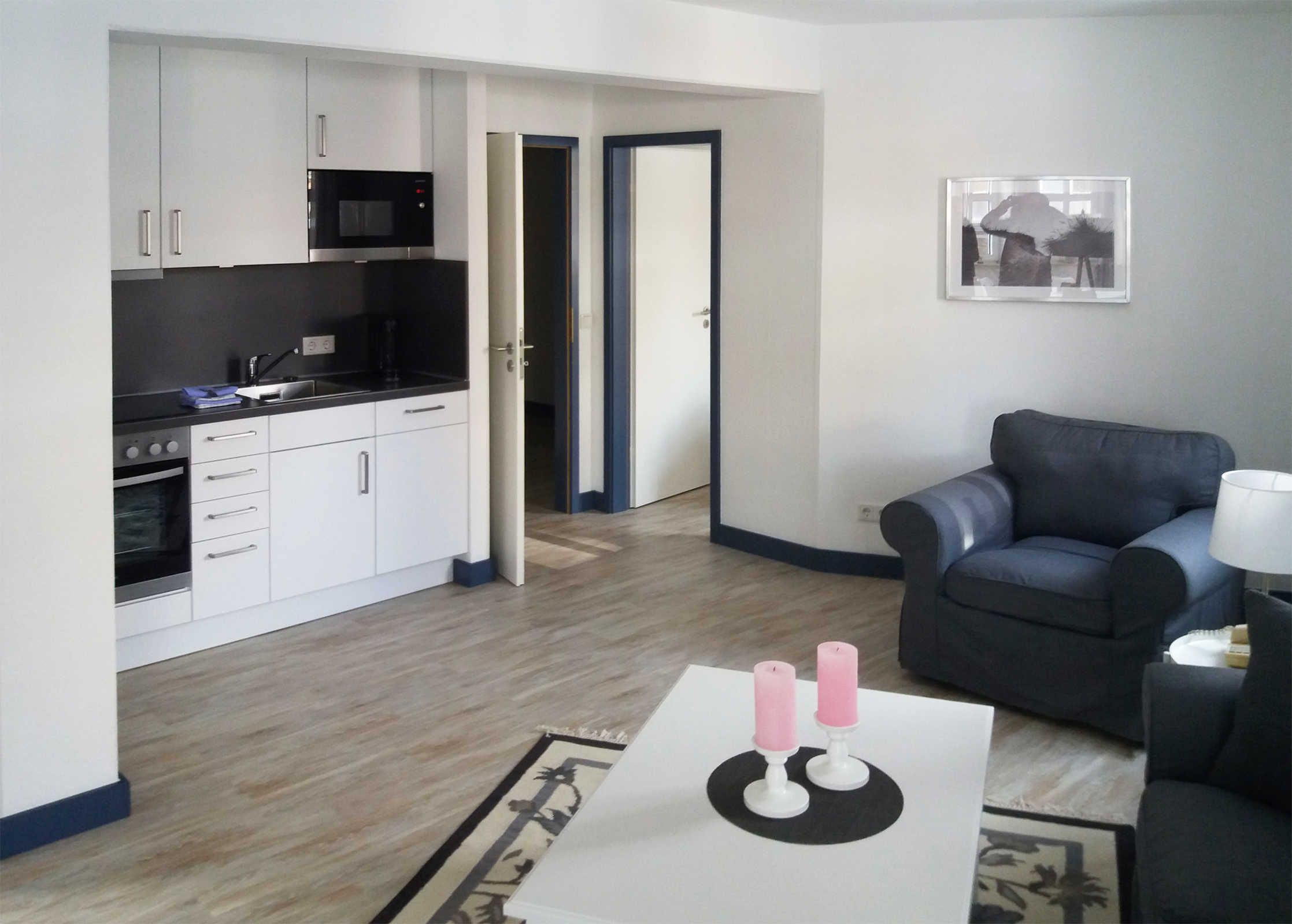 Komfortable Ferienwohnung mit großen Wohn/Essraum und integrierter Küche. 2 Schlafzimmer mit je einem Doppelbett von 160 x 200 m. Ein Trittbalkon vorhanden, Duschbad mit WC, WLAN vorhanden. Gut auch für Senioren geeignet, da die Wohnung per Aufzug zu erreichen ist.