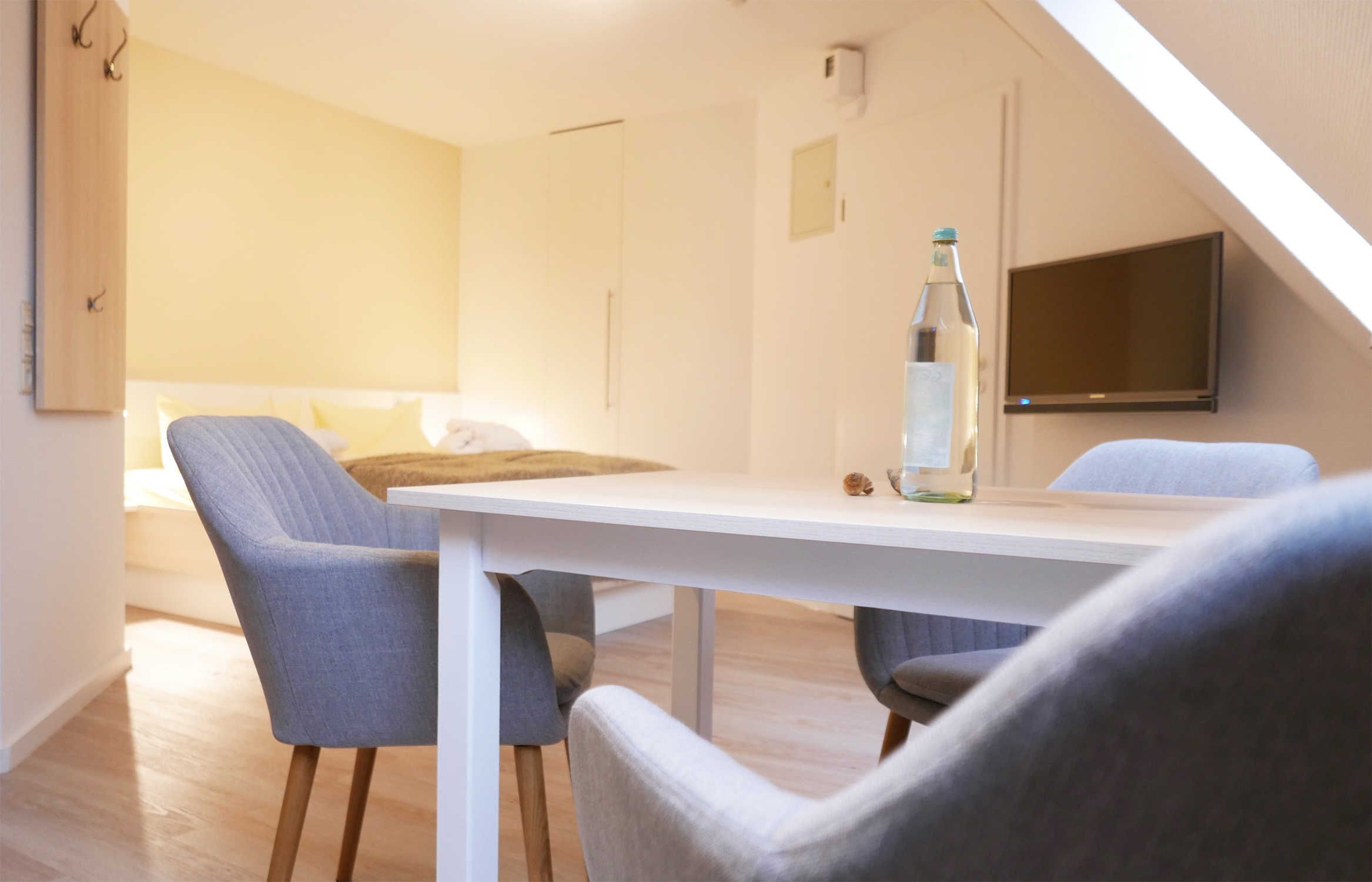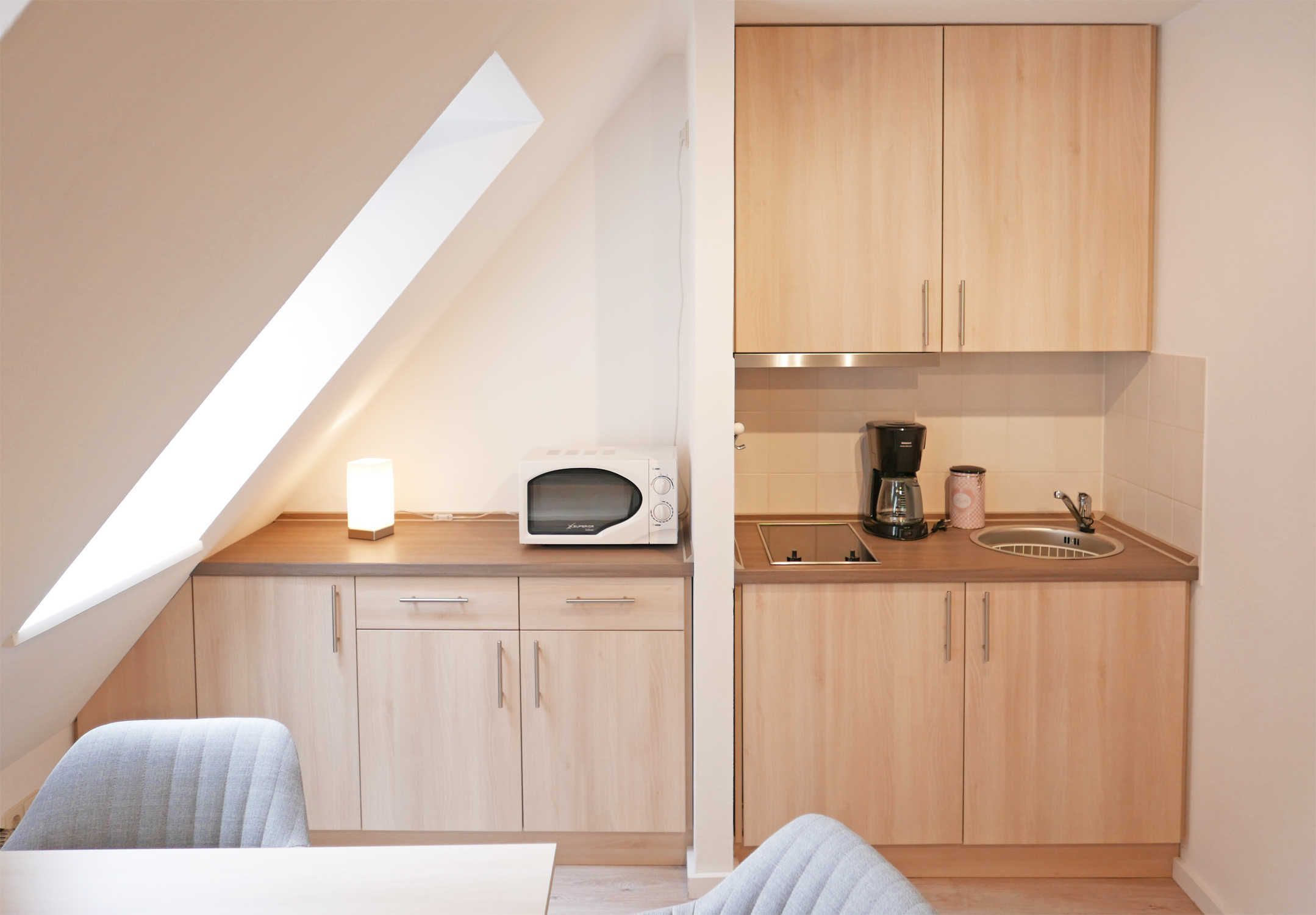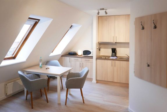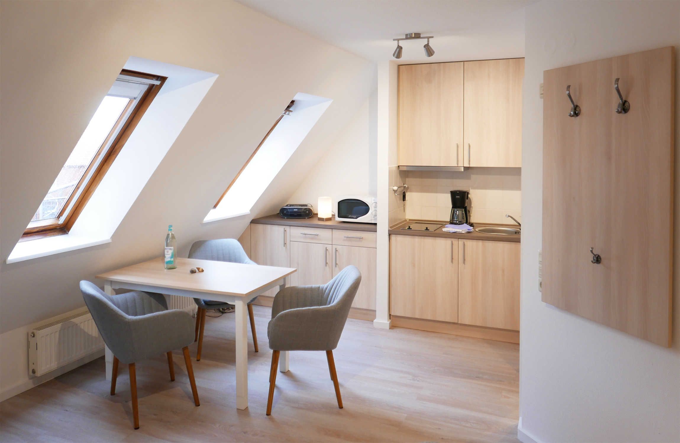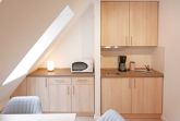 Studio für 2 Personen mit kleiner Küchenpantry in der Inselresidenz Strandburg mitten auf Juist, nur kurze Wege zum Strand und Hafen.