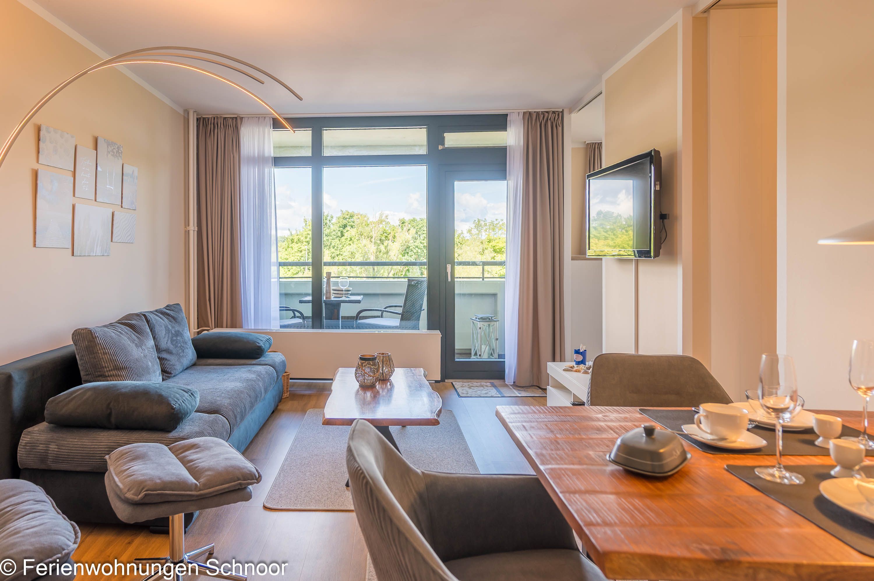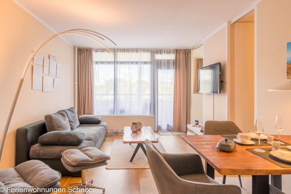 Der offene Wohn- und Essbereich ist lichtdurchflutet und verfügt über eine komfortable Couch, einen Sessel, einen LCD-Fernseher und einen Esstisch für drei Personen. Durch Gardinen kann der Raum abgedunkelt werden. Die angrenzende Küche ist mit einem Cerankochfeld, einem separaten Backofen auf Griffhöhe, einer Kühl- Gefrierkombination und einem Geschirrspüler ausgestattet. Auch eine Kaffeemaschine, ein Toaster und ein Wasserkocher sind vorhanden.
