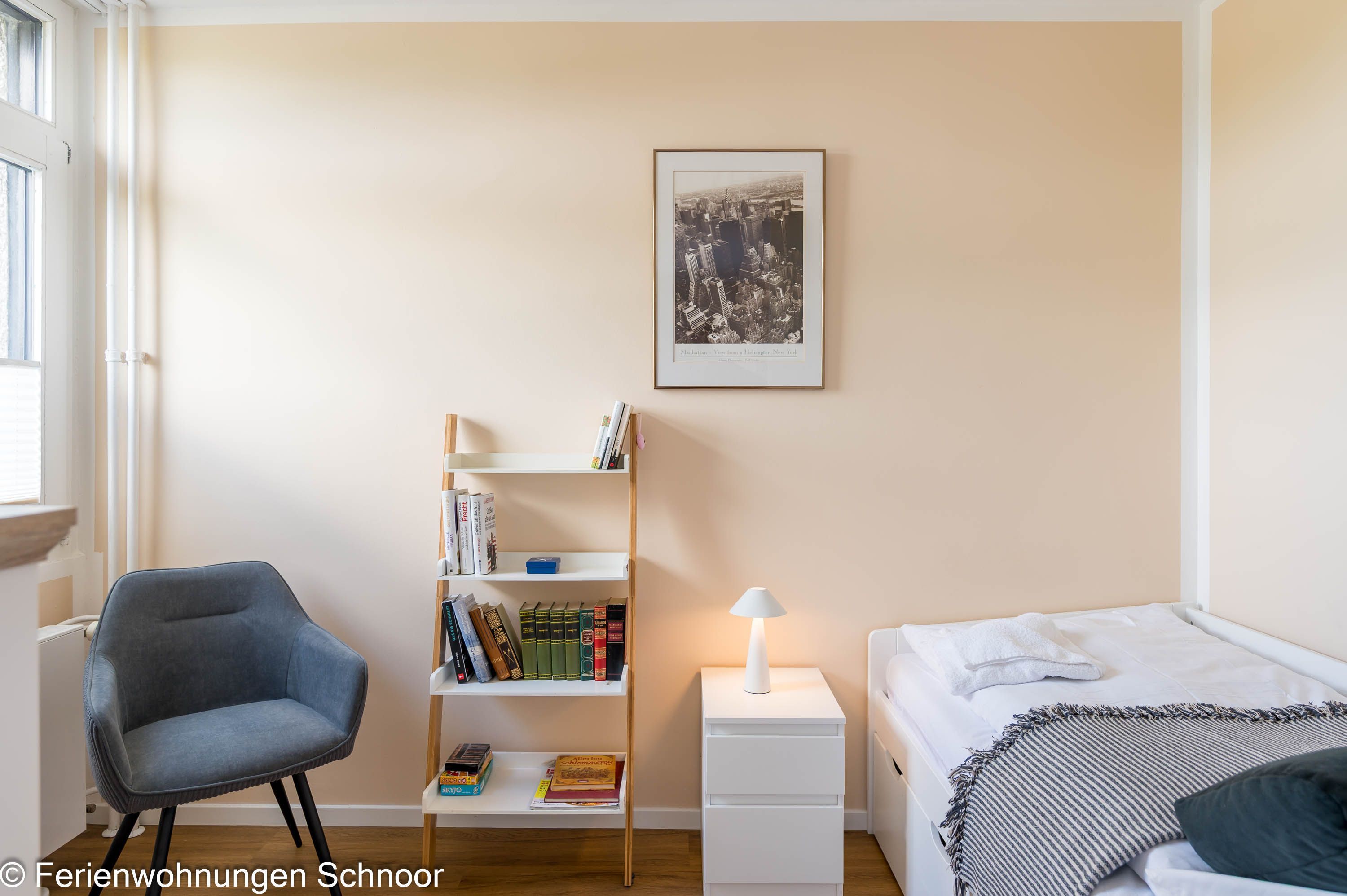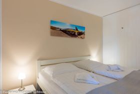 Der Schlafbereich mit einem gemütlichen Doppelbett (160x200) ist durch eine Wand vom Wohnraum abgetrennt. In einem separaten Zimmer gibt es einen Schreibtisch und ein Einzelbett (90x200) für eine dritte Person. Dieser Raum kann mit Plissees abgedunkelt werden. Das moderne Badezimmer verfügt über eine große Walk-in-Dusche, einen großen Spiegel und eine Handtuchheizung.