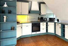 Die stilvolle und komfortable Einrichtung des Wohnzimmers mit Kaminofen sorgt für Luxus und Behaglichkeit. Die komplett eingerichtete hochwertige Küche bietet genügend Platz und besten technischen Komfort für Urlauber als Hobbyköche. Das extravagant eingerichtete Bad rundet, die in jeder Hinsicht außergewöhnliche Einrichtung und Ausstattung der Ferienwohnung ab.