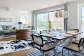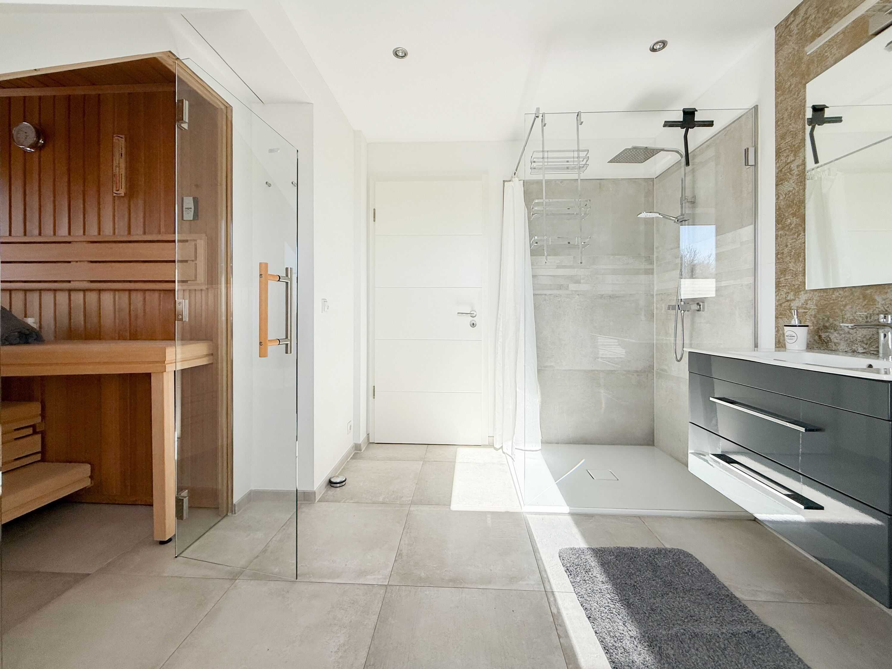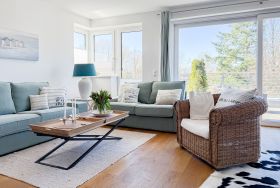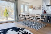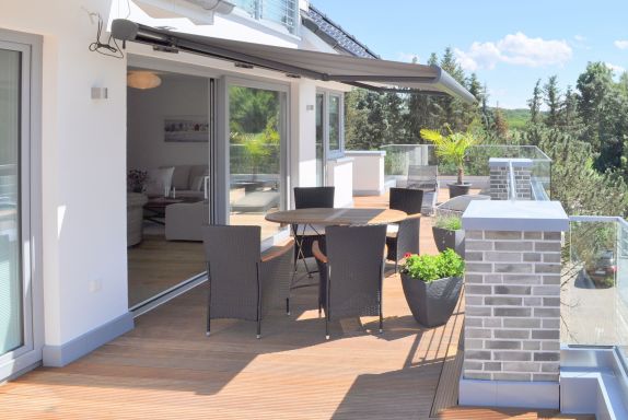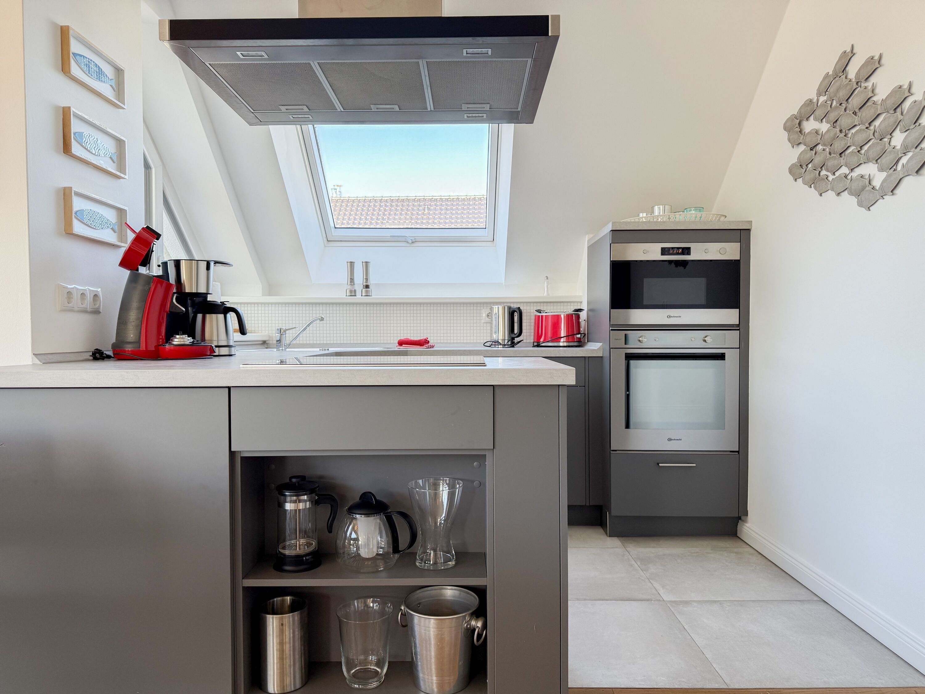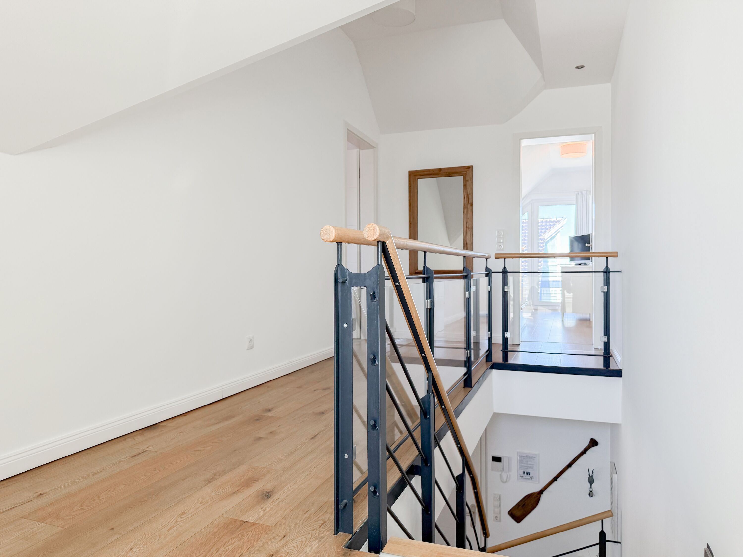 Das Penthouse ist hochwertig eingerichtet und bestens ausgestattet. Große, bodentiefe Fensterflächen durchfluten die Räumlichkeiten mit Tageslicht und sorgen für ein angenehmes Wohlfühlambiente – ideal für einen entspannten Ostseeurlaub. Ein besonderes Highlight ist die großzügige, über 50 m² große Dachterrasse in Südwestausrichtung. Hier lassen sich die frische Meeresluft und den Hafenblick genießen – ob auf den Sonnenliegen, an den Gartenmöbeln oder im Schatten der elektrischen Markise. Der offene Wohn- und Essbereich bietet viel Platz für gesellige Stunden. Ein Kaminofen (Holz nicht inklusive) sorgt für eine gemütliche Atmosphäre, und die moderne Einbauküche mit Kochinsel ist mit allen wichtigen Geräten ausgestattet – perfekt für alle, die gerne gemeinsam kochen. Auf der unteren Wohnebene befindet sich eines der beiden stilvollen Bäder mit Dusche und Waschtisch sowie eine Sauna mit Blick ins Grüne. Die obere Ebene beherbergt zwei separate Schlafzimmer mit Doppelbetten (180x200 und 140x200 plus Schlafsessel), Verdunkelungsvorhängen und TV. Das kleine Schlafzimmer punktet mit einem tollen Blick auf den Hafen. Ein weiteres Badezimmer mit Badewanne rundet den Komfort ab. Das Penthouse bietet auf über 100 m² einen herrlichen Rückzugsort für 2-4 Personen mit der ganz besonderen Atmosphäre des Hafens.