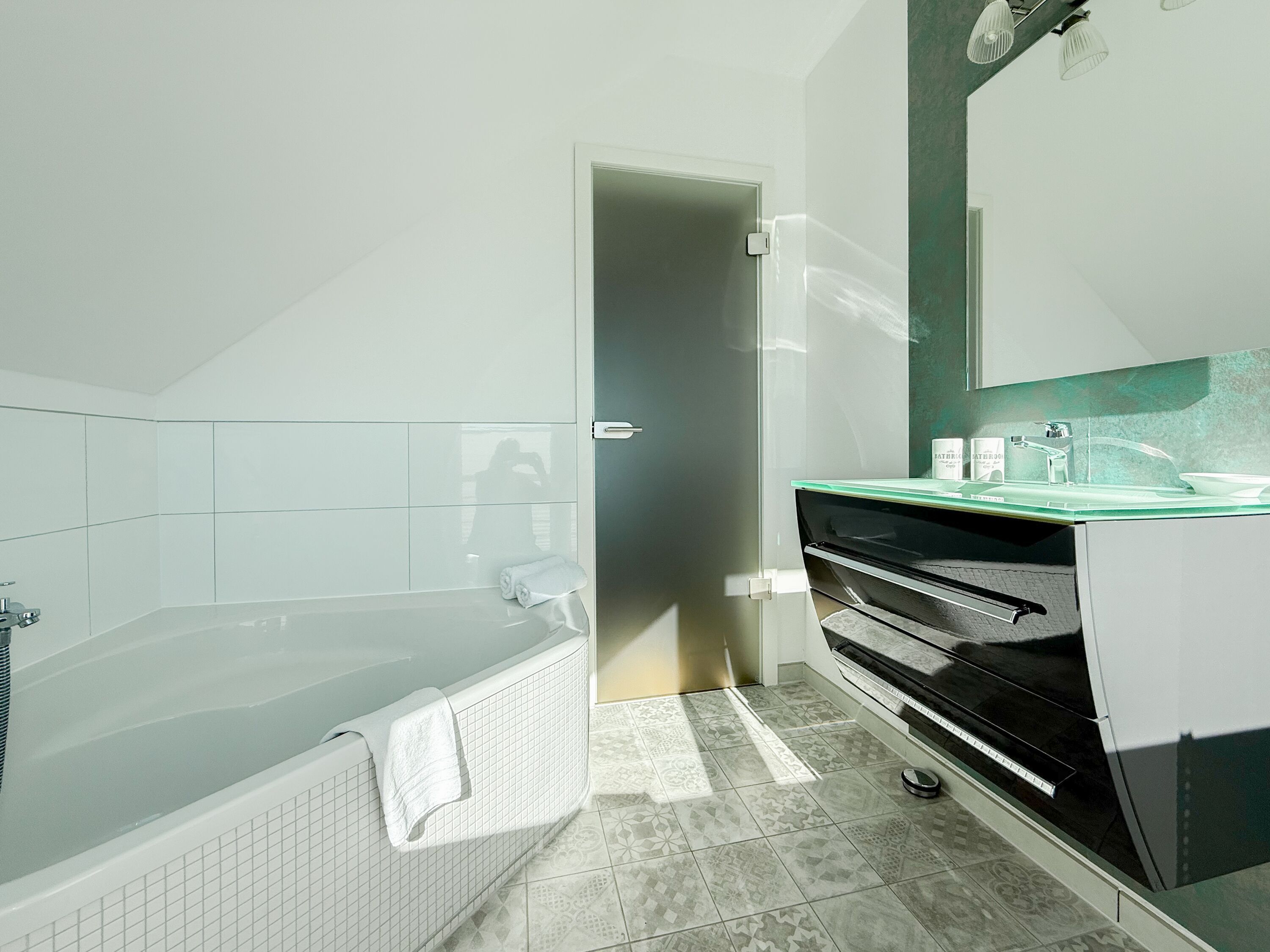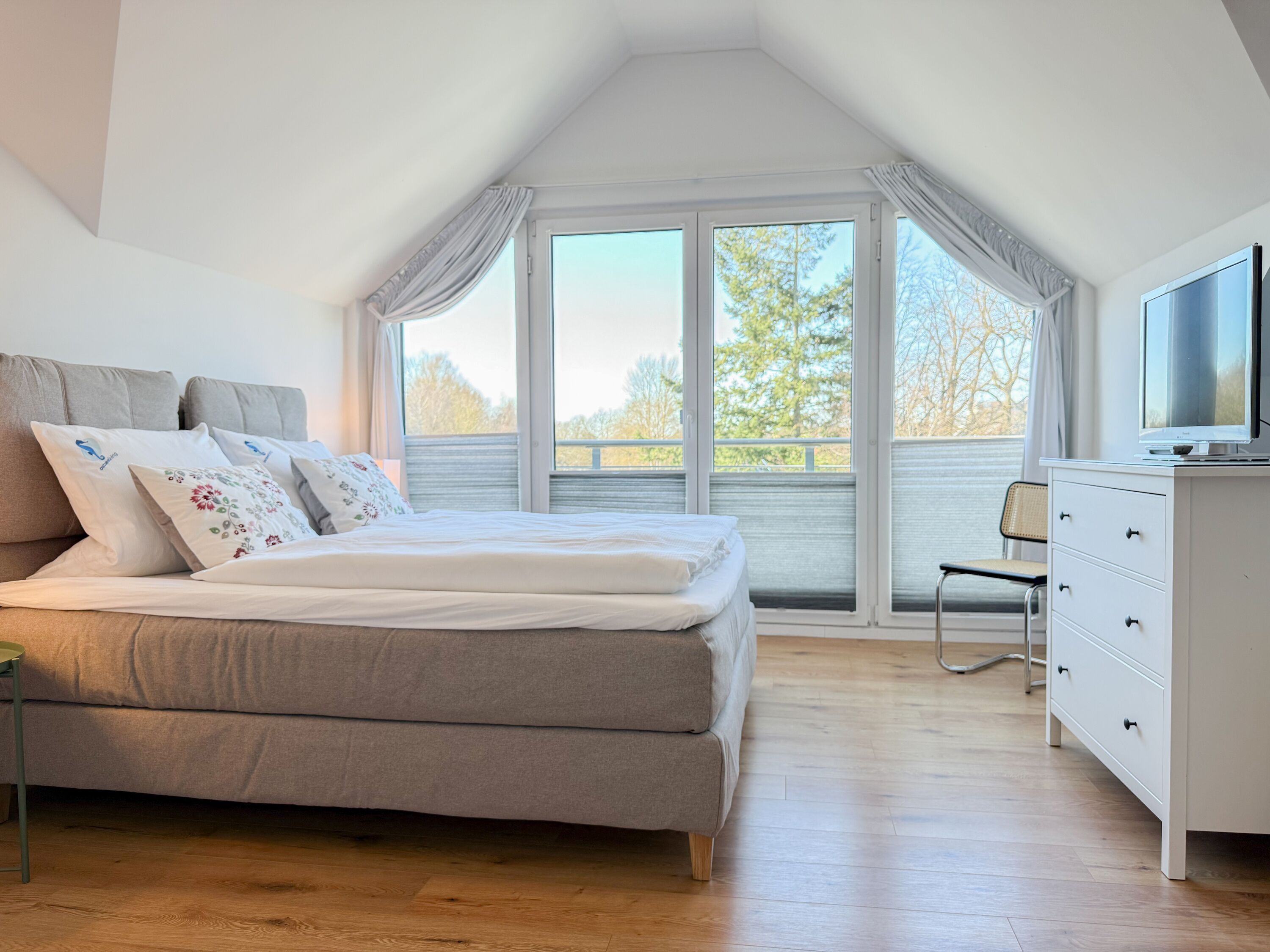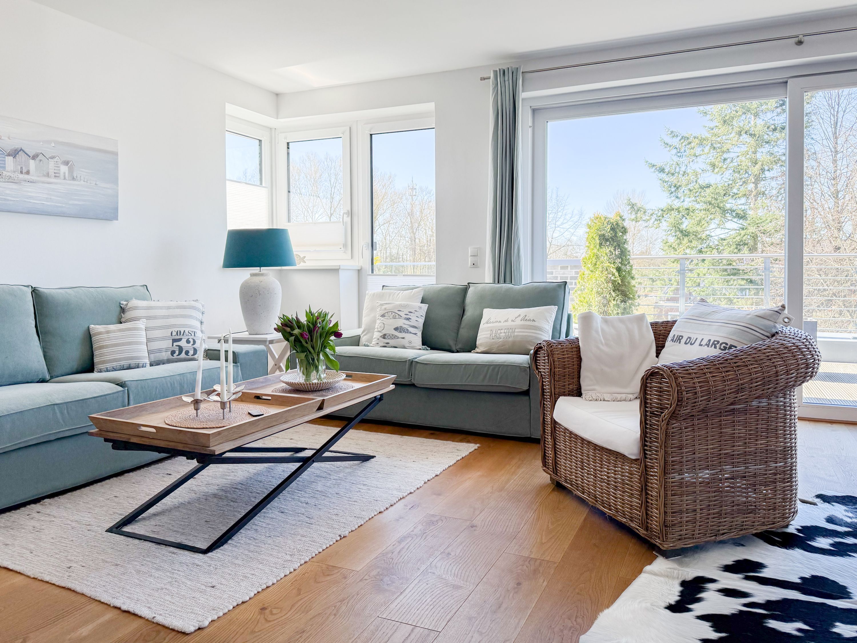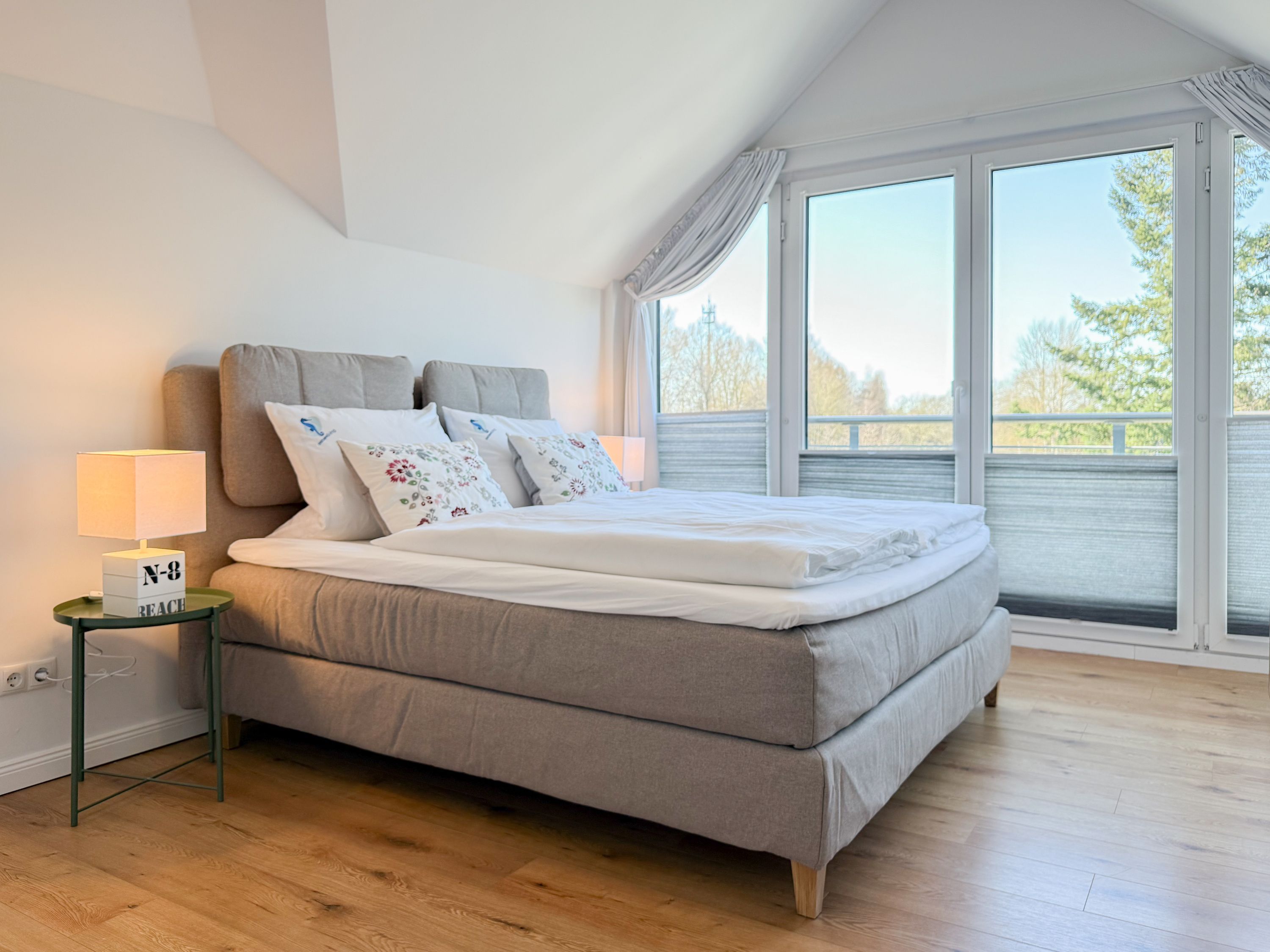 Das Penthouse ist hochwertig eingerichtet und bestens ausgestattet. Große, bodentiefe Fensterflächen durchfluten die Räumlichkeiten mit Tageslicht und sorgen für ein angenehmes Wohlfühlambiente ideal für einen entspannten Ostseeurlaub. Ein besonderes Highlight ist die großzügige, über 50 m² große Dachterrasse in Südwestausrichtung. Hier lassen sich die frische Meeresluft und den Hafenblick genießen ob auf den Sonnenliegen, an den Gartenmöbeln oder im Schatten der elektrischen Markise. Der offene Wohn- und Essbereich bietet viel Platz für gesellige Stunden. Ein Kaminofen (Holz nicht inklusive) sorgt für eine gemütliche Atmosphäre, und die moderne Einbauküche mit Kochinsel ist mit allen wichtigen Geräten ausgestattet perfekt für alle, die gerne gemeinsam kochen. Auf der unteren Wohnebene befindet sich eines der beiden stilvollen Bäder mit Dusche und Waschtisch sowie eine Sauna mit Blick ins Grüne. Die obere Ebene beherbergt zwei separate Schlafzimmer mit Doppelbetten (180x200 und 140x200 plus Schlafsessel), Verdunkelungsvorhängen und TV. Das kleine Schlafzimmer punktet mit einem tollen Blick auf den Hafen. Ein weiteres Badezimmer mit Badewanne rundet den Komfort ab. Das Penthouse bietet auf über 100 m² einen herrlichen Rückzugsort für 2-4 Personen mit der ganz besonderen Atmosphäre des Hafens.