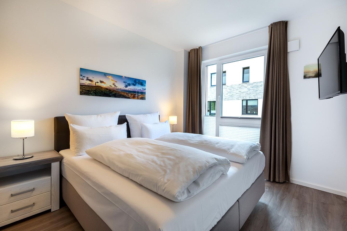 Das helle und moderne Nichtraucher-Apartment verfügt über Fußbodenheizung, bodentiefe Fenster mit 3-fach Isolierung, kostenfreies WLAN und eine voll ausgestattete offene Küche mit Geschirrspüler, Gefrierfach, Kaffeemaschine, Toaster, Wasserkocher, Backofen und Mikrowelle sowie über einen Essbereich. Im Wohnbereich befindet sich eine Doppelschlafcouch (1,60 x 2,00 m) und ein großer Flatscreen-TV mit Blu-ray-Player. Das separate Schlafzimmer ist mit einem modernen Boxspringbett (1,80 x 2,00 m) und einem Flatscreen-TV ausgestattet. Ein Kinderbett kann gegen Entgelt im Wohnbereich aufgestellt werden und auf Wunsch könnt Ihr einen Kinderhochstuhl hinzubuchen. Im stilvollen Badezimmer befinden sich eine ebenerdige Dusche, ein Waschtisch mit Föhn, Kosmetikspiegel und Handtuchheizkörper. Das Apartment verfügt über einen Flur mit Garderobe sowie über zwei Kofferböcke für ein komfortables Aus- und Einpacken Ihres Urlaubsgepäcks. Auf dem mit Gartenmöbeln, Sonnenschirm sowie zwei Liegestühlen ausgestatteten Balkon könnt ihr nach Lust und Laune die Sonne genießen, die hier bis in den Abend scheint. Der Balkon ist vom Wohnbereich aus begehbar. Bis auf eine Schwelle zum Balkon ist das Apartment barrierefrei konzipiert.