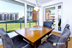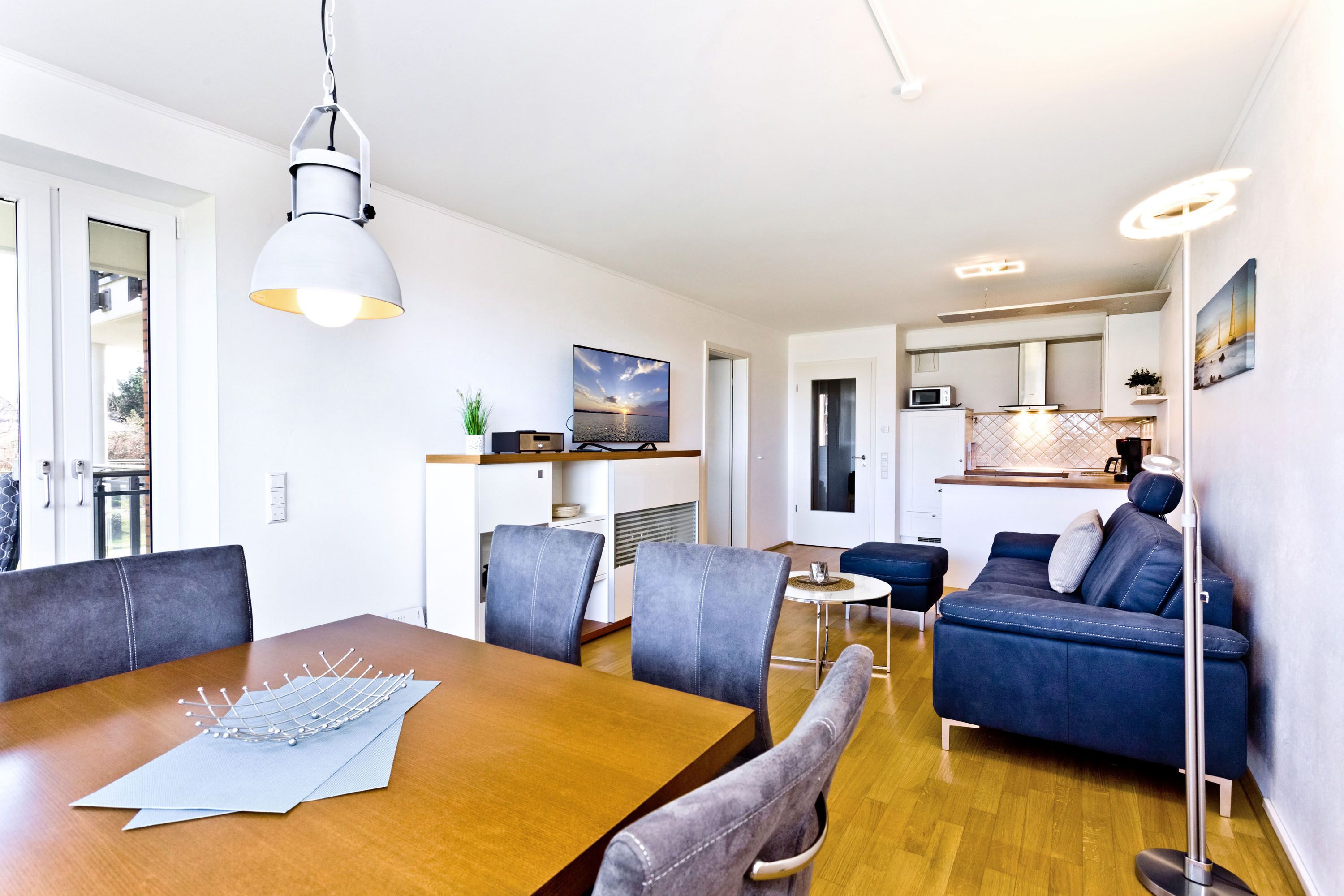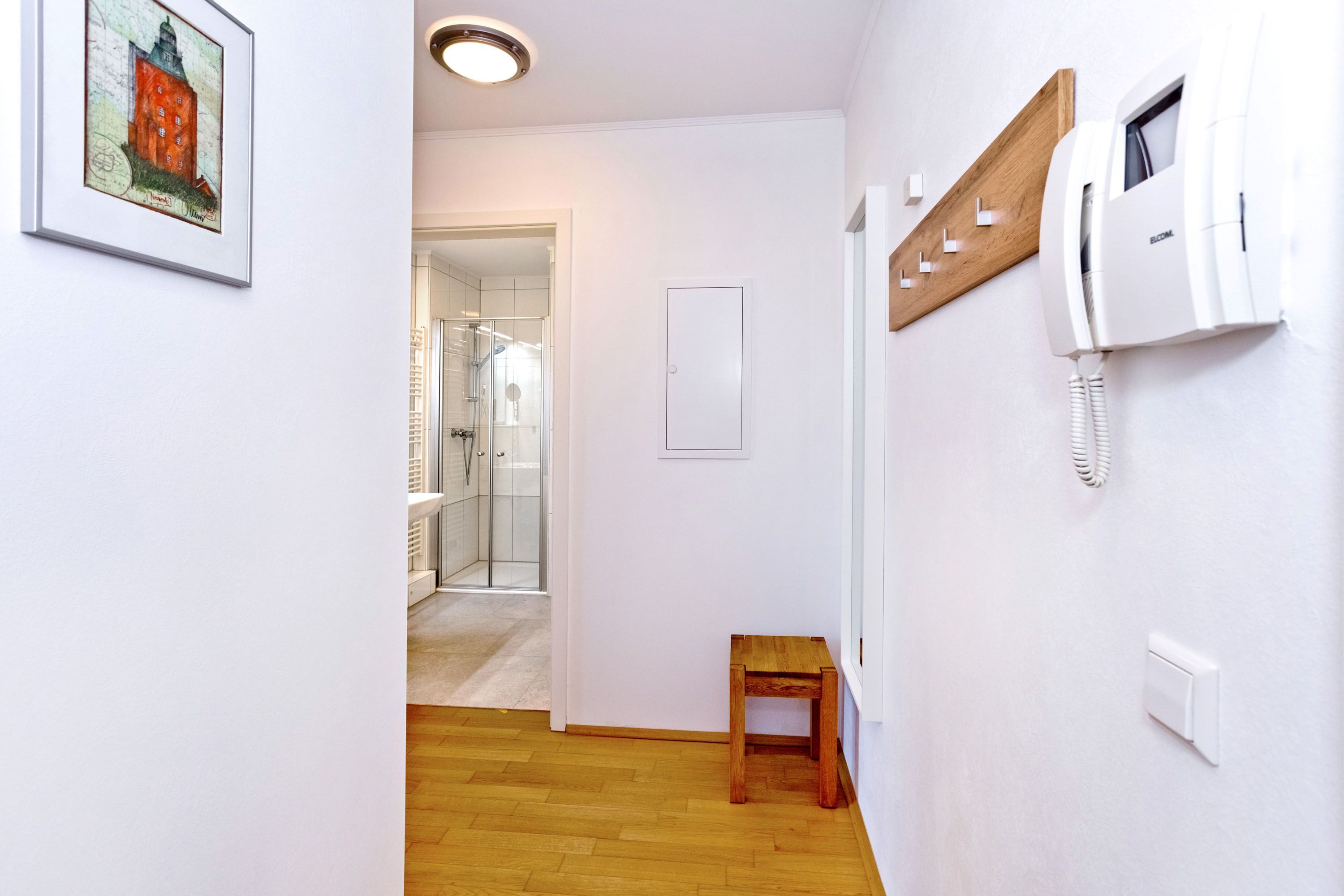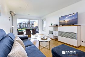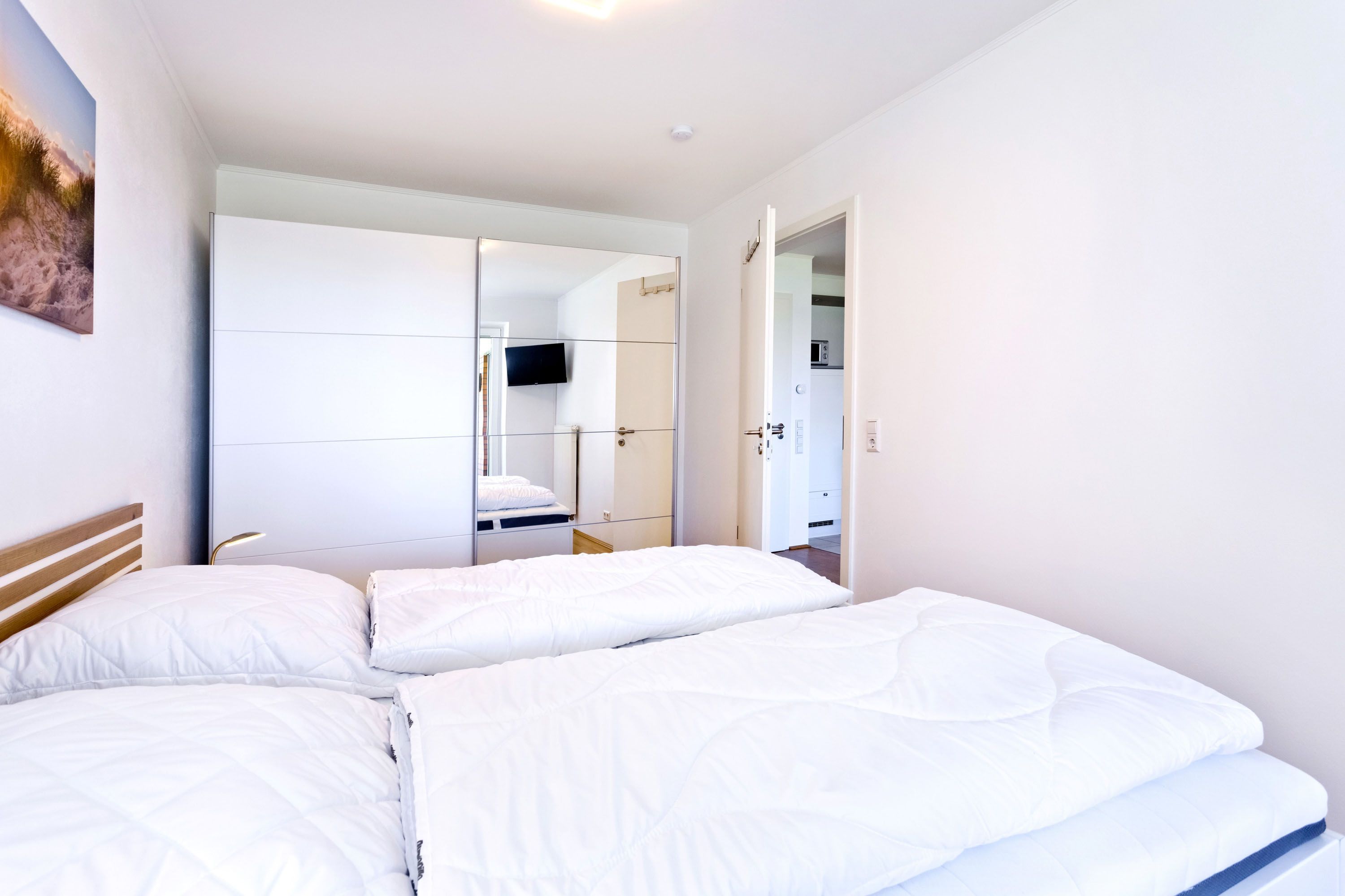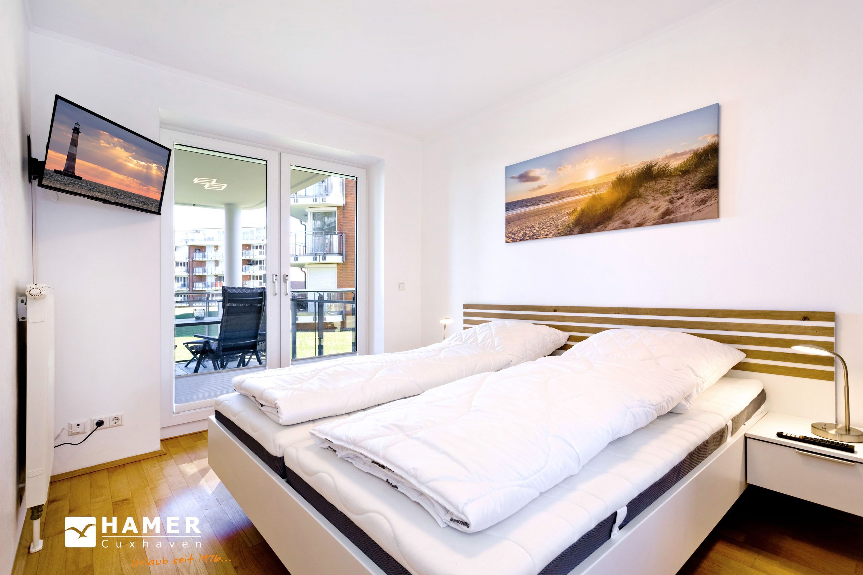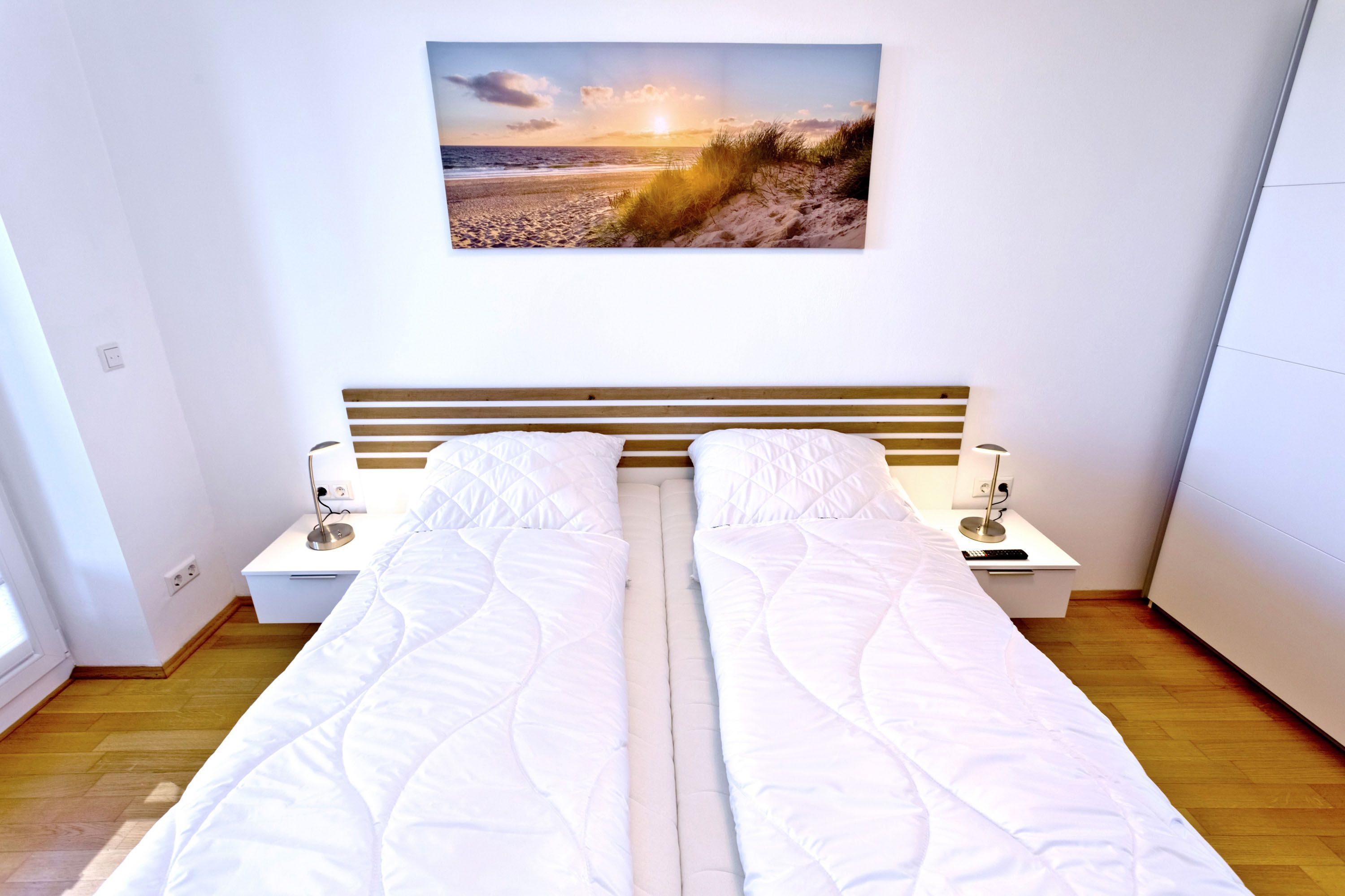 1 Schlafzimmer mit komfortablen Doppelbetten (2x Bettwäsche inkl.) und Außenjalousien an allen Fenstern, ebenerdige Dusche/WC, Wohnzimmer mit großer Küchenzeile (Backofen, Geschirrspüler, Mikrowelle), 2x Kabel-TV, Radio, kostenfreies W-LAN-Internet (eigener Anschluss), schöner Balkon (nord/ost) mit voller Seesicht, Personenaufzug, die Wohnung ist barrierefrei erreichbar, Klingel mit Sprechanlage und Kamera, reservierter Pkw-Stellplatz in der Tiefgarage #118 inkl., Fahrradkeller, Waschraum mit Waschmaschine/Trockner geg. Gebühr (7x Euro0,50 = 1 Gang), es sind keine Haustiere erlaubt und natürlich Nichtraucher.