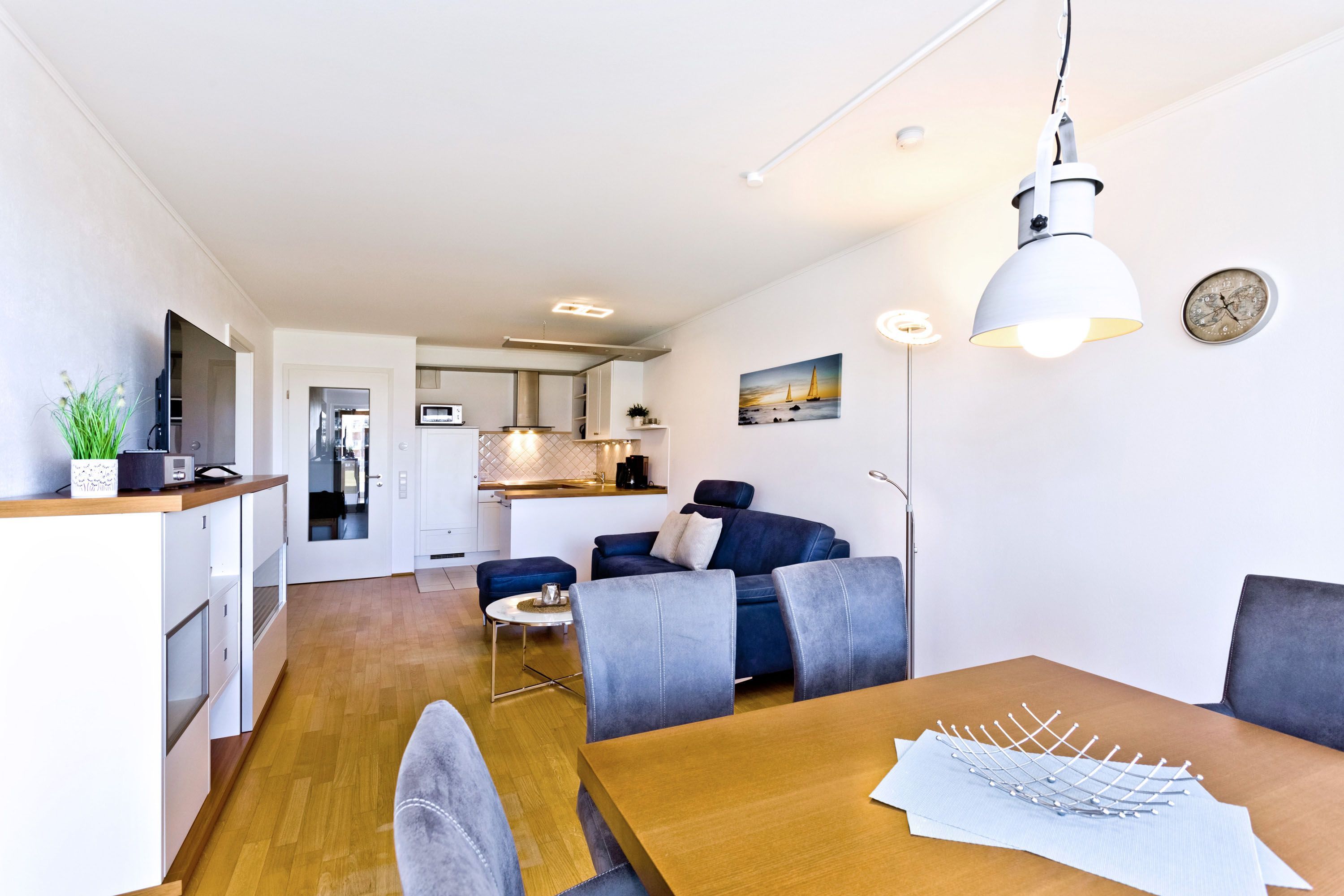 1 Schlafzimmer mit komfortablen Doppelbetten (2x Bettwäsche inkl.) und Außenjalousien an allen Fenstern, ebenerdige Dusche/WC, Wohnzimmer mit großer Küchenzeile (Backofen, Geschirrspüler, Mikrowelle), 2x Kabel-TV, Radio, kostenfreies W-LAN-Internet (eigener Anschluss), schöner Balkon (nord/ost) mit voller Seesicht, Personenaufzug, die Wohnung ist barrierefrei erreichbar, Klingel mit Sprechanlage und Kamera, reservierter Pkw-Stellplatz in der Tiefgarage #118 inkl., Fahrradkeller, Waschraum mit Waschmaschine/Trockner geg. Gebühr (7x €0,50 = 1 Gang), es sind keine Haustiere erlaubt und natürlich Nichtraucher.