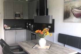 Das Haus bietet Platz für 4 Personen, hat 2 Schlafzimmer, ein Bad mit Dusche, einen modernen Wohn-Essbereich mit vollausgetatteter Küche und Schwedenofen. Durch die große Terrassenschiebetür gelangen Sie auf die Terrasse mit Grillkamin, Gartenmöbeln und Sonnenliegen. Der Garten ist eingezäunt.