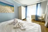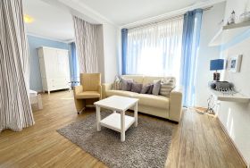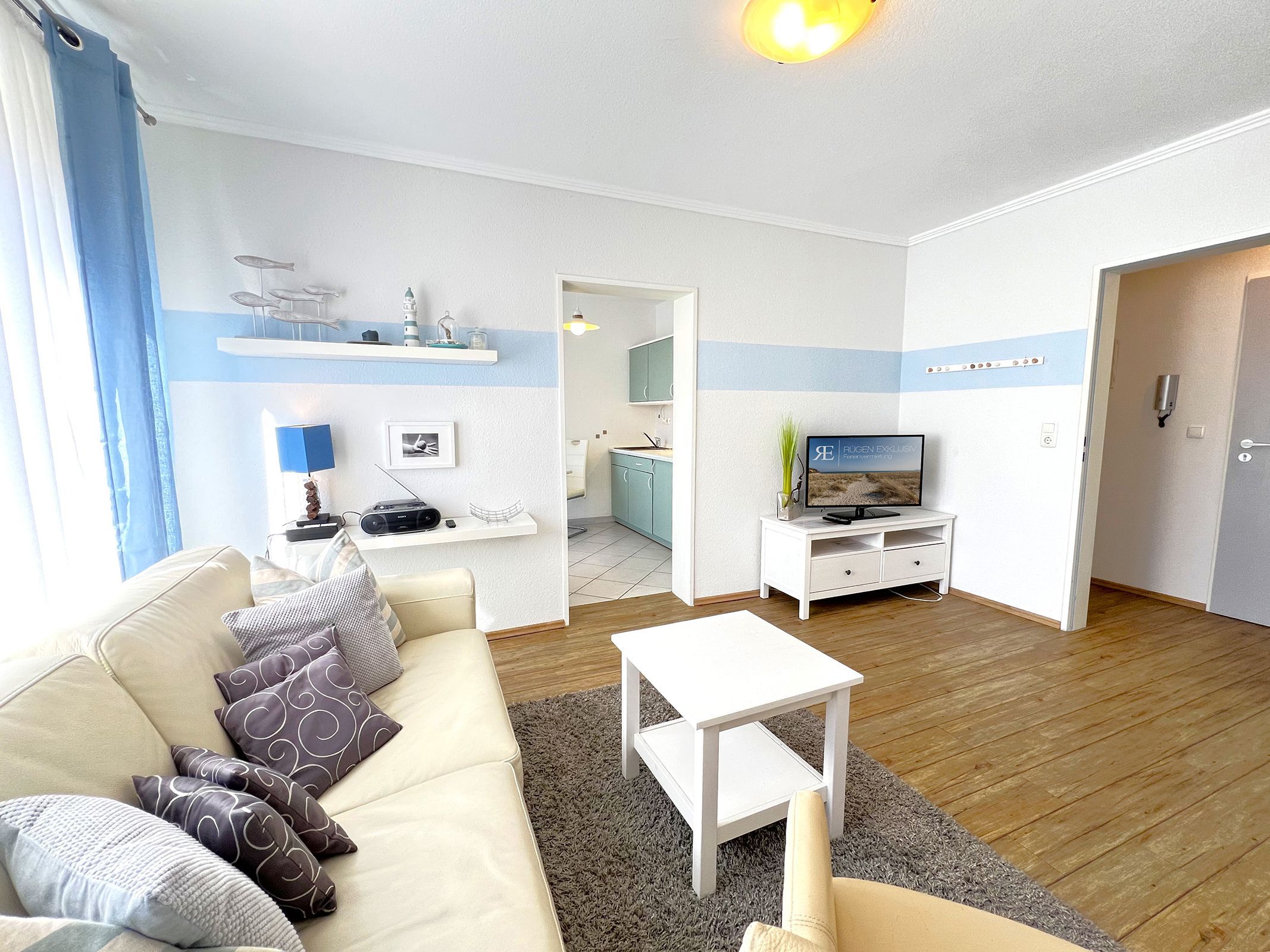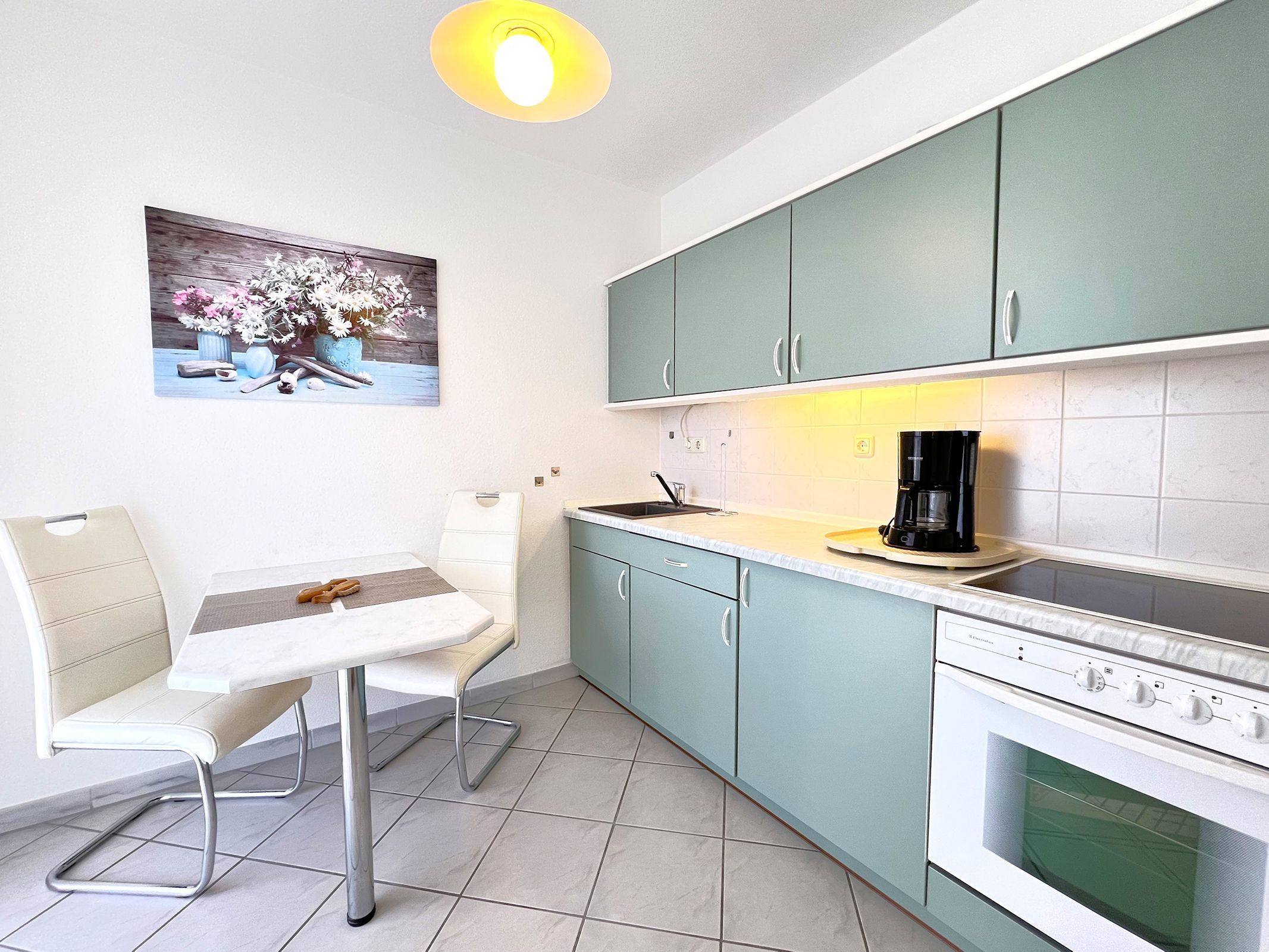 In der gut ausgestatteten, separaten Küche finden sich alle gängigen Geräte, darunter Herd, Backofen und Kühlschrank perfekt für die Zubereitung eigener Mahlzeiten. Von hier aus gelangt man direkt auf den Balkon, der einen schönen Platz bietet, um die frische Ostseeluft zu genießen.