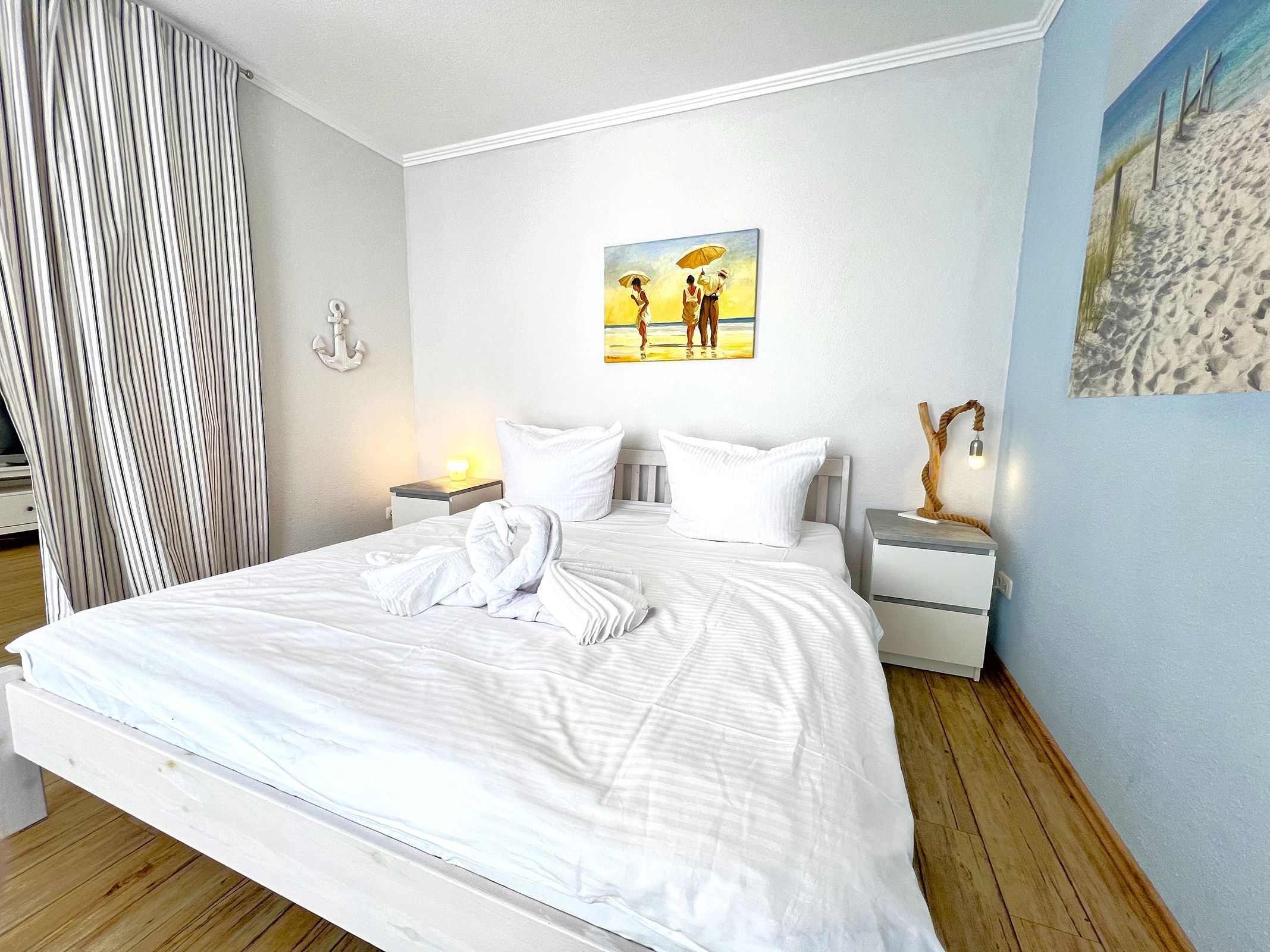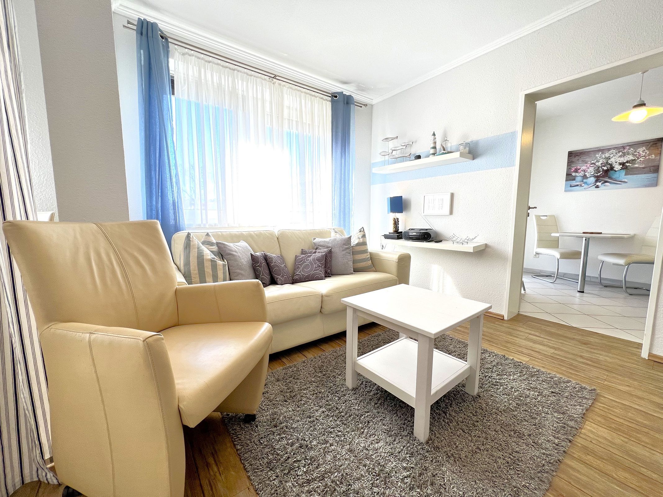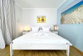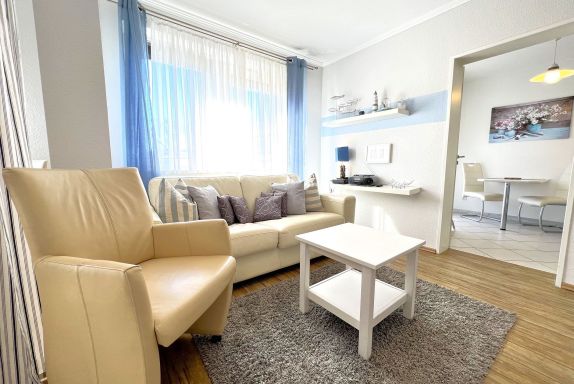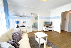 Die Ferienwohnung „Strandhafer“ ist eine gemütliche Einraumwohnung mit 45 m² Wohnfläche im 1. Obergeschoss ideal für zwei Personen. Der einladende Wohnbereich bietet eine komfortable Sitzecke und einen Fernseher, perfekt für entspannte Stunden. Das separate Schlafzimmer ist mit einem bequemen Doppelbett ausgestattet und sorgt für erholsamen Schlaf.