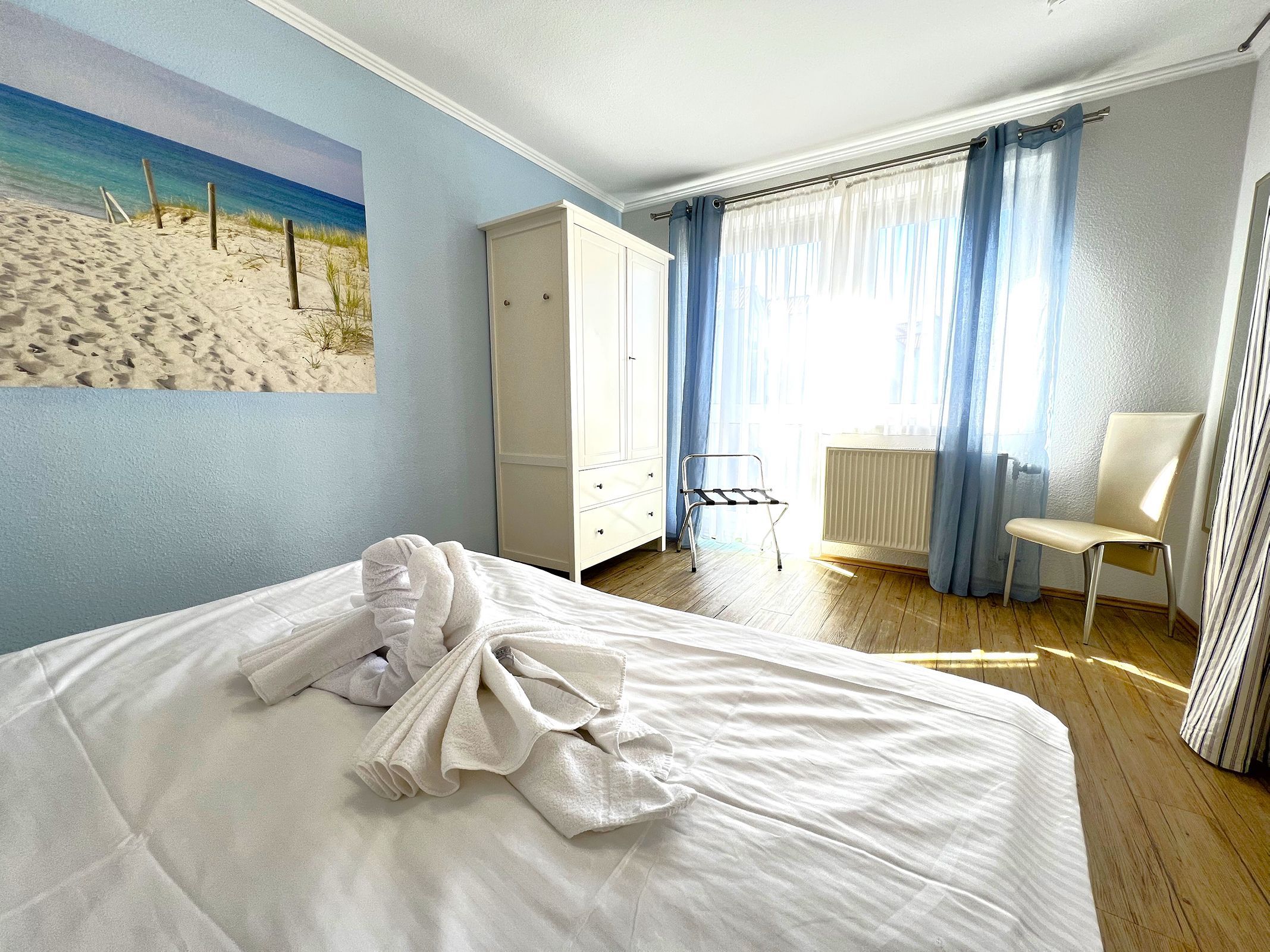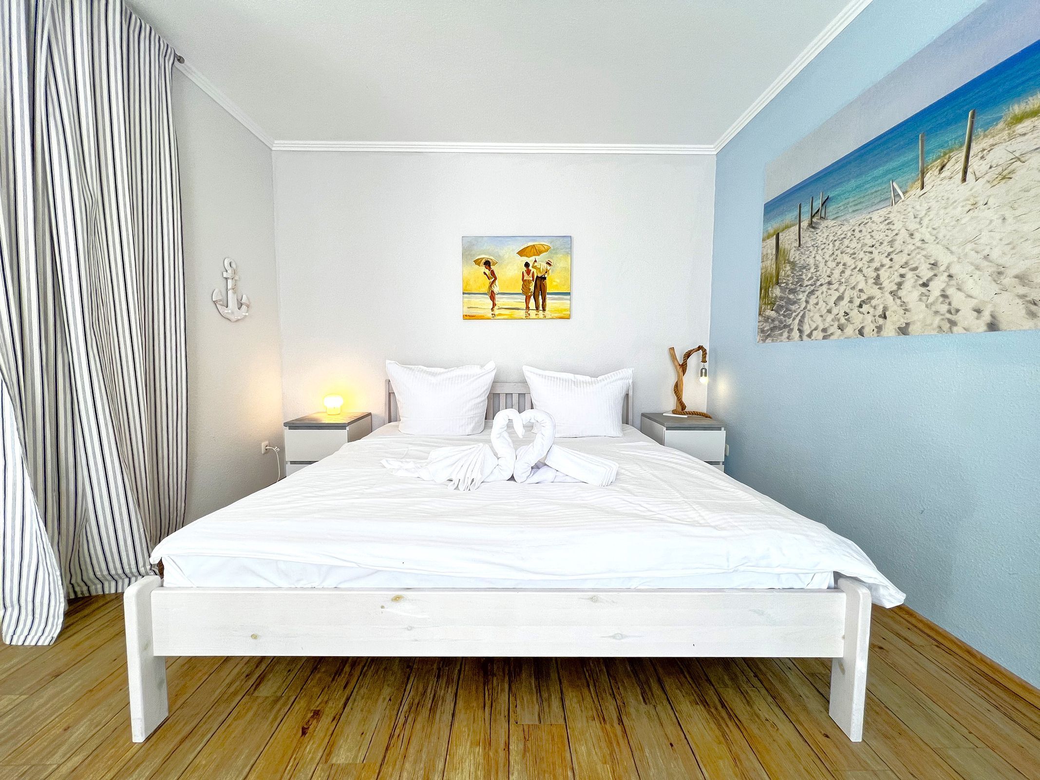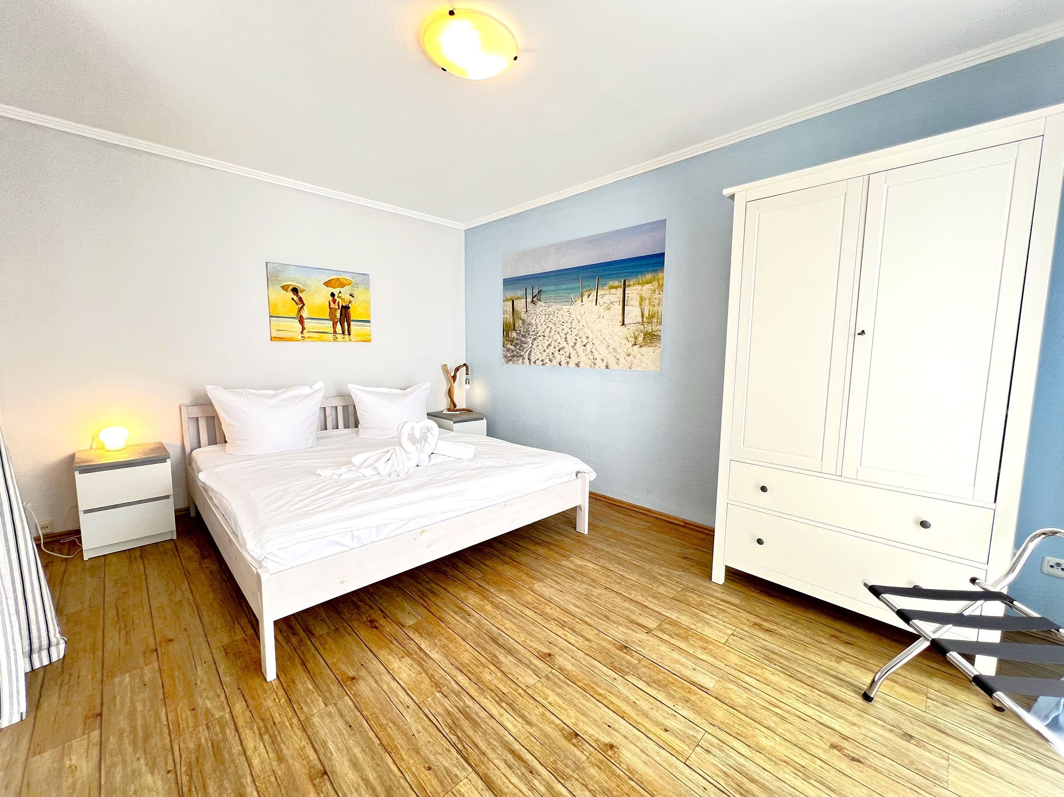 Die Ferienwohnung „Strandhafer“ ist eine gemütliche Einraumwohnung mit 45 m² Wohnfläche im 1. Obergeschoss ideal für zwei Personen. Der einladende Wohnbereich bietet eine komfortable Sitzecke und einen Fernseher, perfekt für entspannte Stunden. Das separate Schlafzimmer ist mit einem bequemen Doppelbett ausgestattet und sorgt für erholsamen Schlaf.