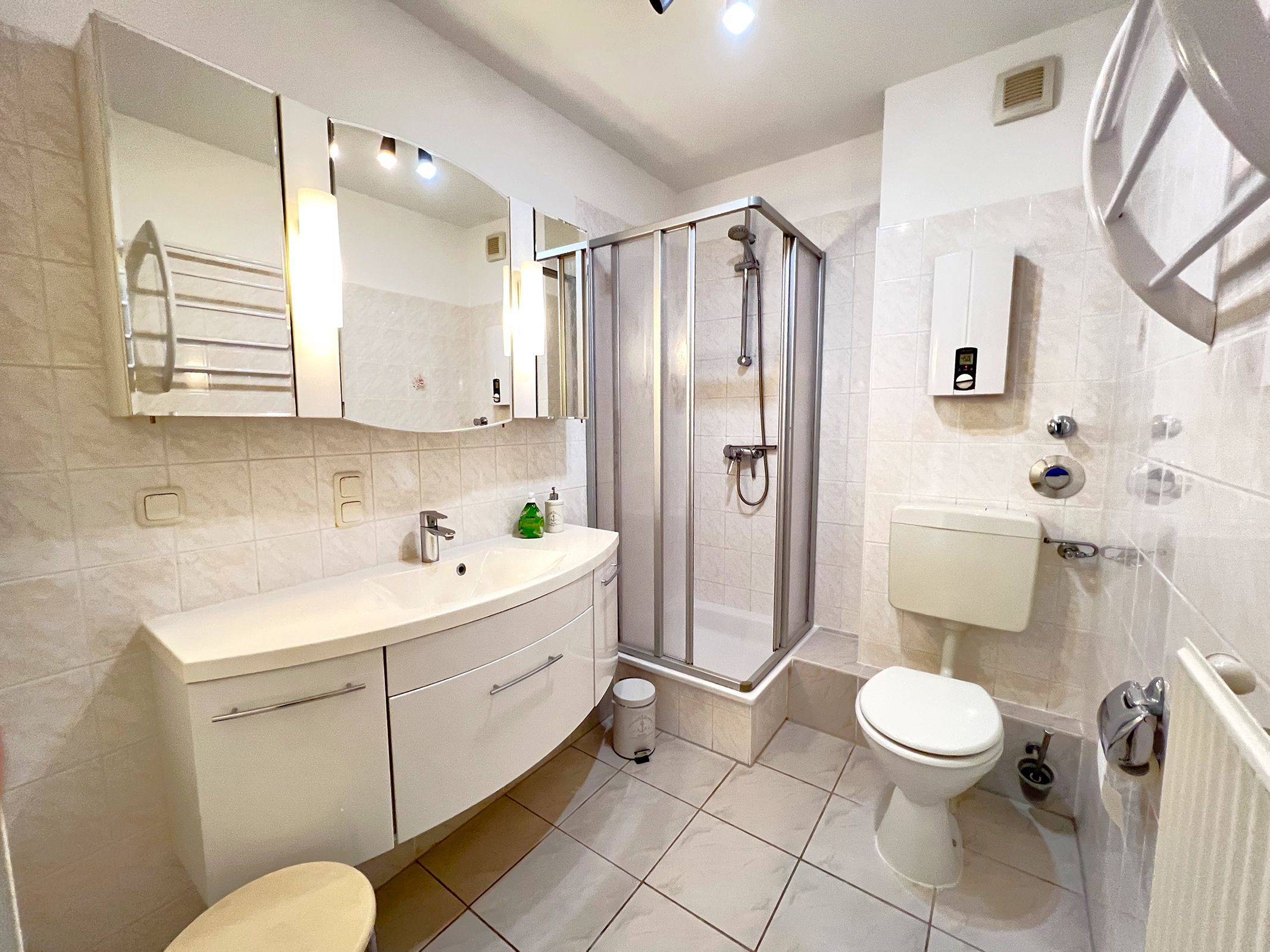 Das moderne Badezimmer mit Dusche bietet alles für einen angenehmen Start in den Tag. Die Ferienwohnung „Strandhafer“ ist ein wunderbarer Rückzugsort für alle, die zu zweit in stilvollem Ambiente einen entspannten Urlaub an der Ostsee verbringen möchten.
