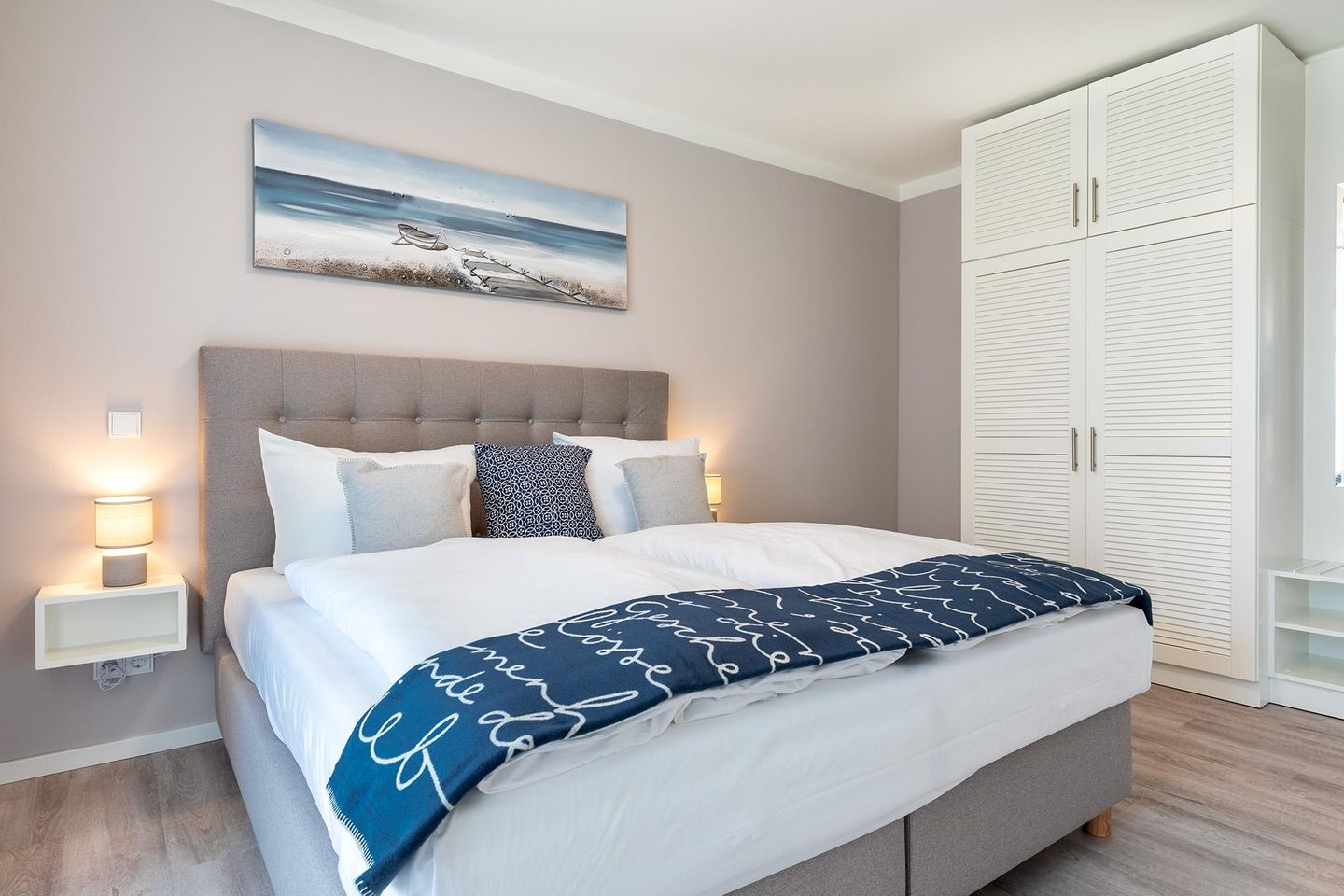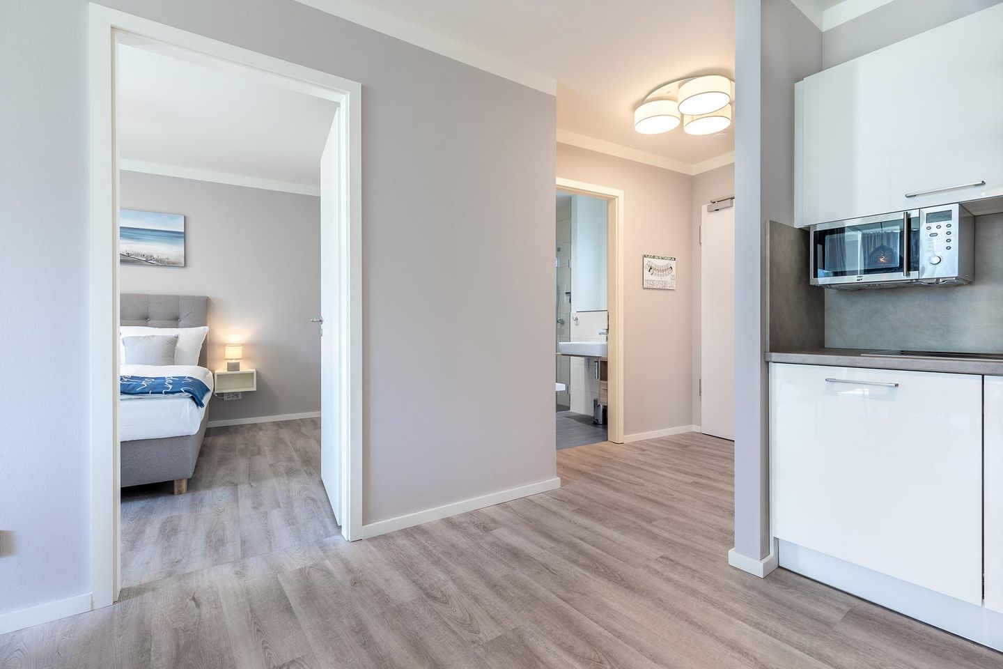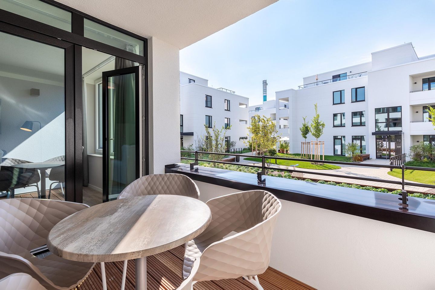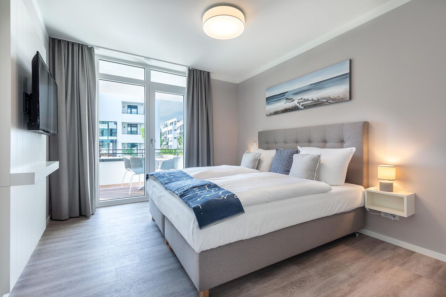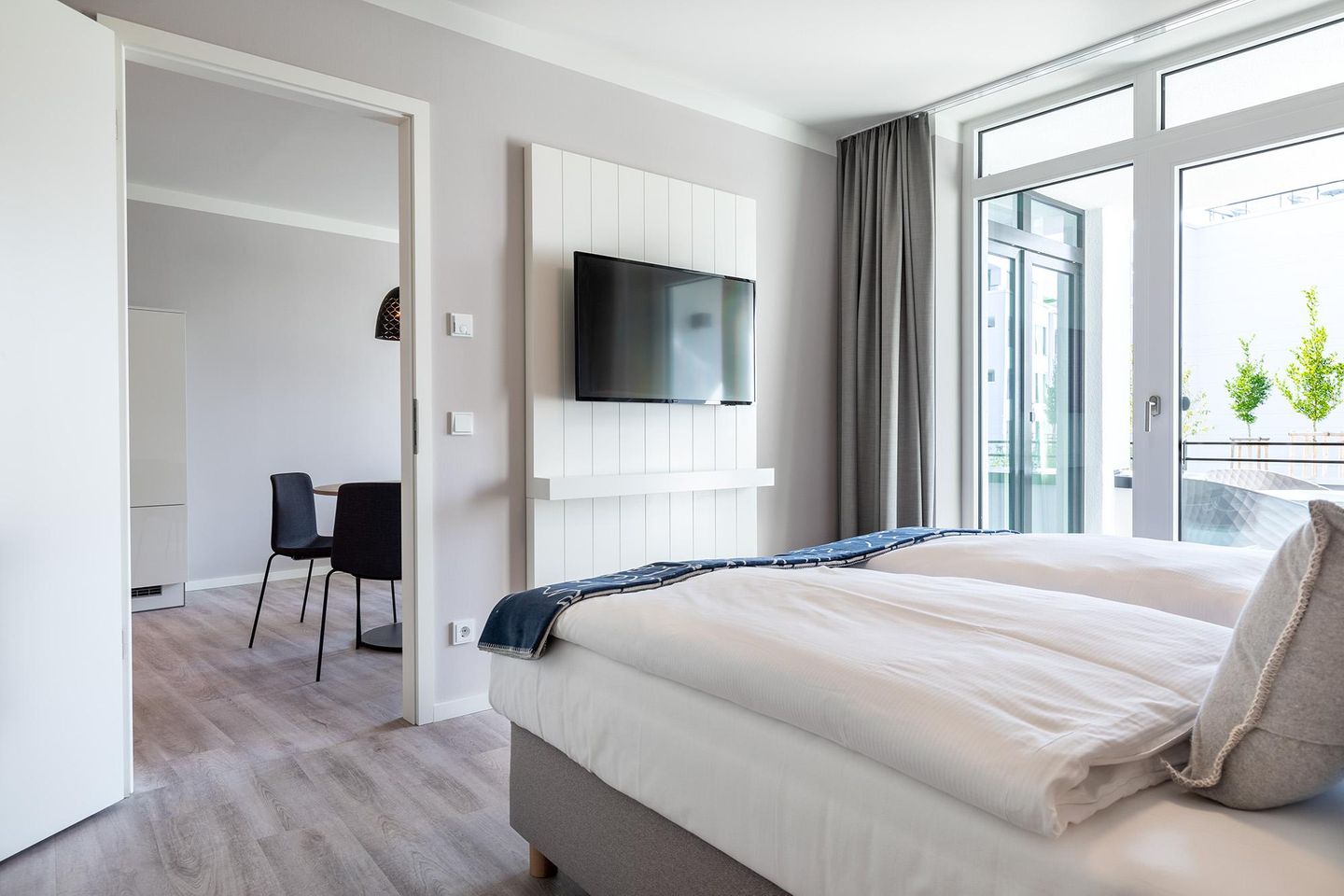 Das helle und moderne Nichtraucher-Apartment verfügt über Fußbodenheizung, sonnenschutzverglaste Fenster, kostenfreies WLAN und eine voll ausgestattete offene Küche mit Geschirrspüler, Gefrier- und Kühlschrankkombination, Kaffeemaschine, Toaster, Wasserkocher, Mikrowelle, Herd mit Glaskeramikkochfeld und Backofen sowie über einen behaglichen Wohn-Essbereich. Im Wohnbereich befindet sich eine Doppelschlafcouch (1,40 x 2,00 m) und ein SMART-TV (43 Zoll). Im separaten Schlafzimmer bietet ein modernes Boxspringbett (1,80 x 2,00 m) hohen Schlafkomfort. Auch hier befindet sich ein SMART-TV (43 Zoll). Im stilvollen Badezimmer stehen euch eine ebenerdige Dusche, WC, Waschtisch mit Föhn, Handtuchheizkörper und Fußbodenheizung zur Verfügung. Entspannte, sonnige Stunden verbringt ihr auf der überdachten Loggia, die mit Gartenmöbeln ausgestattet ist. Die Loggia ist sowohl vom Wohnbereich als auch vom Schlafzimmer aus zugänglich.