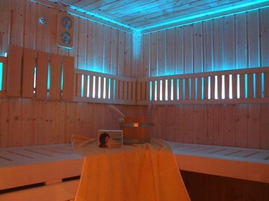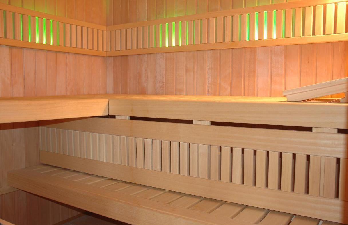 Der separate Wellnessraum mit Zugang zur Terrasse bietet: Sauna mit Farblicht, Dusche und Ruhezone.