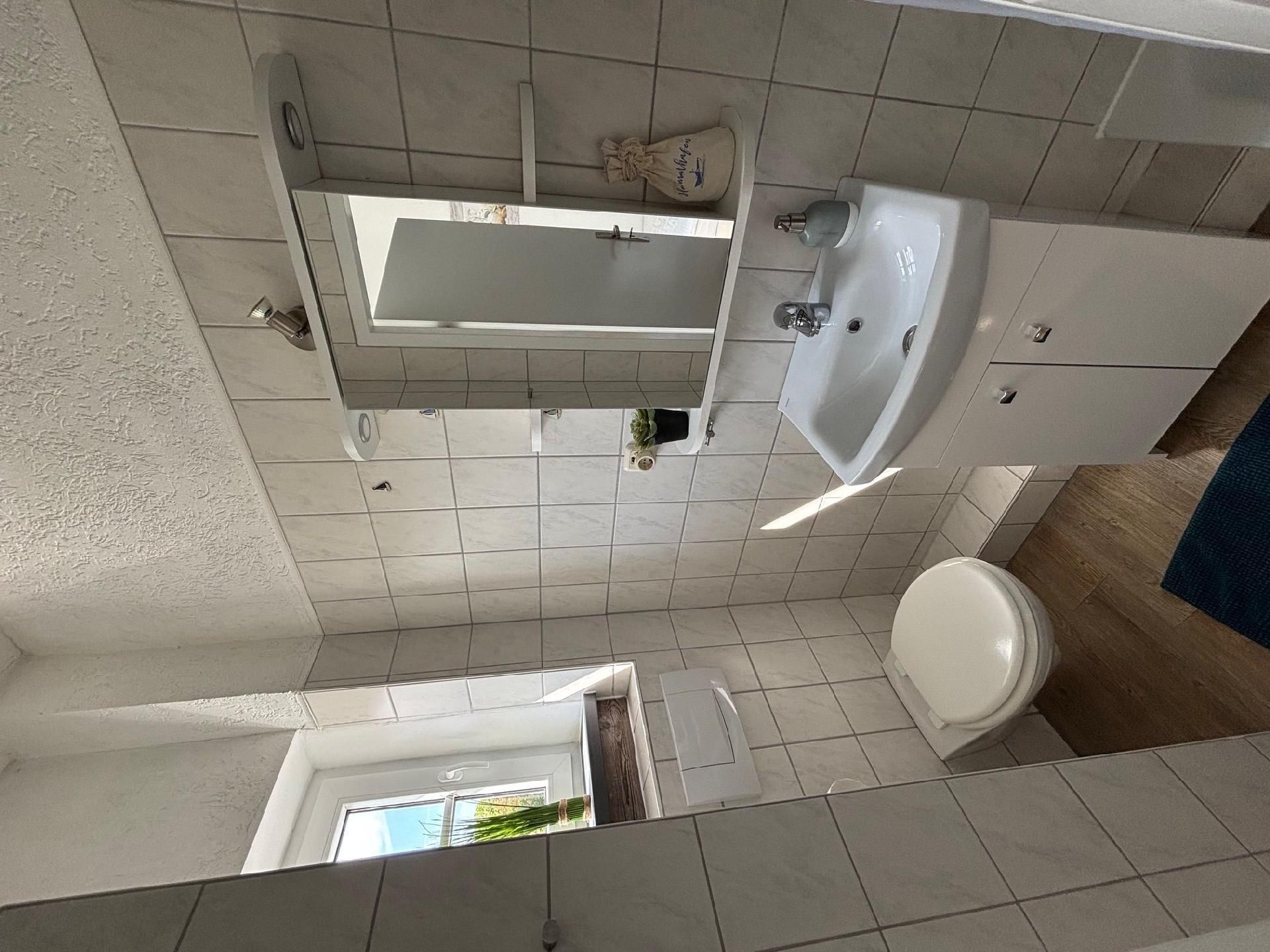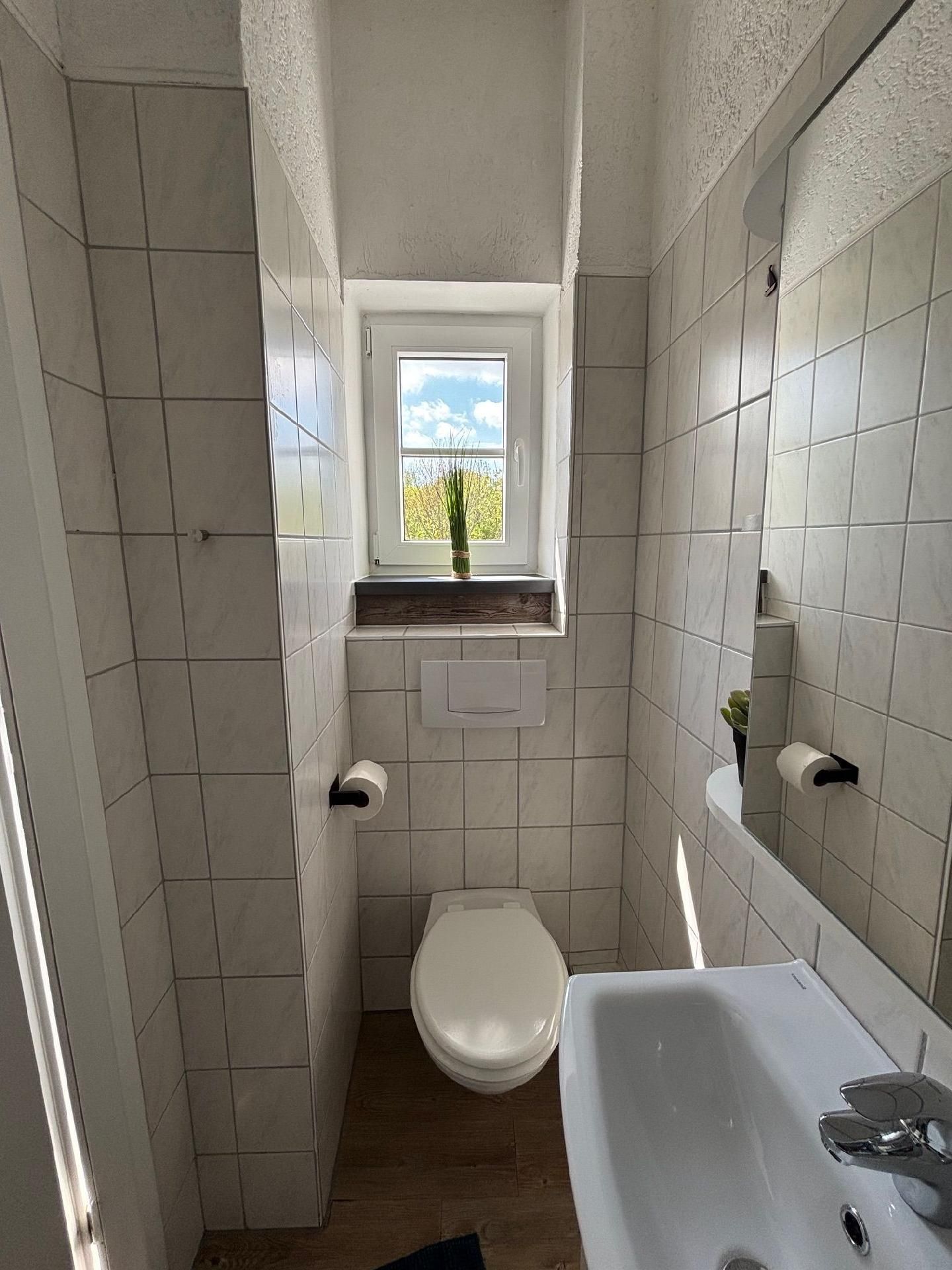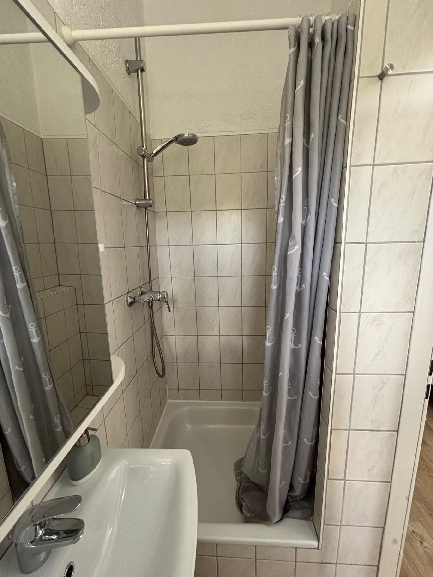 • Badezimmer: Kompaktes Bad mit Dusche; WC und Waschbecken.