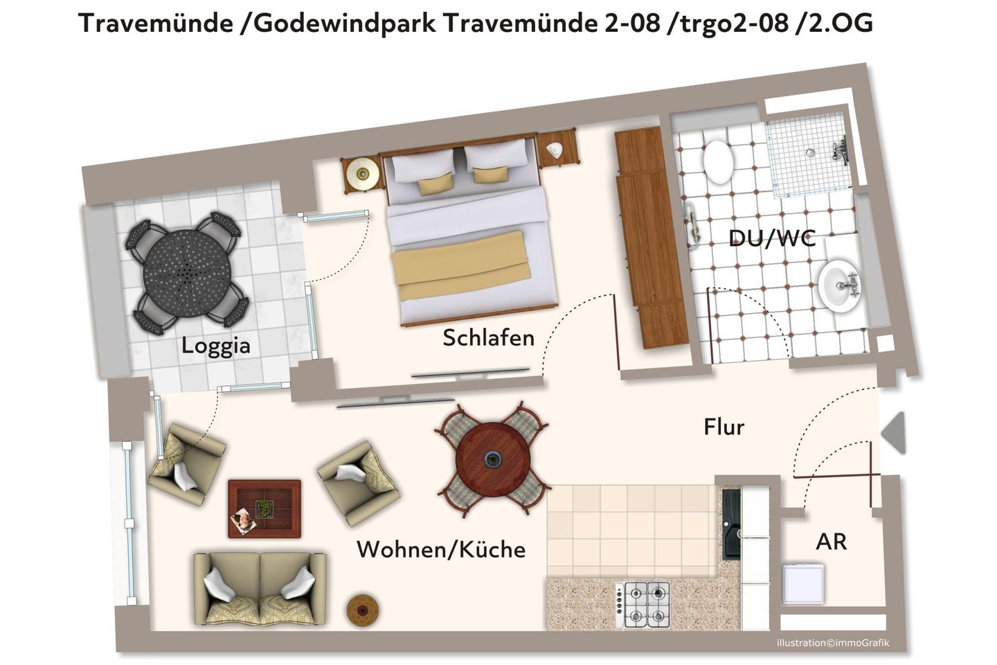 Das 44 m² große 2-Zimmer Apartment ist für bis zu 4 Personen geeignet. Besonders hervorzuheben ist die nach Osten gelegene, überdachte Loggia mit wundervollem Blick in den Godewindpark; hier könnt ihr bereits beim Frühstück die Sonne und das wohltuende Meeresklima genießen.