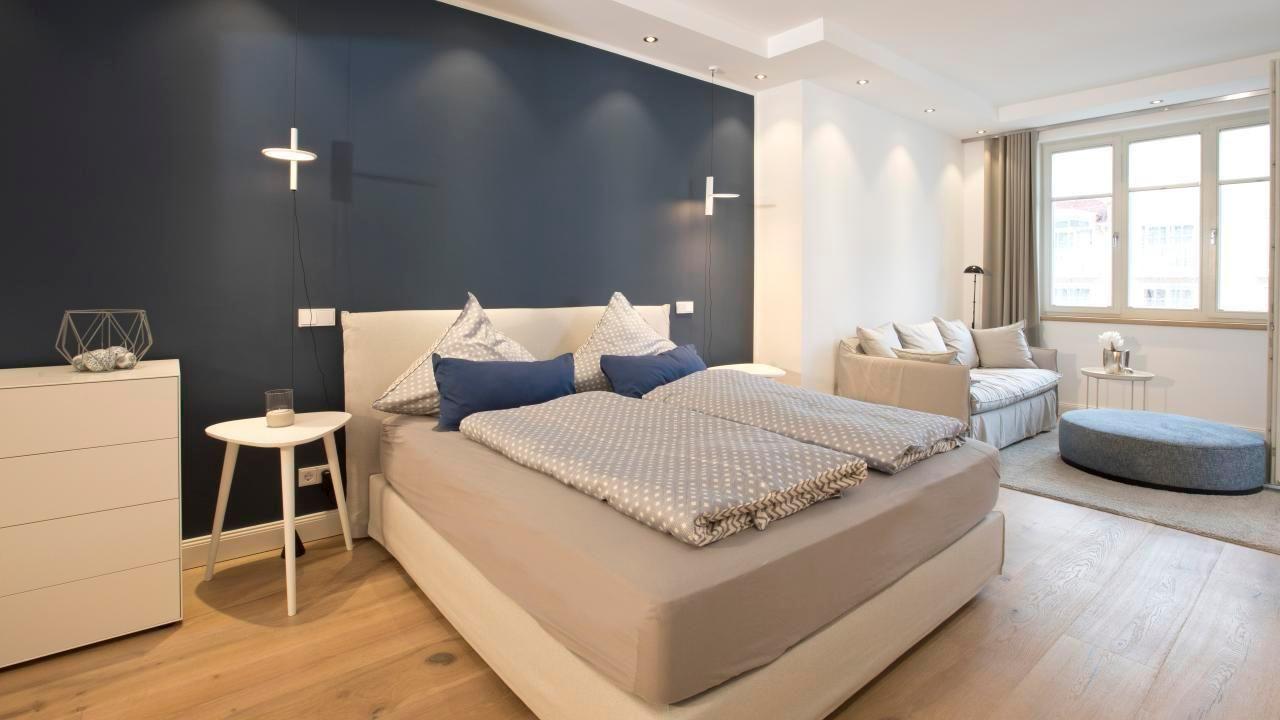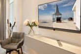Das Schlafzimmer mit kleiner Sofaecke und eingeschränktem Meerblick ist mit viel Liebe aufs Detail eingerichtet. Angefangen beim großen Desigener Boxspringebtt (180x200) mit Blicke auf den TV sowie der integrierten Sauna im Schlafzimmer. Das Sofa ist ausziehbar und bietet Platz für eine dritte Person.