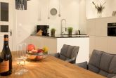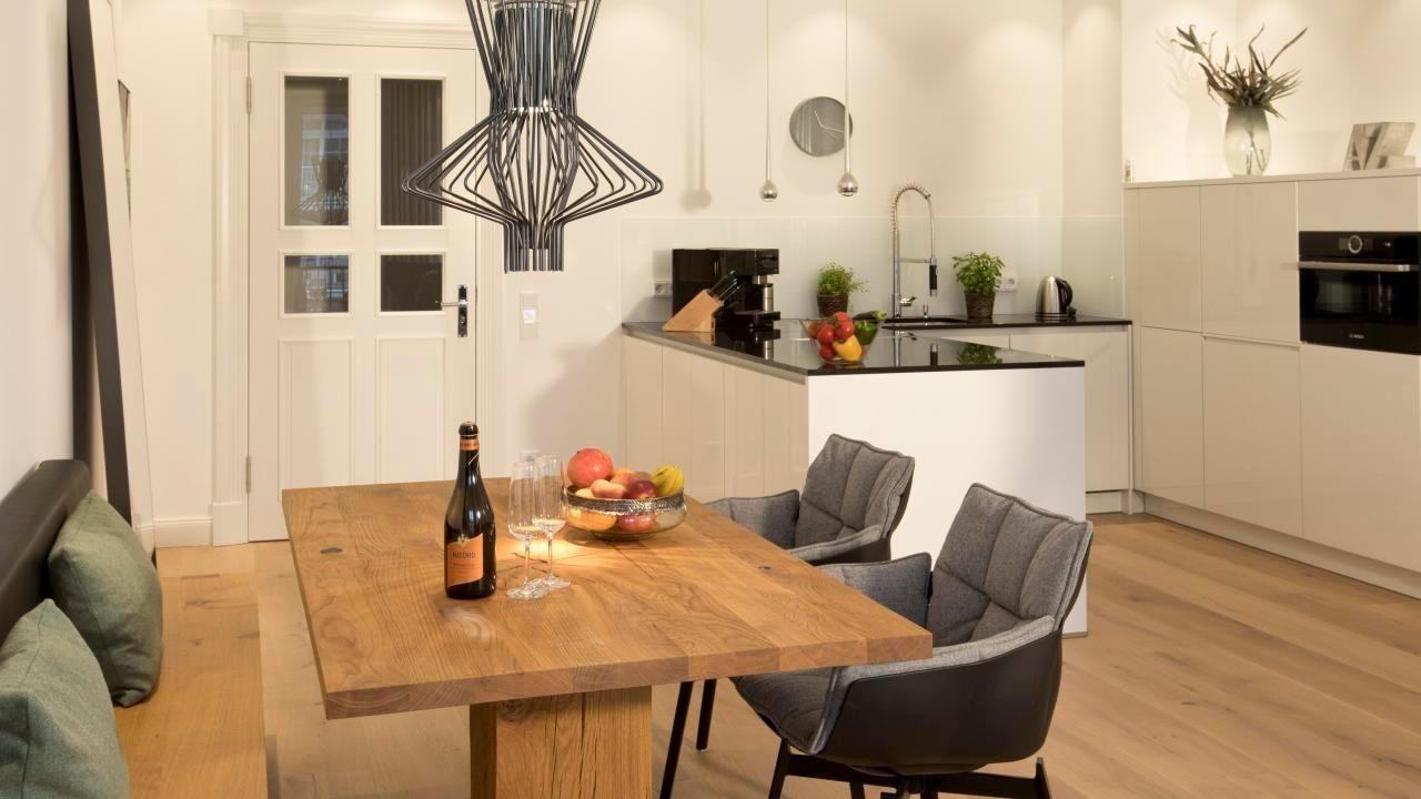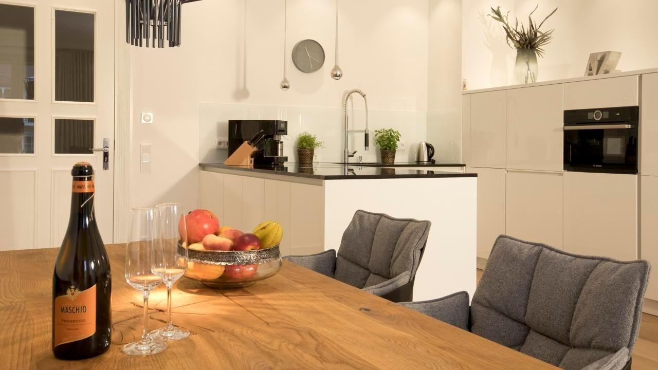 Die Küche mit Blick ins Wohnzimmer ist vollausgestattet und lädt zum Kochen im Urlaub auf Rügen ein. Angefangen beim großen Kühlschrank, Gefrierschrank, einem 4-Platten Induktionskochfeld, dem Miele Kaffeevollautomaten und vielem mehr was das Küchenherz begehrt. Der Esstisch mit zwei Stühlen und einer Sitzbank ist optimal für das Abendessen oder einen schönen Spielabend mit der Familie.